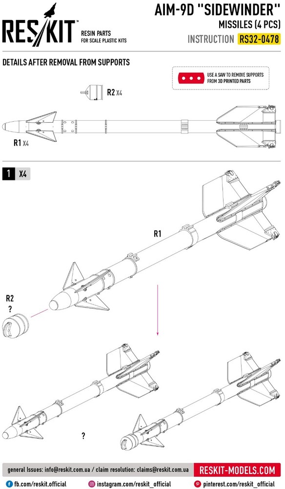 AIM-9D Sidewinder missiles 4pcs Scale1:32 ResKit RS32-0478 for Plastic Model Kit