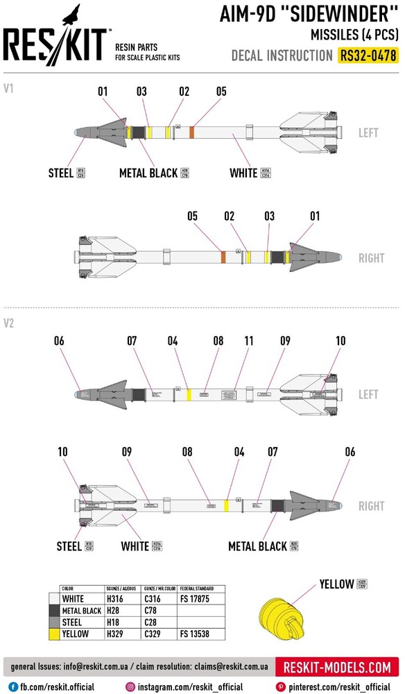 AIM-9D "Sidewinder" missiles (4 pcs) (A-4, A-6, A-7, F-4, F-8, F-100, F-104, F-105, Mirage III) (3D Printed) ResKit RS32-0478 - for Plastic Model Kit Enhance Your Scale Models with ResKit | High-Quality Resin & 3D-Printed Accessories RESKIT - Accessories for Scale Plastic Kits Upgrade your scale model collection with high-quality resin parts from ResKit. Our Ukrainian-made parts are meticulously crafted to provide the most accurate and detailed representation of original components. Whether you're building aircraft, helicopters, military vehicles, or figures, ResKit has the perfect parts to enhance your project. Scale: 1/32 Manufacturer: RESKIT (Accessories for Scale Plastic Kits) Country/Region of Manufacture : Ukraine Condition : New in Box Category: Resin & 3D accessories Type of equipment : Aircraft Type of product: Arms and weapons Recommended kit: Any AIM-9D "Sidewinder" missiles (4 pcs) for aircraft model: A-4 A-6 A-7 F-4 F-8 F-100 F-104 F-105 Mirage III ResKit is a Ukrainian manufacturer of high-quality resin parts and accessories for scale models . The products are distinguished by a high level of detail and accuracy, which allows modelers to create the most realistic models of military equipment, aviation and other objects. Key Features: Premium Quality: Our resin parts are made with the finest materials and precision engineering. Extreme Detail: Experience unparalleled detail and realism in your models. Wide Range: Choose from a vast selection of parts for various scales and subjects. Easy to Assemble: Our parts are designed for easy integration into your existing model kits. Superior quality! ResKit parts allow you to create a model with incredible detail. ---------------------------- >>> Visit our eBay store! <<< You will find everything you need at great prices. Scale model accessories are a wide range of parts, spares, and components that can help you make your model even more realistic and detailed. In our catalog, you will find everything you need to assemble and repair model cars, airplanes, ships, tanks, and weapons. Our accessories are made from high-quality materials and meet all standards. We offer a wide range of models and sizes so you can find what you need. Buy scale model accessories in our store and make your model even more unique!