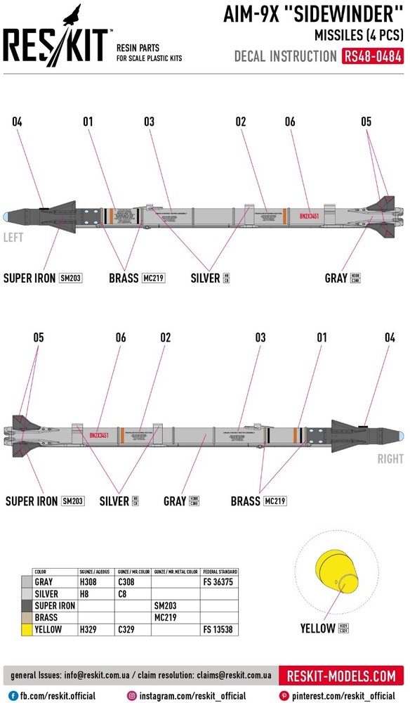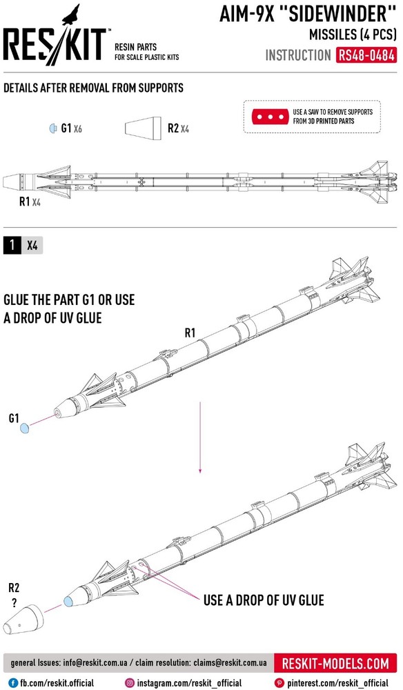 AIM-9X "Sidewinder" missiles (4 pcs) (F-15, F-16, F-18, F-35) (3D Printed) ResKit RS48-0484 - for Plastic Model Kit Enhance Your Scale Models with ResKit | High-Quality Resin & 3D-Printed Accessories RESKIT - Accessories for Scale Plastic Kits Upgrade your scale model collection with high-quality resin parts from ResKit. Our Ukrainian-made parts are meticulously crafted to provide the most accurate and detailed representation of original components. Whether you're building aircraft, helicopters, military vehicles, or figures, ResKit has the perfect parts to enhance your project. Scale: 1/48 Manufacturer: RESKIT (Accessories for Scale Plastic Kits) Country/Region of Manufacture : Ukraine Condition : New in Box Category: Resin & 3D accessories Type of equipment : Aircraft Type of product: Arms and weapons Recommended kit: Any AIM-9X "Sidewinder" missiles (4 pcs) for aircraft model kit: F-15 F-16 F-18 F-35 ResKit is a Ukrainian manufacturer of high-quality resin parts and accessories for scale models . The products are distinguished by a high level of detail and accuracy, which allows modelers to create the most realistic models of military equipment, aviation and other objects. Key Features: Premium Quality: Our resin parts are made with the finest materials and precision engineering. Extreme Detail: Experience unparalleled detail and realism in your models. Wide Range: Choose from a vast selection of parts for various scales and subjects. Easy to Assemble: Our parts are designed for easy integration into your existing model kits. Superior quality! ResKit parts allow you to create a model with incredible detail. ---------------------------- >>> Visit our eBay store! <<< You will find everything you need at great prices. Scale model accessories are a wide range of parts, spares, and components that can help you make your model even more realistic and detailed. In our catalog, you will find everything you need to assemble and repair model cars, airplanes, ships, tanks, and weapons. Our accessories are made from high-quality materials and meet all standards. We offer a wide range of models and sizes so you can find what you need. Buy scale model accessories in our store and make your model even more unique!