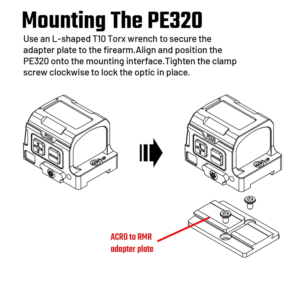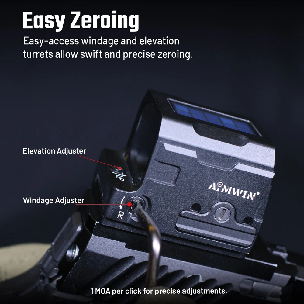 Enclosed Emitter Optic: The AIMWIN PE320 is a rugged enclosed red dot sight engineered for consistent performance in rain, dust, and harsh environments. This reflex sight features a crystal clear oversized window for faster target acquisition and a parallax free design that ensures pinpoint accuracy. The red dot optic emits a 650nm wavelength laser, delivering vivid visibility in any light condition. Built for tactical shooters, this durable optic offers unmatched clarity, stability, and speed 3 MOA Dot & 36 MOA Circle: Combining a precise 3 MOA center dot with a 36 MOA outer circle, this sight delivers faster target acquisition than standard micro optics. Switchable dot, circle, and circle-dot reticles adapt to both close-quarters speed and long-range precision. Built for reliability, the PE320 withstands 2000G shock without losing zero, while its sealed housing offers IPX7 waterproof and dustproof protection for consistent performance in rain, snow, dust, or harsh environments SolarGuard Dual Power Optics: This solar red dot optic features a dual power system combining a CR2032 battery with up to 50,000 hours of continuous runtime and an integrated SolarGuard panel that delivers sustainable power in daylight. The side load battery design allows quick and tool-free battery replacement without removing the sight from your firearm. Whether in training or duty, this long battery life red dot ensures you never run out of power when it matters most 11 Brightness Enclosed Red Dot: This solar red dot sight includes 11 adjustable brightness levels, 9 for daylight visibility and 2 for night vision compatibility, delivering clear aiming in any environment from low-light indoor shooting to direct sunlight. Equipped with Aim Awake motion-activated technology, the sight powers on instantly when movement is detected, ready instantly. Windage and elevation can be adjusted ±50 MOA each, giving a total 100 MOA travel range for precise zeroing. ACRO to RMR Adapter Red Dot Sight: This reflex red dot sight features an ACRO footprint and includes an ACRO to RMR adapter plate, allowing ACRO-style enclosed optics to be securely mounted on slides or plates with standard RMR cut patterns. It provides a simple upgrade path for pistols or rifles without changing the existing mounting system, ensuring wide compatibility across multiple platforms The AIMWIN PE320 Enclosed Sight is a rugged red dot optic with a 3 MOA dot and 36 MOA circle for fast and precise aiming. Its dual power system combines a SolarGuard panel and a CR2032 battery, delivering up to 50,000 hours of runtime with seamless automatic switching. The parallax-free wide window, Aim Awake motion activation, IPX7 waterproofing, and 2000G shock resistance make it ideal for demanding environments. Built for tactical use, this optic is always ready when you are. Features Multi-Reticle System:Switch between 3 MOA dot, 36 MOA circle, and circle-dot configurations to match different scenarios and personal shooting preferences. 11 Brightness Levels:Includes 9 daylight settings and 2 night vision modes for flawless clarity in any light condition. SolarGuard Power System:Combines a CR2032 coin battery with a solar panel for uninterrupted operation day or night. Aim Awake Motion Activation:Automatically powers on the optic when motion is detected for instant readiness. Parallax-Free & Large Viewing Window:The 24 × 20mm window offers a wide field of view with parallax-free precision. Built to Last:Constructed from hard-anodized 6061-T6 aluminum and tested for IPX7 waterproofing and 2000G impact resistance. Specifications Dot Size& Circle Size:3 MOA & 36 MOA Reticle Color:Red (650nm wavelength) Magnification:1× Parallax:Parallax-Free Brightness:11 Levels (9 Daylight + 2 Night Vision) Adjustment per Click:1 MOA Windage & Elevation Range:±50 MOA per axis (Total 100 MOA) Window Size:24.0mm × 20.0mm (0.94” × 0.79”) Material:6061-T6 Aluminum with Hard-Anodized Finish Footprint Compatibility:RMR to ACRO Adapter Plate Included Dimensions:45.3mm × 35.0mm × 31.2mm (1.78” × 1.38” × 1.2”) Weight:62g (2.19 oz) Waterproof Rating:IPX7 Shock Resistance:Rated to 2000G Operating Temperature:-30°C to 60°C (-22°F to 140°F) Accessories
