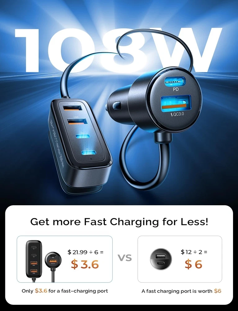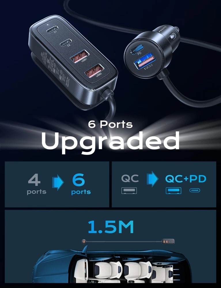 Store New Arrivals Add to Favorite View Feedback Contact AINOPE Car USB Charger Multi Port, 108W Fast USB C Car Charge PD 36W & QC3.0 Description Item model number 2E78 Manufacturer AINOPE Mounting Type Back Clip Color Black Brand AINOPE Connector Type USB Type C 3 PACK, USB Type A 3 PACK Compatible Devices Smartphones, Game Consoles, Tablets, Cameras, Smartwatches Item Weight 5.6 ounces Connectivity Technology USB Input Voltage 12 Volts Compatible Phone Models Google Pixel Special Feature Fast Charging Package Dimensions 6.1 x 4.33 x 1.46 inches Included Components car usb charger multi port 108W 6 port 【30mins Super Fast & 3 Type-C Ports】The 2024 latest upgrade Car USB charger Multi Port cigarette lighter USB charger has 3 PD3.0 Type C ports. Charging 3 devices simultaneously does not result in slow charging. The driver's side 36W USB car charger can charge your iPhone 14 from 0-80% in just 30 minutes. The backseat PPS 20W car charger USB-C can charge Samsung S24, S23, S22 from 0% to 80% in just 35 minutes, which is 5 times faster than a standard USB-C car adapter. It is suitable for all USB devices to meet super charging requirements. 【Upgraded 108W 6-Ports Car Charger】The 2024 upgraded fast charging USB car charger with 6 ports USB outputs includes 2 ports (36W USB-C + 18W USB-A) for the cigarette lighter adapter, providing PD 36W & QC 3.0 for the driver's side Car USB Charger Multi Port. Additionally, it features 4 ports (230W Type-C + 218W USB-A) with a 5FT extension coiled cable for back seat car charging. Designed for family and big group charging simultaneously, it powers up all devices in your car at once. It's the perfect car charger adapter for cars, SUVs, trucks, and all 12V~24V vehicles. 【6-Port for Family & Simultaneous Charging】AINOPE 6-port USB-C car charger fast charging is designed for family and big group charging simultaneously, powering up all devices in your car at once. The back clip is designed to help you hang or secure the car charger in the back seat pockets. Perfect for when you have kids in the backseat fighting over the Car USB Charger Multi Port! Everyone kept their electronics charged without fighting to share cords. 【Wide Compatibility】This car charger is compatible with all electronic devices, such as iPhone, Samsung Galaxy, Google Pixel, all smartphones, iPads, AirPods, wireless charger, Nintendo Switch, camera, and other equipment. Universal for 12-24V vehicles, it adapts to mainstream vehicle types such as cars, SUVs, trucks, RVs. 【Safe & Multiple Charging Protections】This Car USB Charger Multi Port is made of ABS&PC fireproof material, with a built-in intelligent chip that can automatically identify devices plugged in and distribute the optimal charging efficiency. It protects electronic devices from over-current, over-charging, over-heating, and short-circuiting. This multi-USB car charger with UL report has passed multiple safety tests, ensuring safety during the entire driving process. Car Travel Essentials for Long Trips:equipped with 6 charging ports, ensuring that all passengers in the vehicle have access to charging. Therefore, there will be no quarrels over charging ports. With this product, you can enjoy a peaceful car interior environment, even if you have three children, they can remain calm and quiet. Product Description AINOPE 6 Port USB Car Charger The Best Car Charger For Family & Friend Roadtrip Real Super fast charging for three devices simultaneously when using three USB-C ports at the same time Total Power rate up to 108W(1*36W Front USB-C, 2*30W Back USB-C) Brought peace to your family car rides, No fighting over who's turn it was to charge their phone 6 Ports Fast Charging Car Charger with 5FT Extension Cable iPhone Series iPhone16 Pro/iPhone 16 Pro Max/iPhone 16/ iPhone 16 Plus / iPhone15 Pro/iPhone 15 Pro Max/iPhone 15/ 14 Pro/iPhone 14 Pro Max/iPhone 14/iPhone 13/ iPhone 13 Pro Max/ iPhone 13 Pro/ iPhone 13 Mini/ iPhone 12 5G/ iPhone 12 Pro/ iPhone 12 Pro Max/ iPhone 12/ iPhone 12 Mini/ iPhone 11 Pro/ iPhone 11 Pro Max/ iPhone 11/ iPhone SE (2nd Gen)/ iPhone X/ XS/ iPhone XS Max/ iPhone XR/ iPhone 8 Plus/ 7 Plus/ iPhone 8/ 7/ iPhone 6 Plus/ 6s Plus/ iPhone 6 / 6s/ iPhone 5/ 5s / SE (1st Gen) Samsung Series Samsung Galaxy S24/ S23 / S22 5G/S21 5G/ S21+ 5G/ S21 Ultra 5G/ S20/ S20+/ S20 Ultra 5G/Z Fold 4/Z Flip 4/Z Fold 3/Z Flip 3/Note20/ Note20 5G/ Note20 Ultra 5G/ Note10/ Note10+/ S10/ S10+/ S10E/ S9/ S9+/ S8/ S8+/ Note 8/ S7/ S7 Edge/ S6/ S6 Edge/ S5/ S4/ A32 5G/ A70s/ A20s/ M30s/ M10s/ A90 5G/ A30s/ A50s Motorola Series Moto G Stylus 5G/Moto G/Moto G Power/Moto G71s/G82/G52/G22/E32/Moto Edge 30/30 Pro/X30/S30/Moto Tab G70/Moto G200 5G/G71 5G/G51 5G/G41/G31/mOTO e30/G Pure/E40/Tab G20/G60/E20/G 50 5G/Moto Edge/Edge 20 Fusion/Moto G60S/Moto Edge 20 Pro/Edge 20/Edge 20 Lite/Moto one 5G UW cae/Moto Defy/Moto G100/G50 Other Phone Google Pixel 9 / 8 / 7 / 6 pro/6/5/ 4A 5G/ 4A/ 4 XL/ 4/ 3a XL/ 3a/ 3 XL/ 3/ 2/ 2 XL/ XL, Google Nexus 6P / 6; TCL, Xiaomi, Lenovo, LG, HUAWEI, SONY, HTC, Xperia, Nokia Other Devices iPad/ MacBook/ Wireless Charger/ Nintendo Switch/ GPS/ Driving recorder/ Navigator/ Car Humidifier/ Car Vacuum Cleaner/ Bluetooth Speaker/ Headphones/ Kindle/ Tablets Parameters for the front seat 1* 36W USB-C Port ; 1* 18W USB-A Port Parameters for rear seats 2 * 36W USB-C Port ; 2 *18W USB-A ABOUT US We offer the best prices around on high quality products. Our E-store includes media such as books, movies, music and games while offering electronics, toys, sporting apparel, clothing, tools, general home, garden items and more. SHIPPING We are always working hard to ensure your package arrives as soon as possible. Please understand that some factors like weather, high postal traffic, and the performance of shipping companies are outside of our control. We offer free shipping to the lower 48 states and ship within 2 business days of payment, usually sooner. We do not accept P.O. Boxes. Please provide a phys