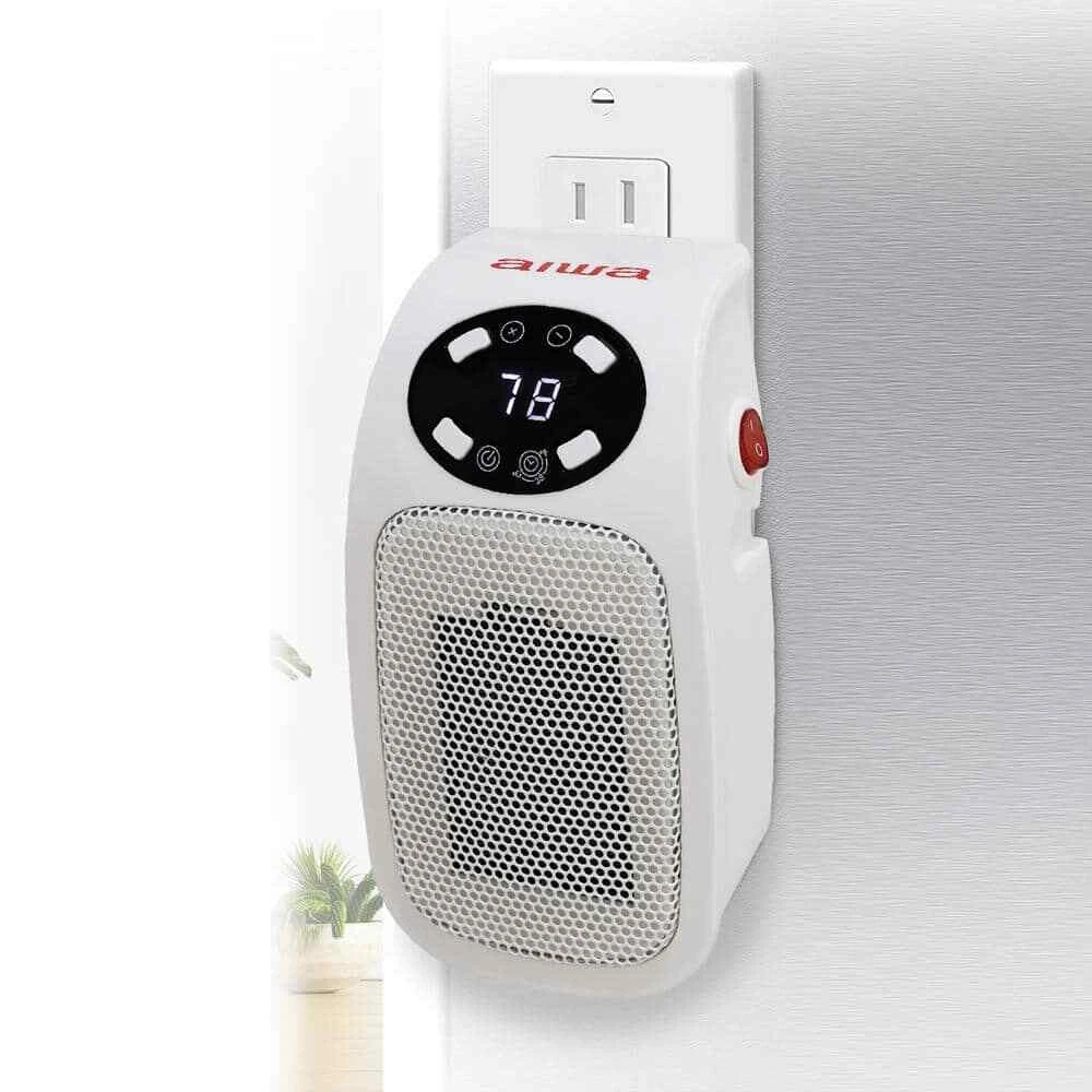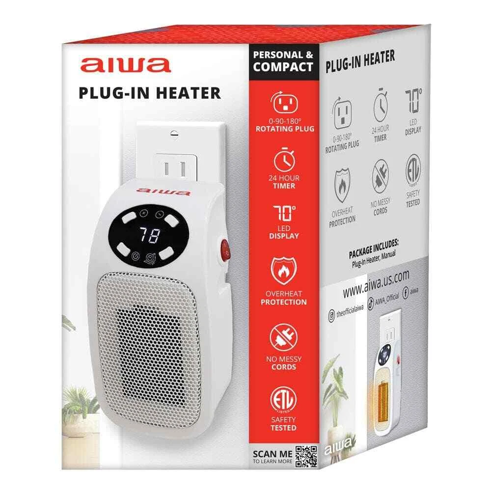 Electric space heater with adjustable temperature for convenience 24-hour timer ensures customized heating Convenient plug adapter rotates to fit most outlets The AIWA Outlet Plug-in electric space heater is perfect for to add warmth to any room. This heater is manufactured for indoor-use only and features Adjustable Temperature Control ranging up to 90°. The AIWA Outlet Plug-in Electric Space Heater warms up quickly to your desired setting and keeps you warm. With the AIWA Outlet Plug-in Electric Space Heater offers a timer mode up to 24-hours - this is the perfect heater for all-season use. The AIWA Outlet Plug-in Electric Space Heater's compact portable design means you can move it from room-to-room with ease. With the added safety features like, safety overheat protection, LED Display and ETL Certified Safety Certification you can rest easy and stay warm. 400-Watt with temperature up to 90° Plug adapter rotates to align with most outlets 0° minus 90° to 180° 24-hour timer Works with US AC outlets Overheat protection Digital adjustable thermostat