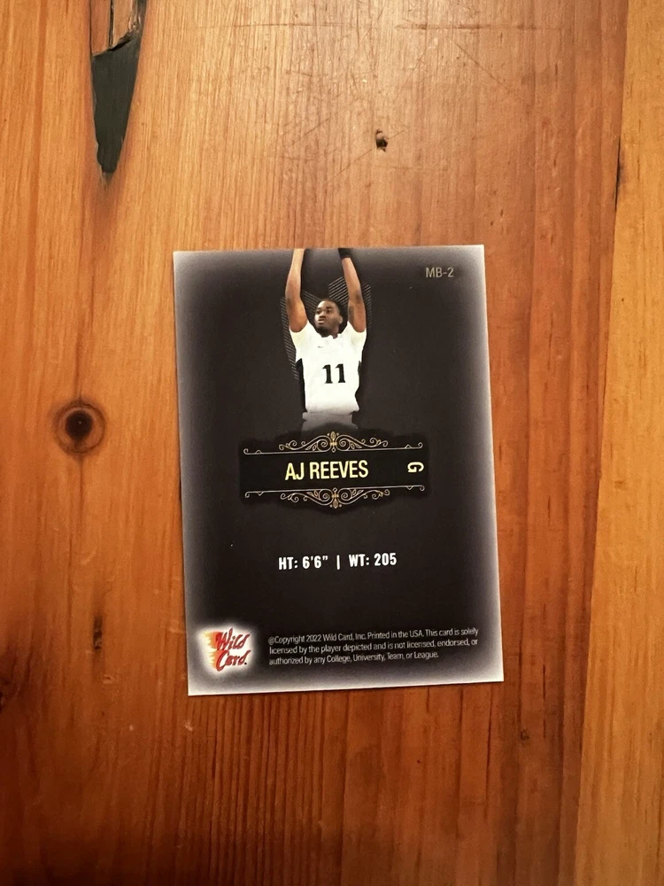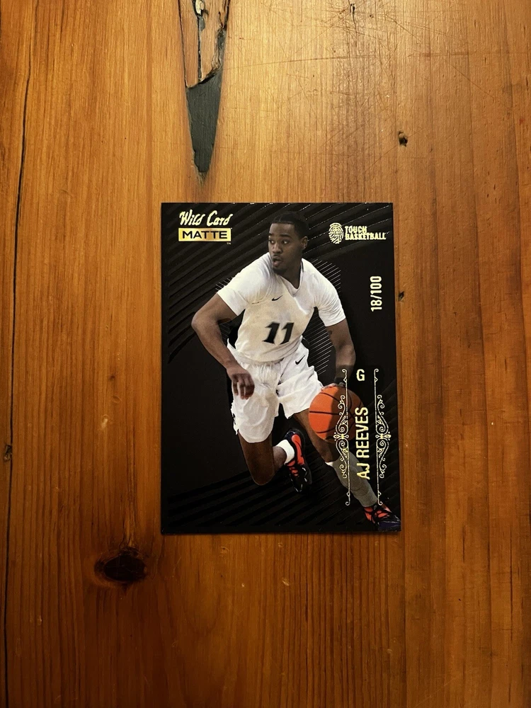 This is an AJ Reeves basketball trading card from the 2022-23 Wild Card Matte Draft set by Wild Card. The card is serial numbered 18/100, indicating it is a limited edition. It is in near mint or better condition and features a parallel/variety design. The card showcases AJ Reeves, likely in action on the basketball court, and is part of the National Basketball Association (NBA) league. This sports trading card is a collectible item for fans of basketball and card enthusiasts alike.
