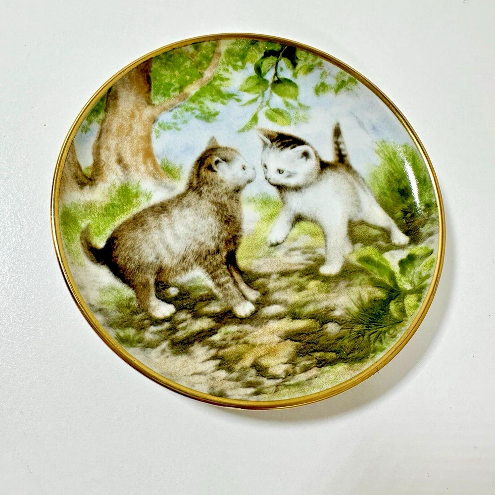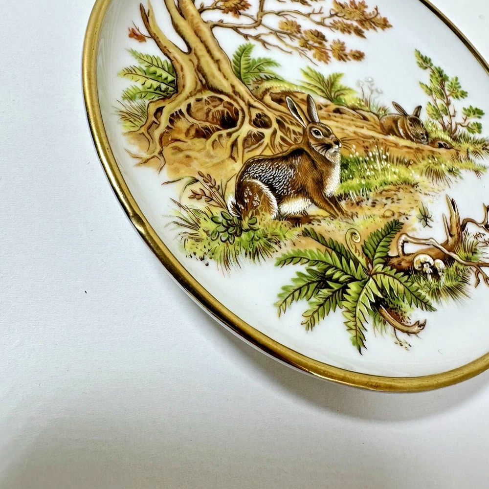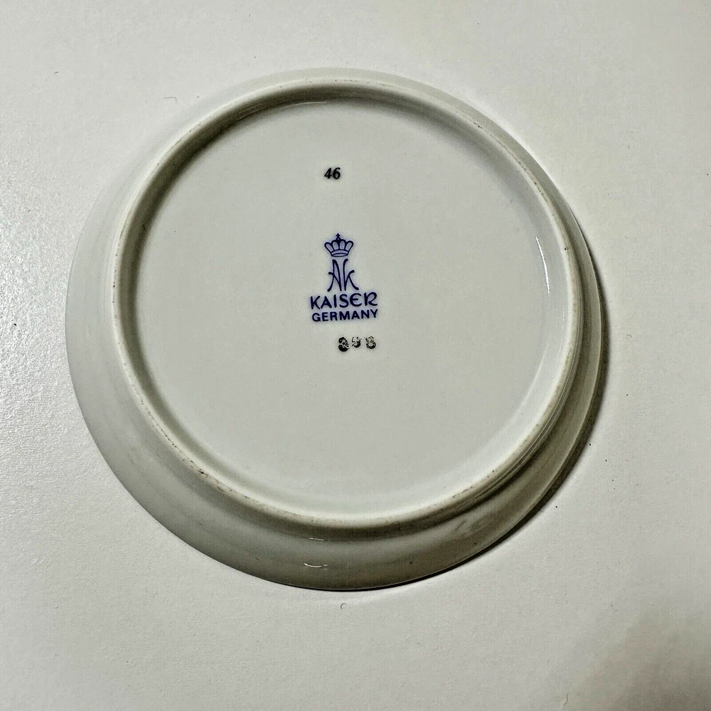 AK Kaiser Porcelain Trinket 4" Plates Coasters Germany Wildlife/Flowers Set Of 4 Pre-owned & overall in great used condition. One plate (rabbit plate) has a small dent in one side. See photos for close ups & measurements. Would make a great stocking stuffer! Ready to ship!