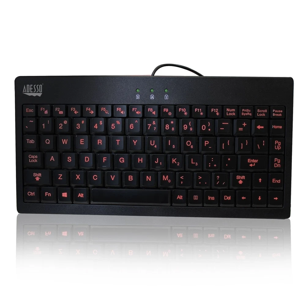 The AKB-110EB 3 Color Illuminated Mini Keyboard is the perfect for those who find themselves working late at night in dim or dark lighting environments. This keyboard features Illuminated backlit keys in 3 colors: Green, Blue and Red which can be accessed quickly and conveniently with a touch of a button. Dim, brighten or turn of the brightness of your backlit keys easily with the shift key. Measuring less than 12” wide, it is also ideal for POS stations, sales or information kiosks, warehouses or any small working environment. The AKB-110EB 3 Color Illuminated Mini Keyboard is designed with membrane key switches that provide a quieter and faster typing response and stand up to long-term usage Illuminated Backlit Keyboard allows you to work day and night, while easing eyestrain and helping you see the correct keys in any lighting environment; For business, the small footprint keyboard is perfect in dimly light showrooms, warehouses or offices 2X Size Large Print Keys: Large 2X bright white letters provide excellent contrast over traditional keyboards that have small white letters on black keys Compact Size: This keyboard is only 11;75" wide and is designed with a Windows Key layout that includes an embedded numeric keypad; This keyboard is a great space saver for your home or office Quiet Membrane Key Switches: Membrane key switches provide a better tactile response and a quitter typing experience; Plus they last up to five million keystrokes.Connectivity Technology: USB