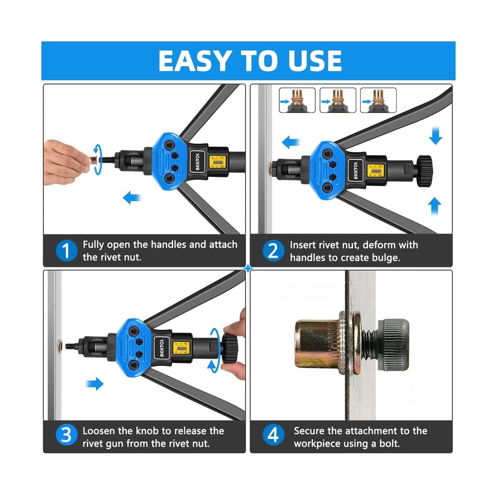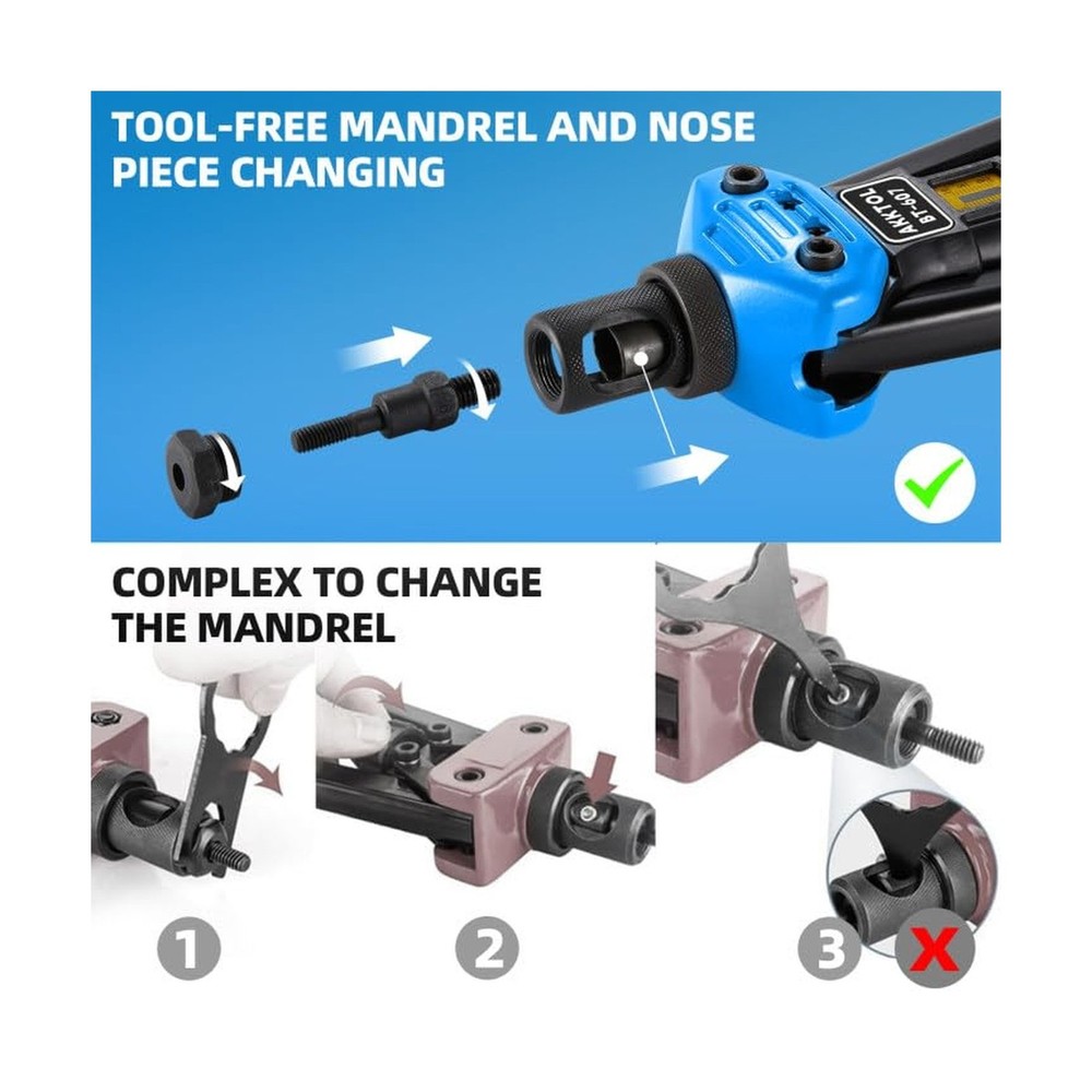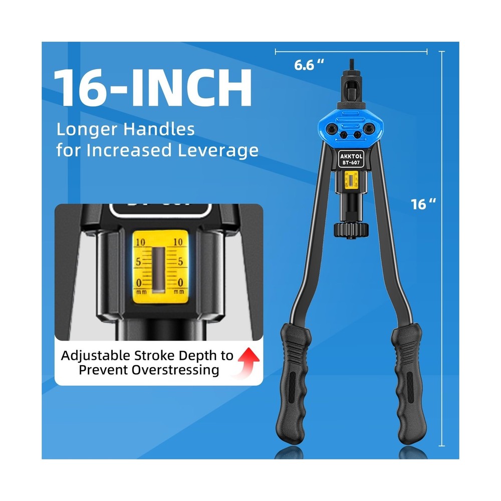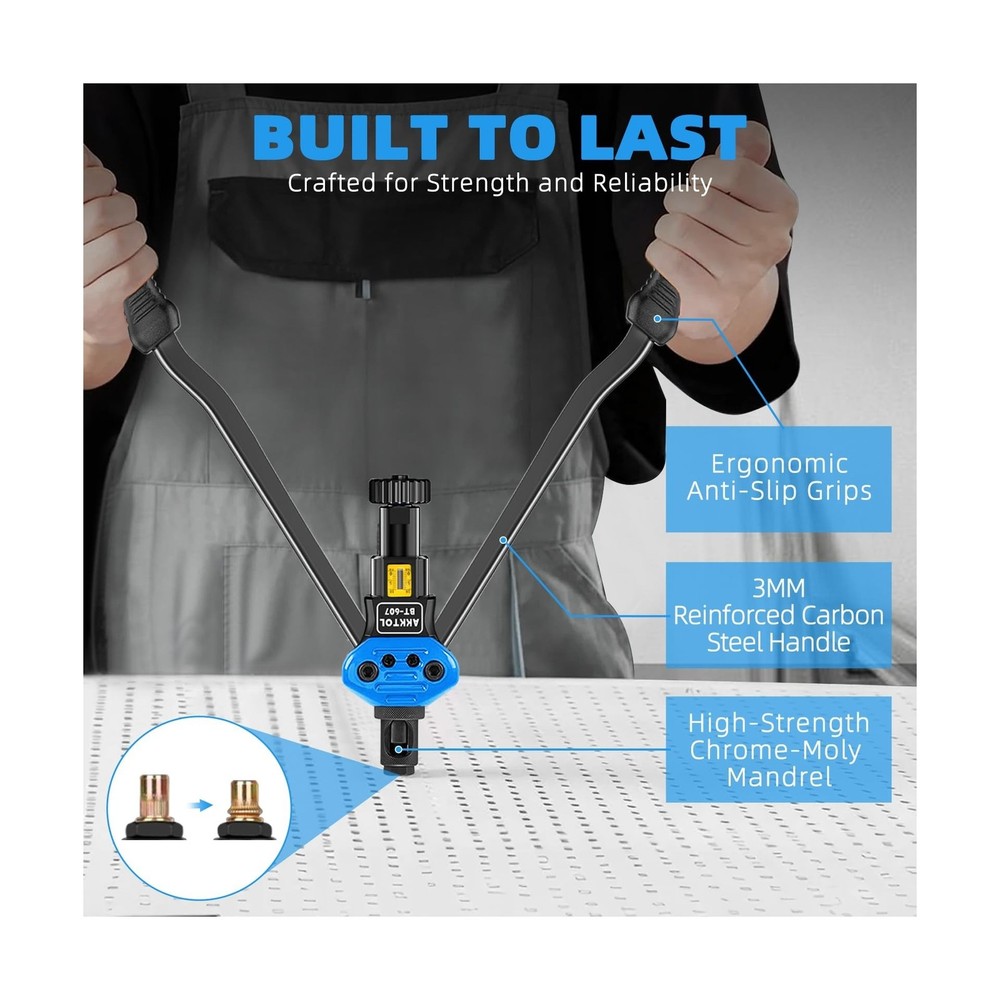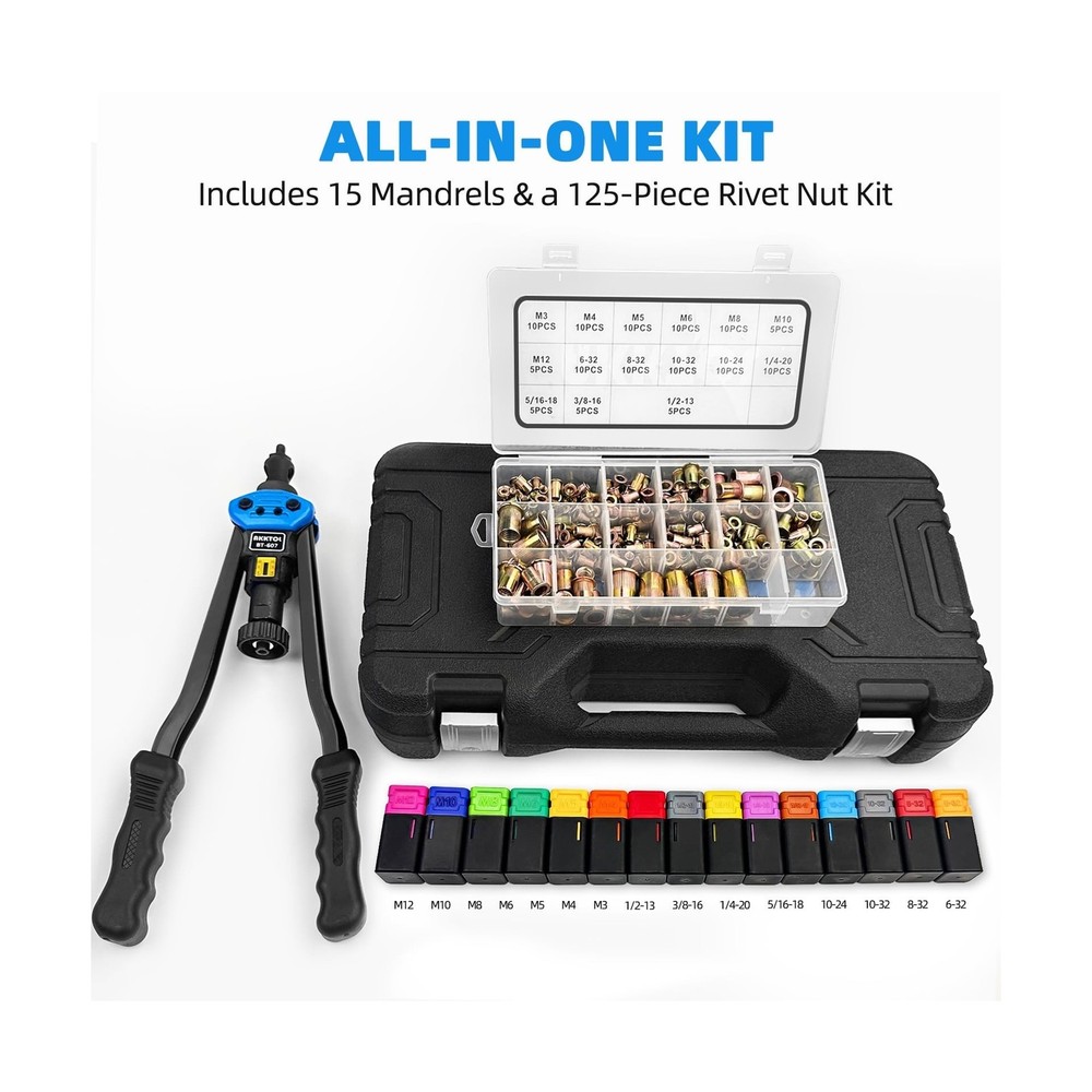 AKKTOL Rivet Nut Tool kit, 16" Rivnut Tool Kit with 15 Metric and SAE Mandrels, 125-PCS Rivet Nut Assortment Kit, Rugged Carrying Case, Ideal for Sheet Metal & Automotive Work Description Features: All-In-One Kit: Includes 15 Metric & SAE mandrels, 125-piece rivet nut assortment, a spanner, detailed user manual, and 2-year protection card all neatly packed in a rugged, well-organized carrying case. 16" Handles for Increased Leverage: The double-compound 16" design delivers up to 50% less effort than standard 14" tools perfect for installing large nutserts like M12 or 1/2"-13 in aluminum, steel, and stainless steel with ease. Easy to Use: The knurled head lets you quickly change mandrels and nosepieces without extra tools. The detailed manual ensures straightforward rivnut installation, making it perfect even for beginners. Sturdy and Durable: The AKKTOL 16-inch rivnut tool is constructed from 1.2-inch thick high-strength carbon steel, with heat treatment and black phosphating for enhanced corrosion resistance. Versatile Applications: With the widest selection of mandrels, this AKKTOL heavy-duty nutsert tool kit is a must-have tool for various applications such as metal fabrication and automotive work. Product Details: Manufacturer: AKKTOL Brand: AKKTOL Model: BT607 Item Weight: 8.56 pounds Product Dimensions: 17.4 x 9.61 x 4.03 inches Item model number: BT-607 Is Discontinued By Manufacturer: No Manufacturer Part Number: BT-607 Special Features: Stress/Tension Indicator, 16 Inches Long Handles Date First Available: November 3, 2021 Delivery We Do Not Ship Outside of the Continental US. Return Policy All items qualify for returns within 30 days of receipt. Seller is responsible for return shipping on any item that is not damaged. Feedback We take our reputation seriously, we buy and sell online, so we understand the value of trust. If you are unsatisfied with your order, please contact us and we will work with you to resolve it to your satisfaction.