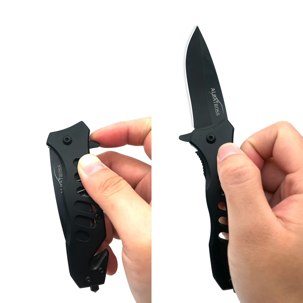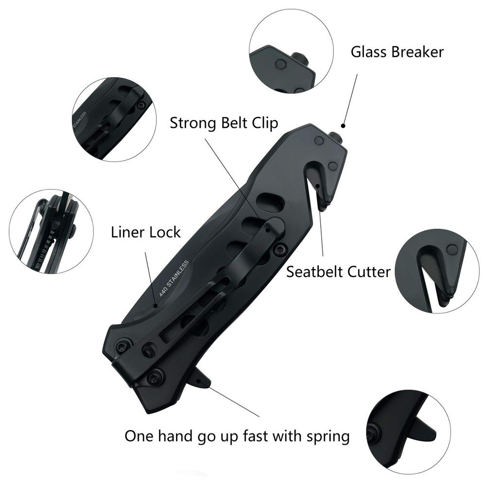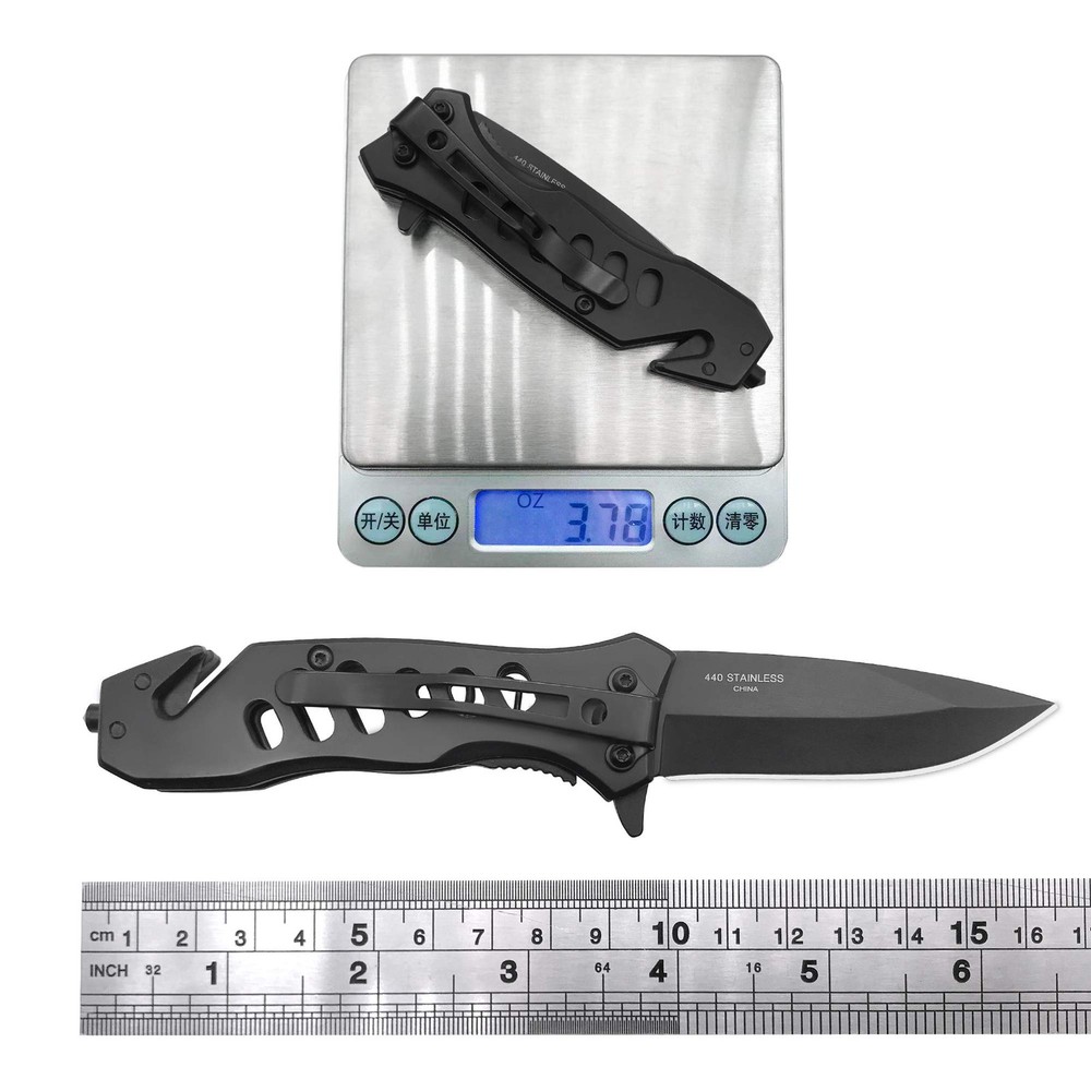 Spring assisted pocket knife offers rapid one-handed deployment, you can open it by the flipper on the handle. NOTE:The grease on the knife is anti-corrosive grease, which allows you to open the knife more smoothly, and prevent the knife from rusting,this is not a used trace. 440 stainless steel,Sharp and reliable; 2.7-inch blade length; 3.8-inch closed length; 6.5-inch total length A pocket clip for easy and safe carry; includes Seatbelt Cutter and glass breaker,weight only 4.8 OZ Seamlessly used for Daily application、Camping to Search & Rescue and is a great Business or Birthday Gift