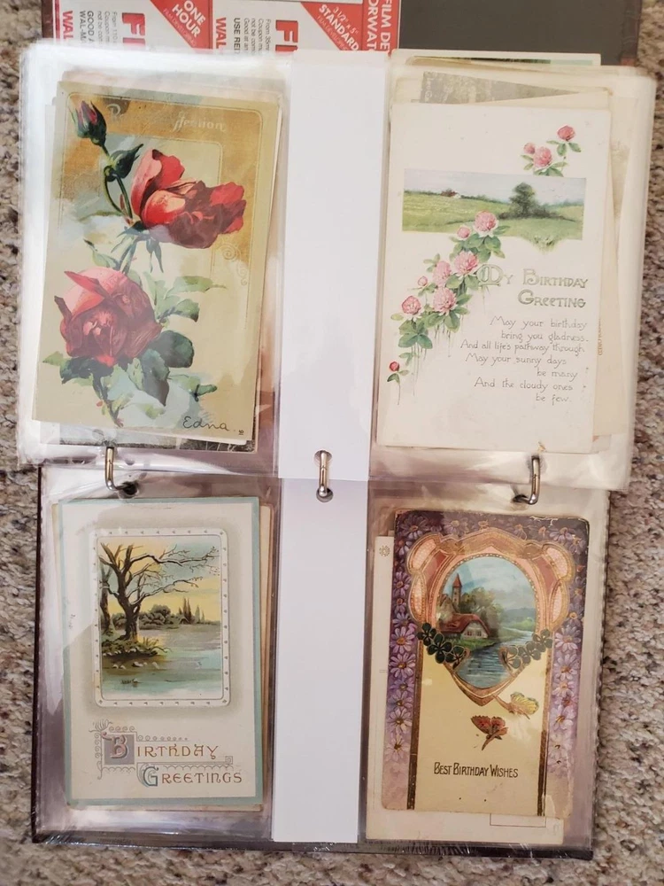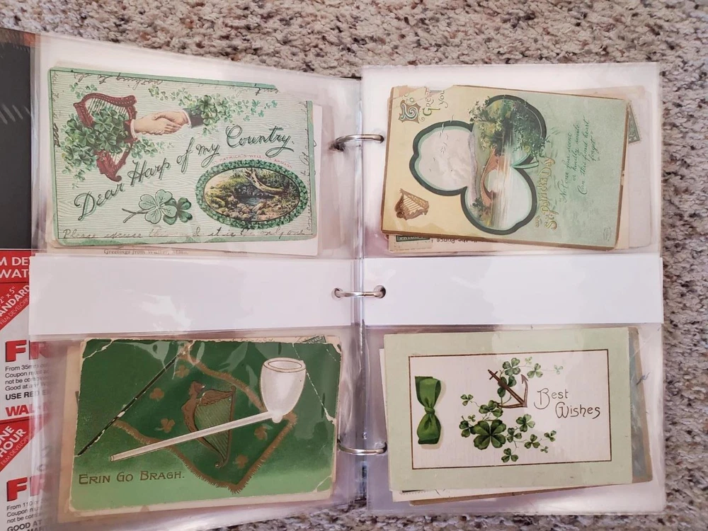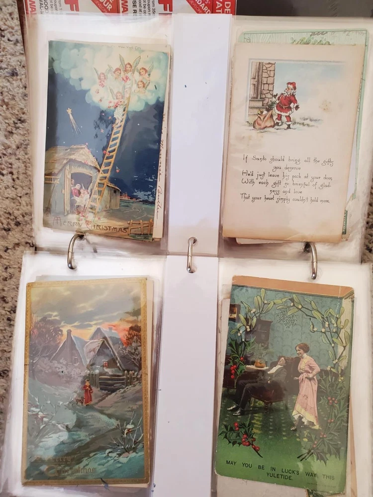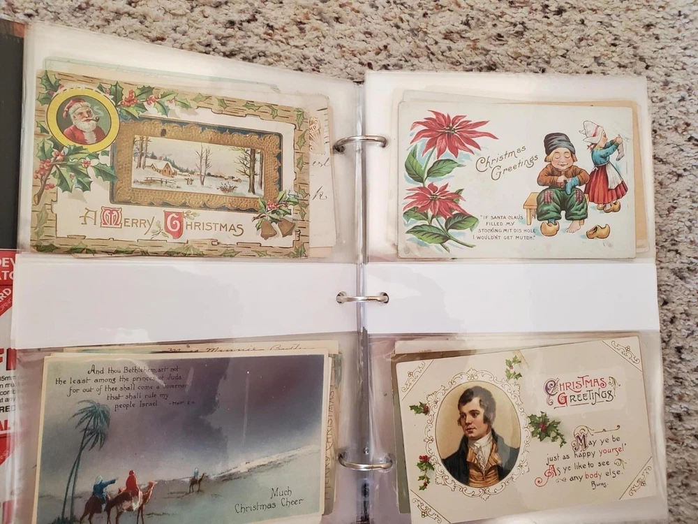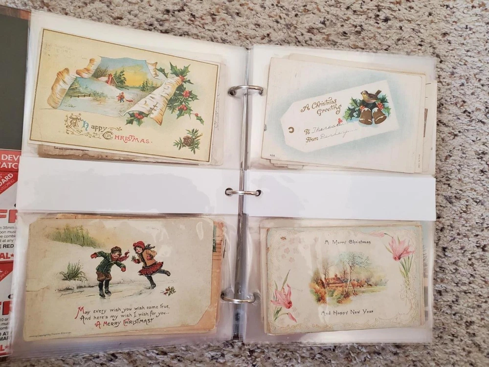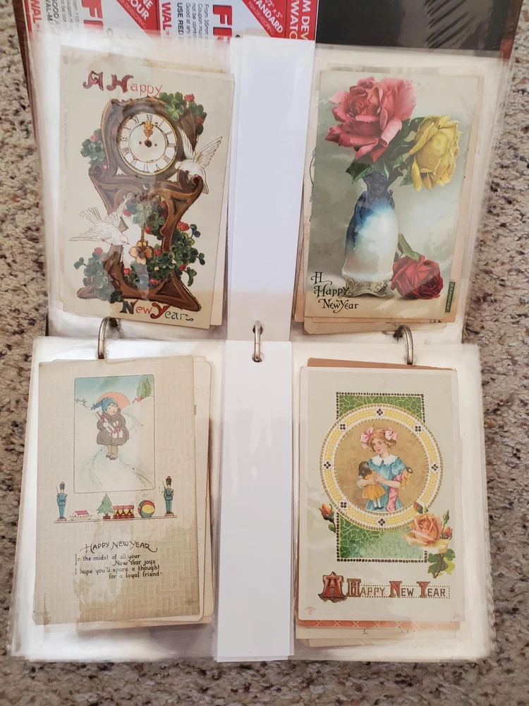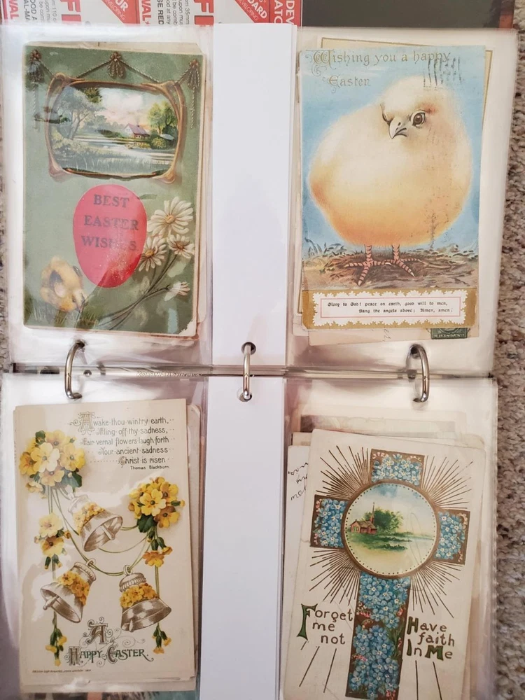 Up for bid is a wonderful 3-ring binder postcard album. The album itself was used to store and display vintage postcards by it's previous owner. The estimated age of the postcards it contains goes back to the 1910's to early 1920's. The 49 4-pocket acid-free plastic pages of this nearly-new album are filled with antique postcards on the front and back of each page, for a total of about 192 of them. There's is a mix of vintage quality holiday postcards including Halloween postcards and several Santa postcards. You'll also find some St. Patrick's Day, Valentine's Day, New Year, Christmas, Patriotic, Easter, Birthday, Friendship and Thanksgiving cards. There are some comic and romance postcards included as well. In addition, you'll find some fine view postcards from various locations, and some of them are real photo postcards. (see the supersized images that show a sampling of what comes with this auction). After looking over the pictures I've included I'm sure you'll agree that these postcards and the album are worth your bid. Here's a great find for the dealer or the collector. Some lucky bidder will walk away with it...will it be you? ALBUM & COLLECTION Of 190 Vintage POSTCARDS--HALLOWEEN, SANTAS, HOLIDAY, MORE ALBUM & COLLECTION Of 190 Vintage POSTCARDS--HALLOWEEN, SANTAS, HOLIDAY, MORE Click images to enlarge Description CHRYSTAL CITY CARDS PAPER ANTIQUES & COLLECTIBLES “Where Memories Are Chrystal Clear” rlaguardia, ebay member since January 2000 We are selling off a large collection of WONDERFUL VINTAGE POSTCARDS. CHECK OUT OUR OTHER AUCTIONS AND STORE ITEMS FOR MORE! Up for bid is a wonderful 3-ring binder postcard album. The album itself was used to store and display vintage postcards by it's previous owner. The estimated age of the postcards it contains goes back to the 1910's to early 1920's. The 49 4-pocket acid-free plastic pages of this album are filled with antique postcards on the front and back of each page, for a total of about 192 of them. There's is a mix of vintage quality holiday postcards including Halloween postcards and several Santa postcards. You'll also find some St. Patrick's Day, Valentine's Day, New Year, Christmas, Patriotic, Easter, Birthday, Friendship and Thanksgiving cards. There are some comic and romance postcards included in as well. In addition, you'll find some fine view postcards from various locations, some of them are real photo postcards. (see the supersized images that show a sampling of what comes with this auction). After looking over the pictures I've included I'm sure you'll agree that these postcards and the album are worth your bid. Here's a great find for the dealer or the collector. Some lucky bidder will walk away with it...will it be you? CONDITION CONDITION : The album itself is in very good condition. The front and back covers show very little wear, and the binding is holding the 49 acid-free plastic pages firmly. The postcards contained in the album are in good-to-very good vintage condition, with a few visible creases, stains and rips, handwriting here and there. This album and it's antique contents are in very good condition and must be seen in person to appreciate. A PICTURE IS WORTH A THOUSAND WORDS! It’s an important part of the item description. Viewing the supersized images is like looking at an item under a magnifying glass. Before you bid, supersize the images and study them carefully . AFTER YOU WIN Expected Payment : Payment to be received within 7 days after close of auction. Buyer pays S&H. Communication : The winner will receive an invoice requesting payment within one business day after the auction ends. After payment has cleared, an Email will be sent to inform the winner that the album has been shipped. A copy of the invoice will accompany the shipment. CAREFUL Packaging : The album will be carefully packed in a sturdy medium-sized USPS priority mail box for maximum protection. FAST Shipping : Items are shipped the next business day, via USPS priority mail, after payment clears. Tracking will be added to domestic shipments. SORRY—NO SHIPMENTS OUTSIDE THE U.S. ON THIS AUCTION. Contact us if you have any questions. Be sure to visit my other auctions and eBay Store where you’ll find a wide variety of vintage postcards. Check my feedback and bid with confidence. Good luck! Images sell! Get Supersized Images & Free Image Hosting Create your brand with Auctiva's Customizable Templates. Attention Sellers - Get Templates Image Hosting, Scheduling at Auctiva.com. Track Page Views With Auctiva's Counter