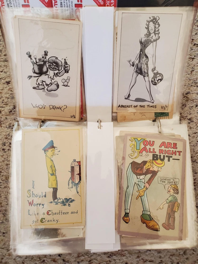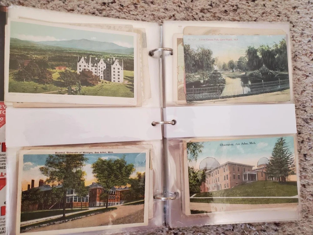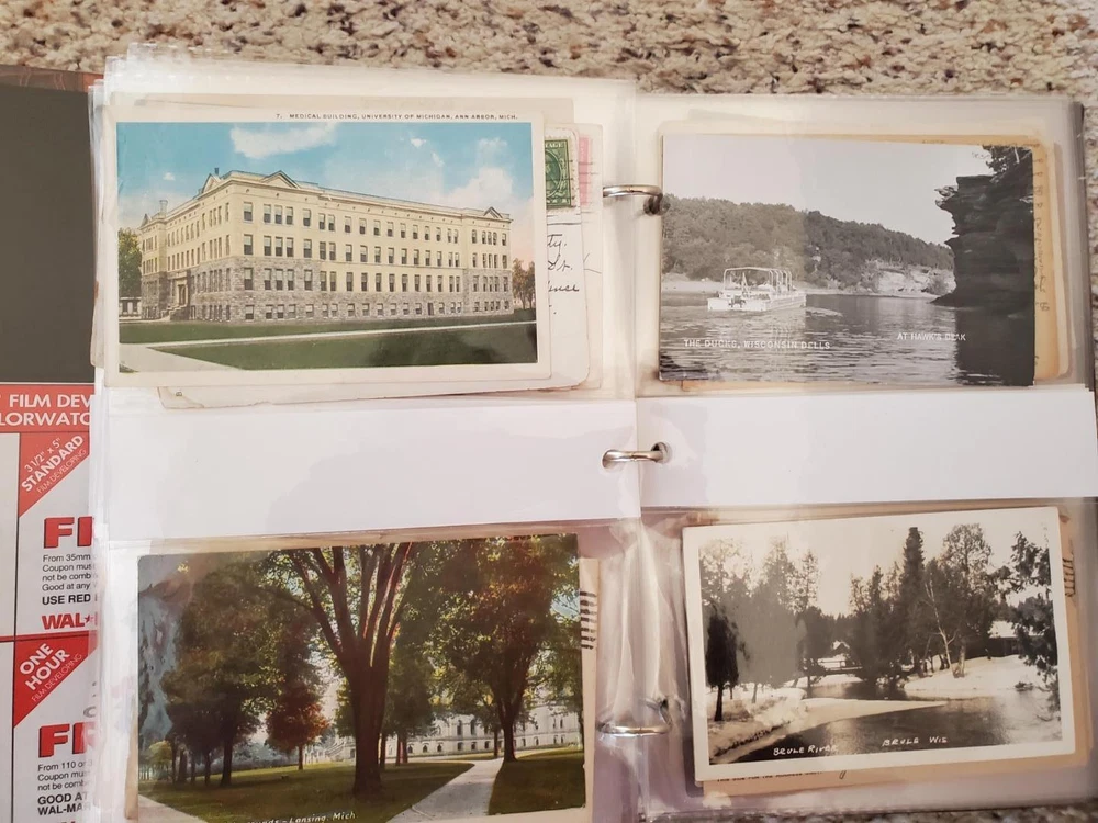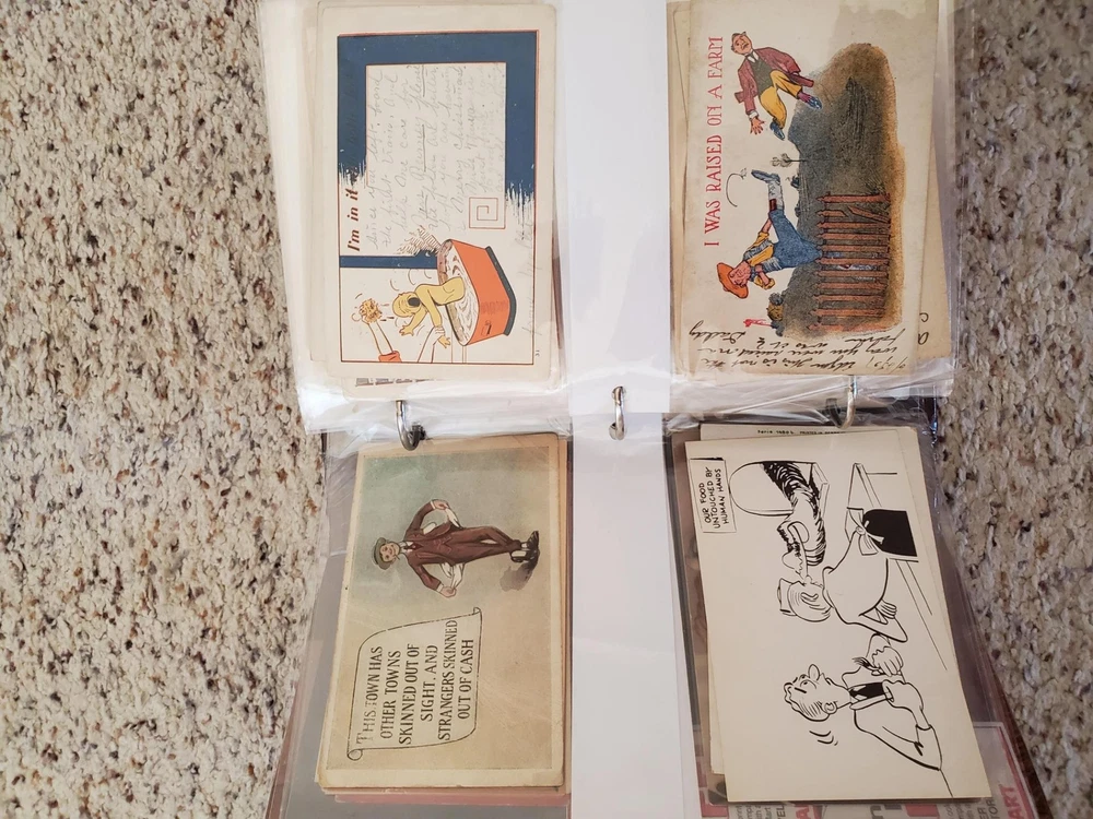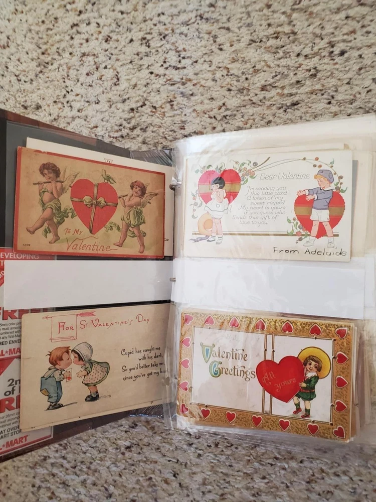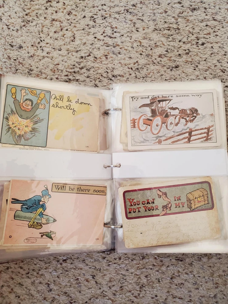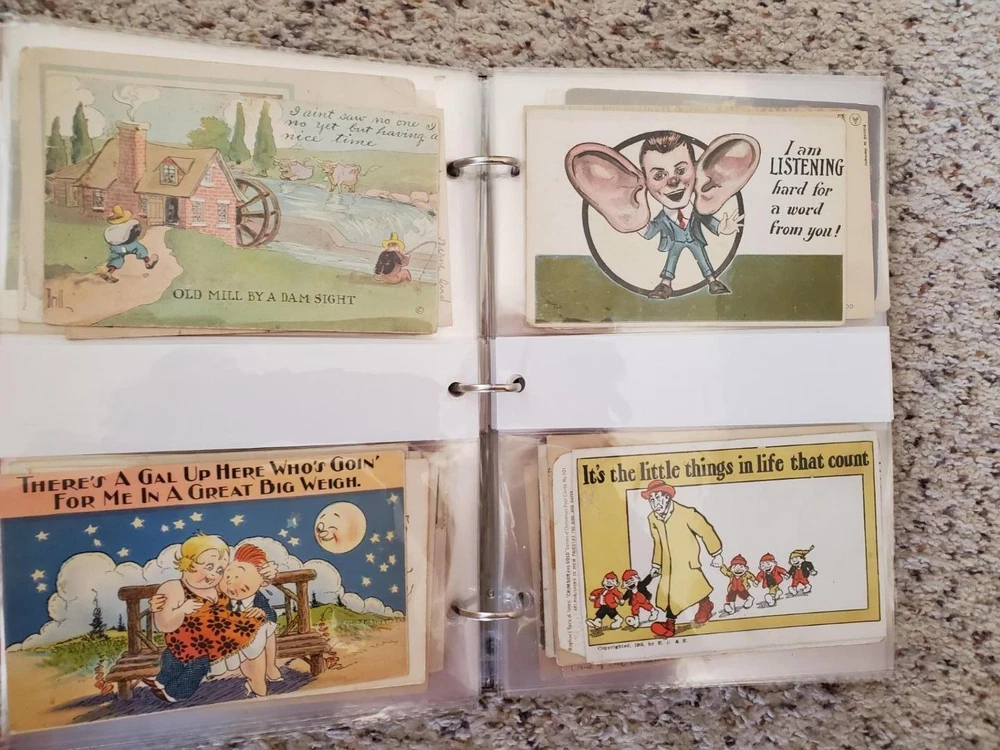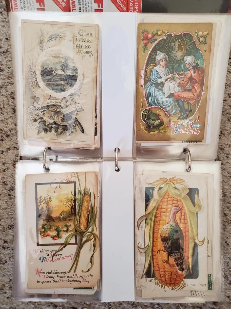 Up for bid is a wonderful 3-ring binder postcard album. The album itself was used to store and display vintage postcards by it's previous owner. The estimated age of the postcards it contains goes back to the 1910's to early 1920's. The 49 4-pocket acid-free plastic pages of this nearly-new album are filled with antique postcards on the front and back of each page, for a total of about 192 of them. There's is a mix of vintage quality holiday postcards including Halloween postcards and several Santa postcards. You'll also find some St. Patrick's Day, Valentine's Day, New Year, Christmas, Patriotic, Easter, Birthday, Friendship and Thanksgiving cards. There are some comic and romance postcards included as well. In addition, you'll find some fine view postcards from various locations, and some of them are real photo postcards. (see the supersized images that show a sampling of what comes with this auction). After looking over the pictures I've included I'm sure you'll agree that these postcards and the album are worth your bid. Here's a great find for the dealer or the collector. Some lucky bidder will walk away with it...will it be you? ALBUM & COLLECTION Of 190 Vintage POSTCARDS--HALLOWEEN, SANTAS, HOLIDAY, MORE ALBUM & COLLECTION Of 190 Vintage POSTCARDS--HALLOWEEN, SANTAS, HOLIDAY, MORE Click images to enlarge Description CHRYSTAL CITY CARDS PAPER ANTIQUES & COLLECTIBLES “Where Memories Are Chrystal Clear” rlaguardia, ebay member since January 2000 We are selling off a large collection of WONDERFUL VINTAGE POSTCARDS. CHECK OUT OUR OTHER AUCTIONS AND STORE ITEMS FOR MORE! Up for bid is a wonderful 3-ring binder postcard album. The album itself was used to store and display vintage postcards by it's previous owner. The estimated age of the postcards it contains goes back to the 1910's to early 1920's. The 49 4-pocket acid-free plastic pages of this album are filled with antique postcards on the front and back of each page, for a total of about 192 of them. There's is a mix of vintage quality holiday postcards including Halloween postcards and several Santa postcards. You'll also find some St. Patrick's Day, Valentine's Day, New Year, Christmas, Patriotic, Easter, Birthday, Friendship and Thanksgiving cards. There are some comic and romance postcards included in as well. In addition, you'll find some fine view postcards from various locations, some of them are real photo postcards. (see the supersized images that show a sampling of what comes with this auction). After looking over the pictures I've included I'm sure you'll agree that these postcards and the album are worth your bid. Here's a great find for the dealer or the collector. Some lucky bidder will walk away with it...will it be you? CONDITION CONDITION : The album itself is in very good condition. The front and back covers show very little wear, and the binding is holding the 49 acid-free plastic pages firmly. The postcards contained in the album are in good-to-very good vintage condition, with a few visible creases, stains and rips, handwriting here and there. This album and it's antique contents are in very good condition and must be seen in person to appreciate. A PICTURE IS WORTH A THOUSAND WORDS! It’s an important part of the item description. Viewing the supersized images is like looking at an item under a magnifying glass. Before you bid, supersize the images and study them carefully . AFTER YOU WIN Expected Payment : Payment to be received within 7 days after close of auction. Buyer pays S&H. Communication : The winner will receive an invoice requesting payment within one business day after the auction ends. After payment has cleared, an Email will be sent to inform the winner that the album has been shipped. A copy of the invoice will accompany the shipment. CAREFUL Packaging : The album will be carefully packed in a sturdy medium-sized USPS priority mail box for maximum protection. FAST Shipping : Items are shipped the next business day, via USPS priority mail, after payment clears. Tracking will be added to domestic shipments. SORRY—NO SHIPMENTS OUTSIDE THE U.S. ON THIS AUCTION. Contact us if you have any questions. Be sure to visit my other auctions and eBay Store where you’ll find a wide variety of vintage postcards. Check my feedback and bid with confidence. Good luck! Images sell! Get Supersized Images & Free Image Hosting Create your brand with Auctiva's Customizable Templates. Attention Sellers - Get Templates Image Hosting, Scheduling at Auctiva.com. Track Page Views With Auctiva's Counter