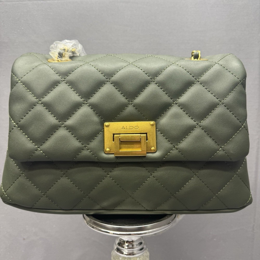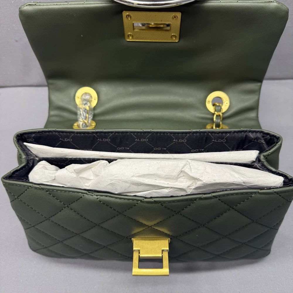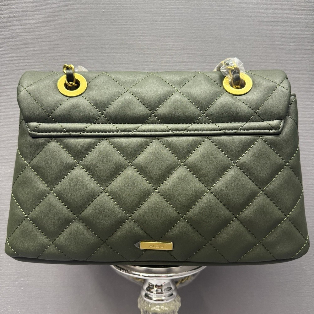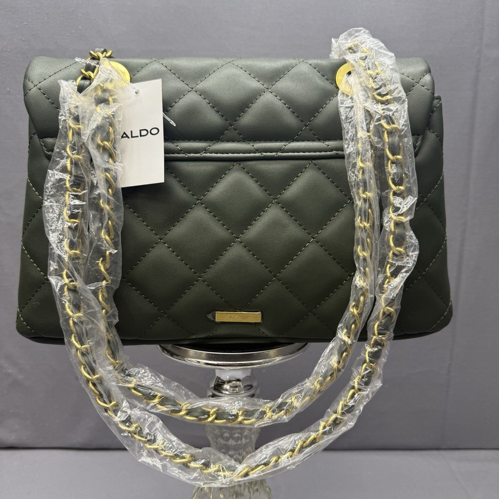 ALDO Olive Green Quilted Shoulder Bag with Gold Chain Strap Stylish ALDO quilted handbag in a rich olive green color featuring gold-tone hardware and a classic chain strap. This bag is brand new with original tags attached, and the chain straps are still wrapped in protective plastic. Features: • Authentic ALDO handbag • Quilted faux leather exterior • Olive green color • Gold-tone turn-lock front closure • Gold chain shoulder strap (protected in plastic) • Structured silhouette • Fully lined interior with branding Condition Details: • New with tags • Never used • No stains, scuffs, or odors • Hardware and stitching in excellent condition • Please review all photos for exact item and condition Perfect For: • Everyday wear • Evening or dressy outfits • Gift giving 📸 Photos show the exact item you will receive. Ships fast and securely packaged.