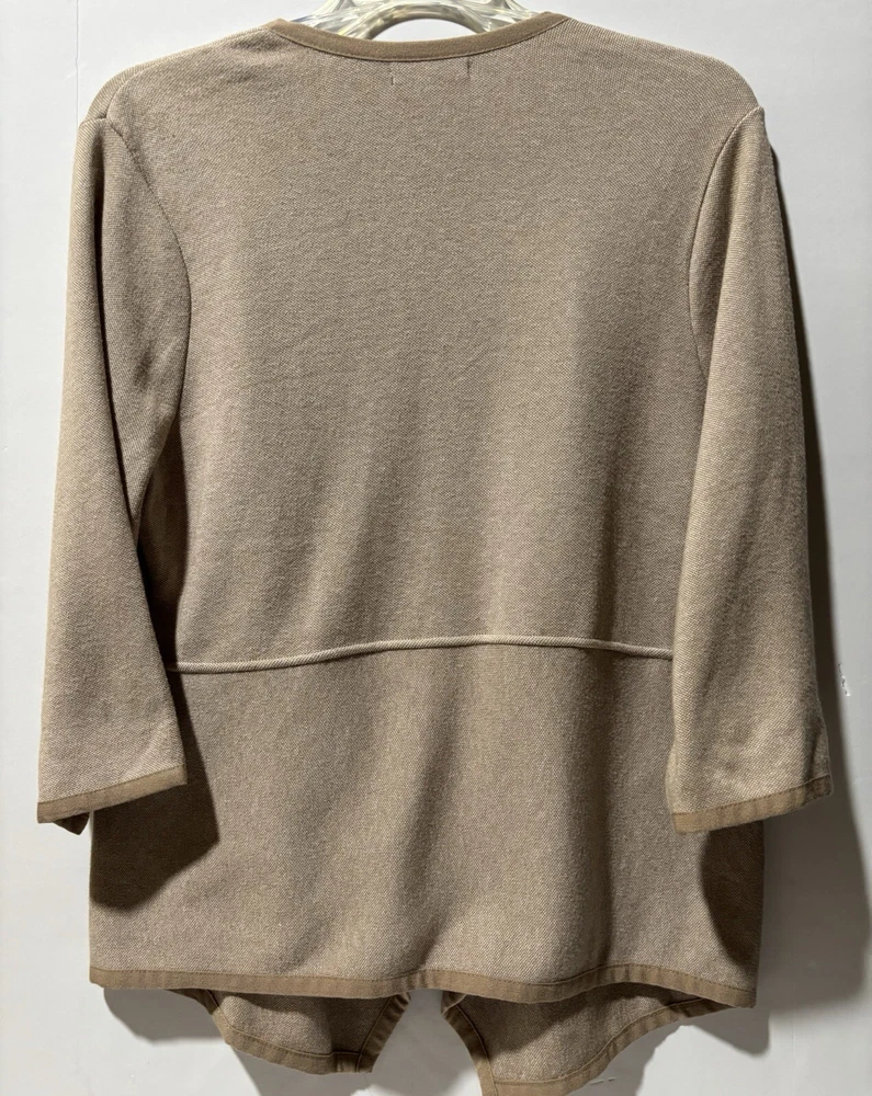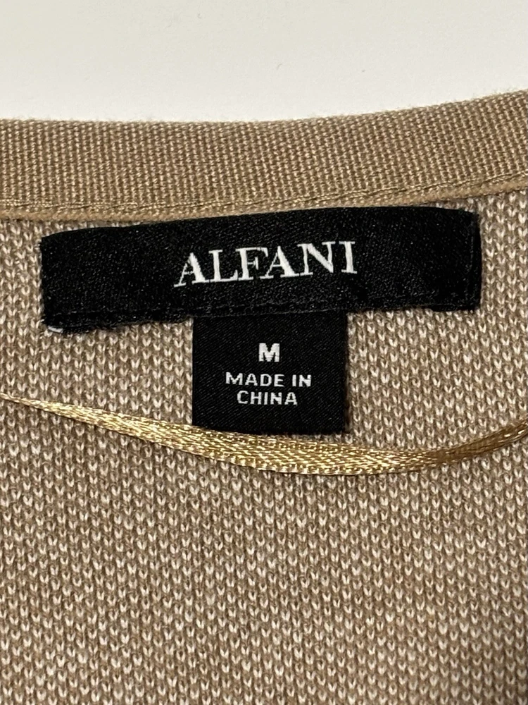 This is an Alfani women's beige oversized cardigan sweater in size medium. It features a collarless neckline, tight-knit cotton and rayon fabric with piping accents and a unique asymmetrical shawl design. The sweater has 3/4 sleeves and is ideal for travel or casual wear during the fall season. The measurements are 40" chest, 16" sleeves, and 24" length