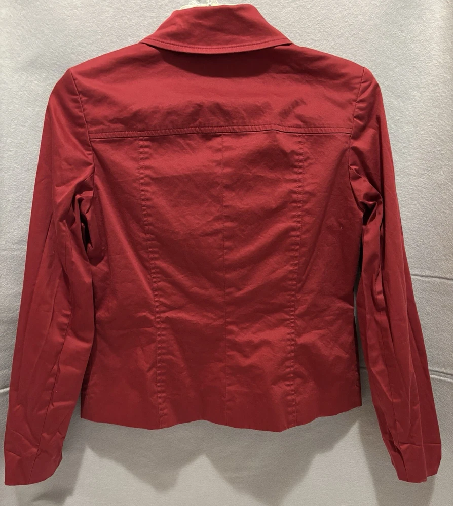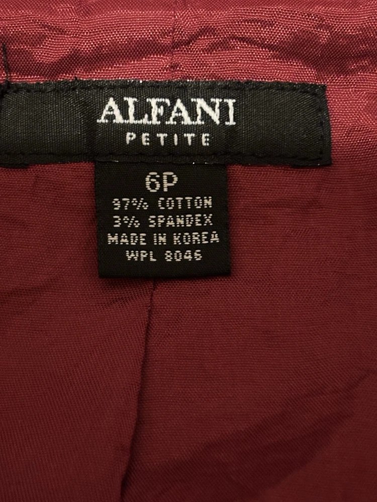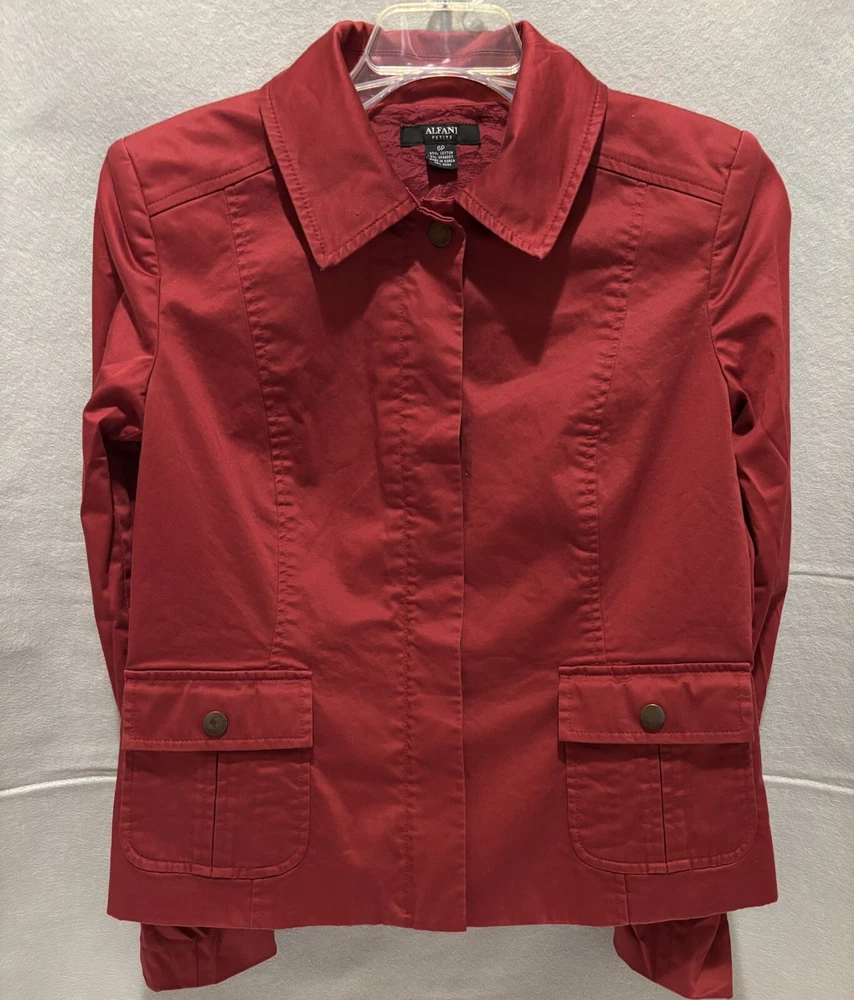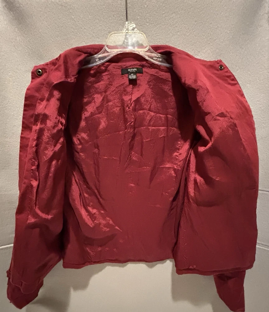 Elevate your office wardrobe with this stunning burgundy full zip top from ALFANI. Crafted from a blend of cotton and spandex, this mid-length jacket features long sleeves and a solid pattern that is perfect for any formal or business occasion. The jacket is equipped with a zip closure and button accents, and the twill fabric type adds a touch of sophistication to the overall design.This women's jacket comes in size 6P with a regular fit and is insulated with polyester for added comfort. The jacket also includes features such as shoulder pads, pockets, and lining made of polyester. Ideal for summer, fall, or spring, this basic jacket is a must-have for any working woman. The top is preowned in great condition. The jacket has a small chalk mark on the sleeve and may need dry cleaning to correct. See photo!