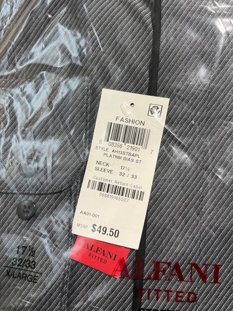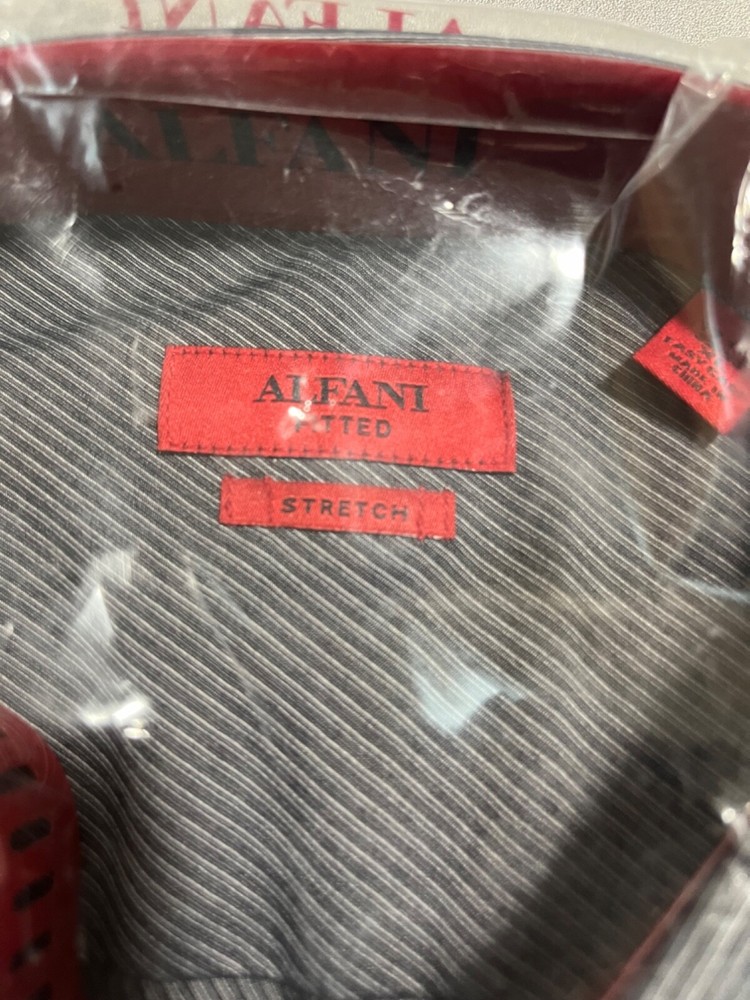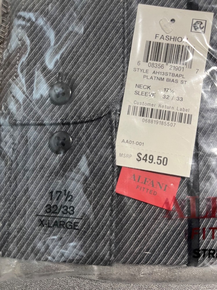 This is a men's dress shirt from the brand Alfani. It is a regular size shirt with a 17.5 neck size and 32/33 sleeve length. The color of the shirt is platinum. This particular shirt is a stretch fabric in size 17.5, making it comfortable to wear.