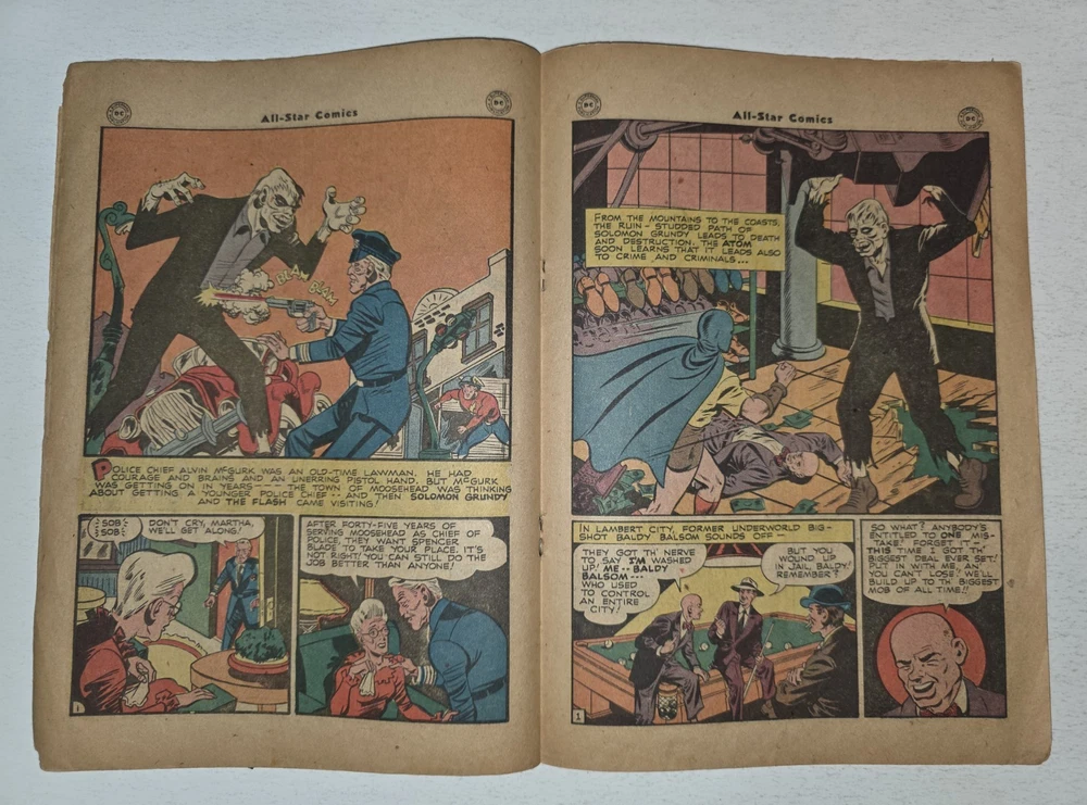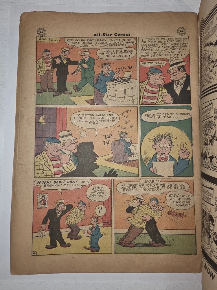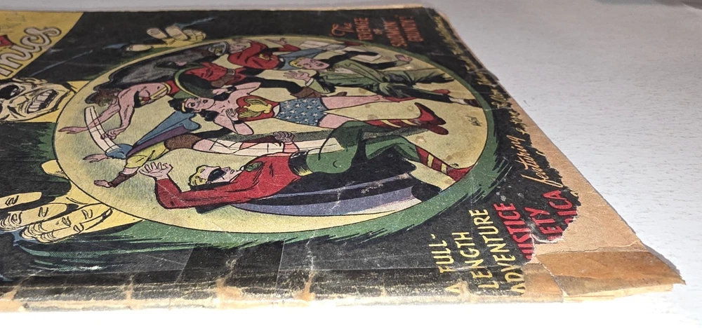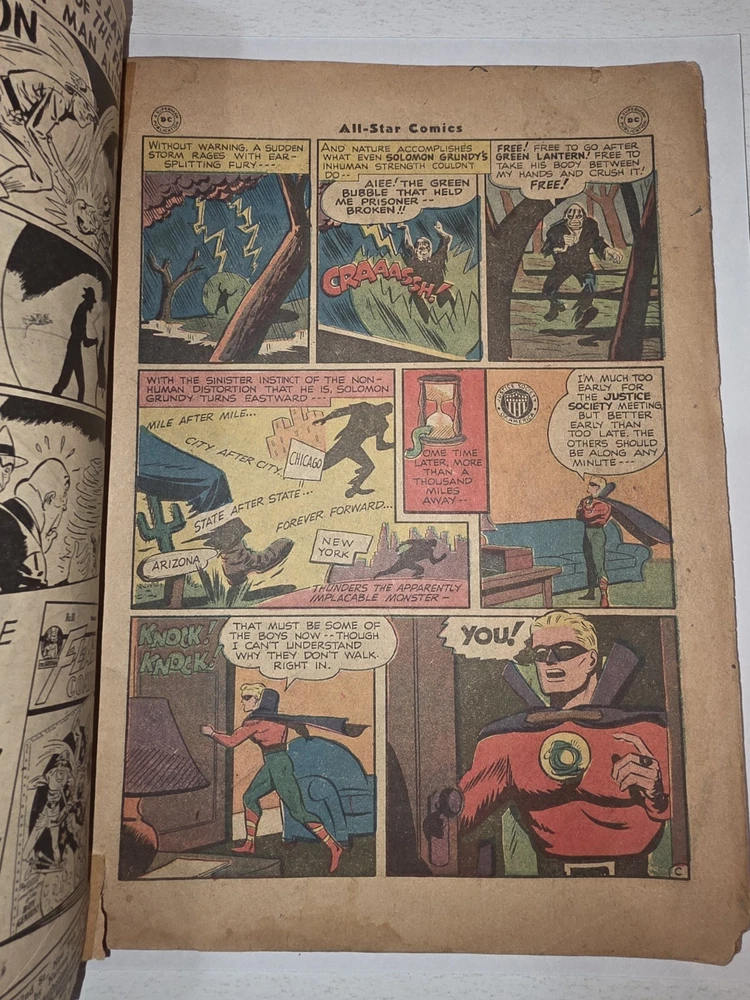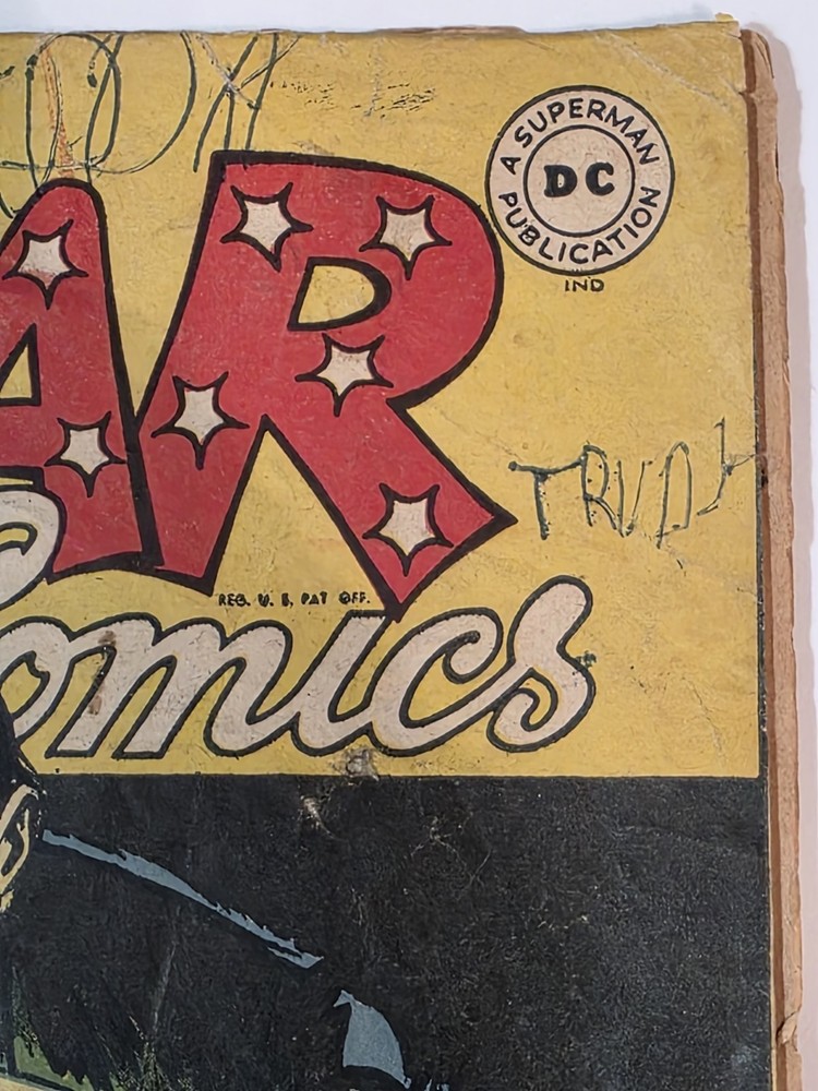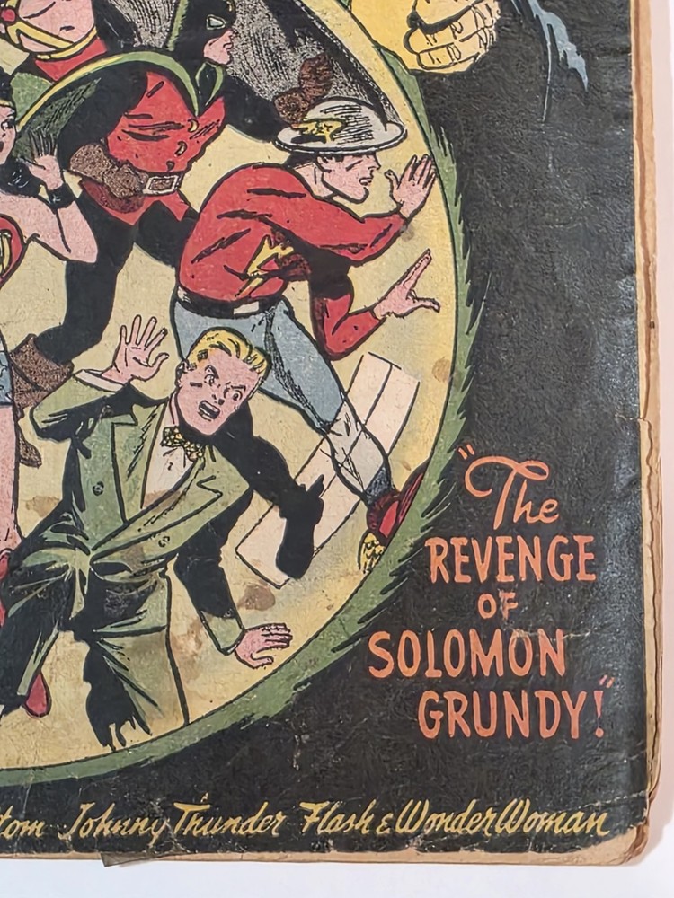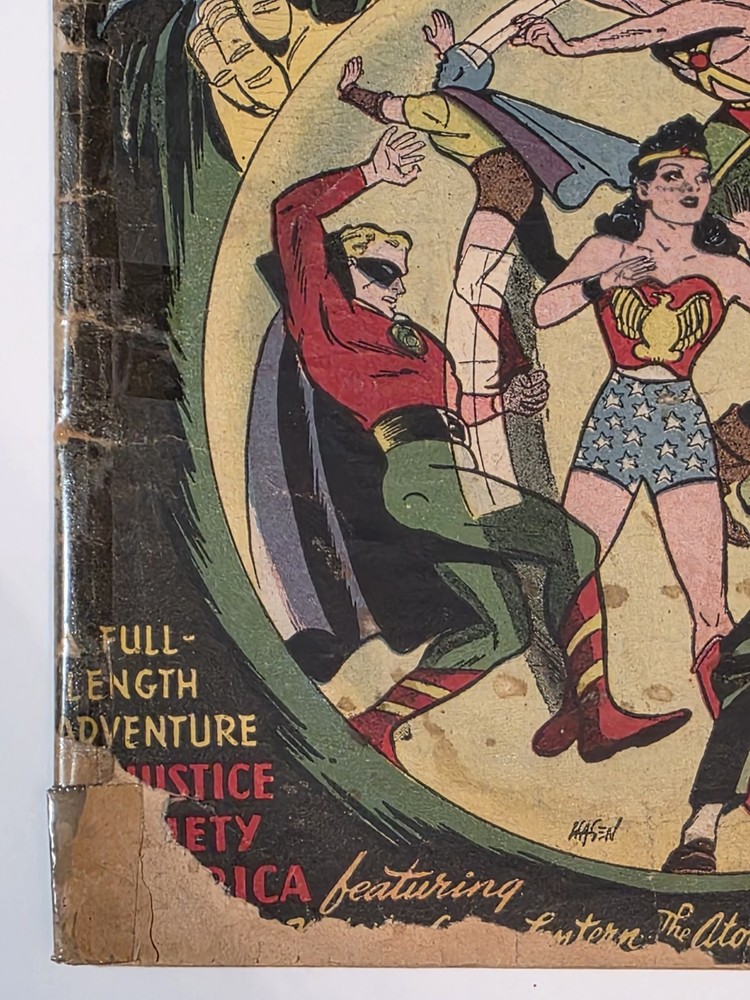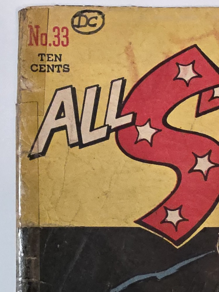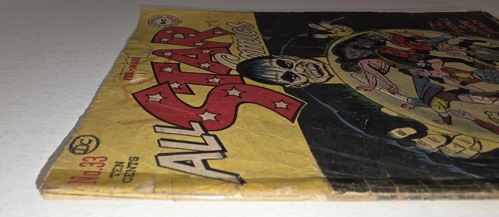 The product is a vintage comic book, All Star Comics #33 from 1947, featuring classic characters like Wonder Woman, Green Lantern, Solomon Grundy, and Flash. This Golden Age comic book is a single issue with a Fair (F) grade range, making it a valuable addition to any collector's edition. With original content by Gardner Fox and cover art by Irwin Hasen, this comic is a must-have for fans of US Comics and the DC Universe. - Complete, lots of wear and tear. Golden Age tape on spine 😆. Brittleness on edges. Bottom left cover 1" missing. Autographed by Baby Boomers on cover. Some stains on bottom center. The good news is that it is still a Golden Age treasure. See pictures - Bagged and boarded - Shipped with Gemini packing to insure no damage during shipping - Usps Priority insured Check out our 1000s of comics in our store We combine shipping