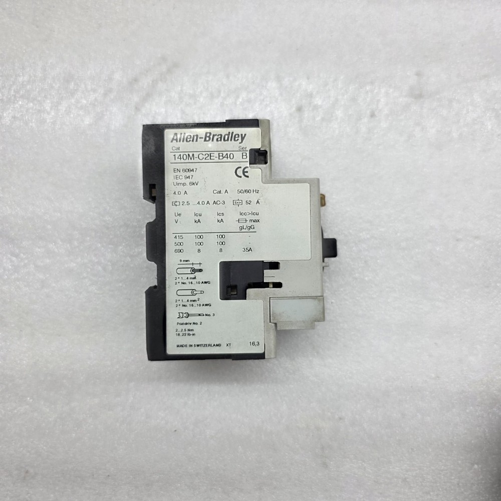 We are pleased to offer ALLEN BRADLEY CAT 140M-C2E-B40 MOTOR CIRCUIT PROTECTOR 2.5-4.0 A Product Detail: ALLEN BRADLEY CAT 140M-C2E-B40 MOTOR CIRCUIT PROTECTOR 2.5-4.0 A CAT NO: 140M-C2E-B40 SERIES: B RANGE: 2.5 - 4.0 A Shipment processing time: All orders are processed within 1-2 business days. Orders are not shipped or delivered on weekends or holidays. Shipment confirmation & Order tracking: You will receive a Shipment Confirmation email once your order has shipped containing your tracking number(s). The tracking number will be active within 24 hours. Customs, Duties and Taxes: We are not responsible for any customs and taxes applied to your order. All fees imposed during or after shipping are the responsibility of the customer (tariffs, taxes, etc.). Damages: In case of damage or lost of shipment during transit, We will investigate the matter and provide the satisfactory resolution. Returns Policy: We offer return or exchange of ordered item up to 30 days of receipt of goods in subject to certain condition. In case of damaged goods we shall offer the replacement or refund for the ordered item. If you require any more details, request you to send us the direct message through eBay for early resolution. Thanks