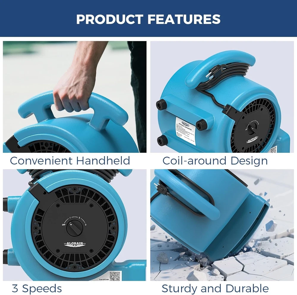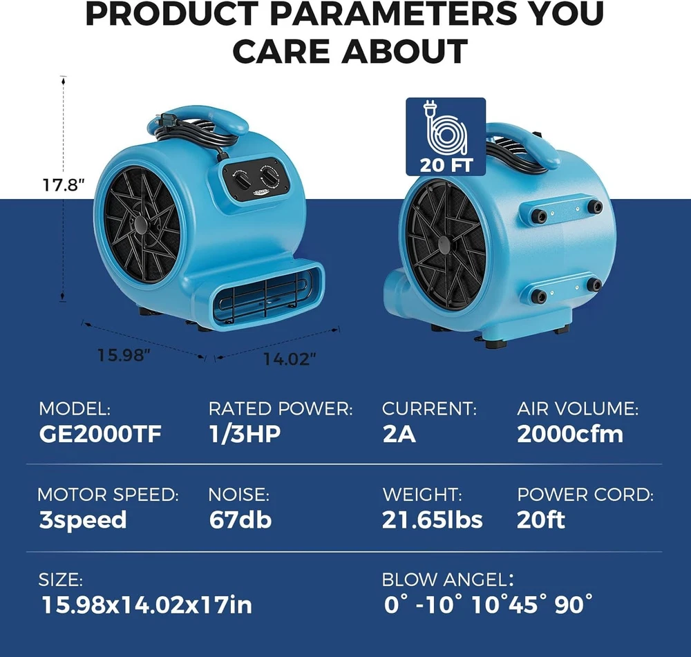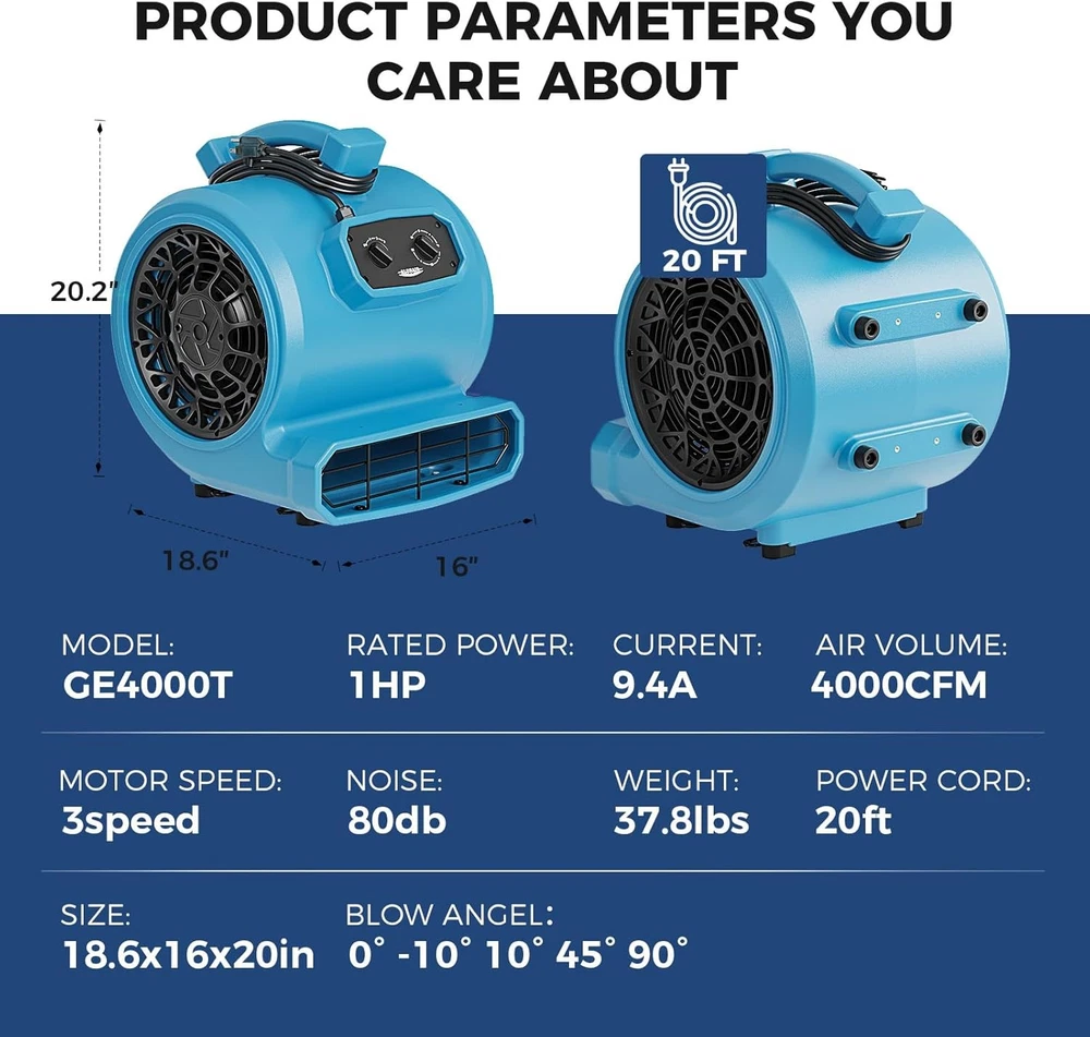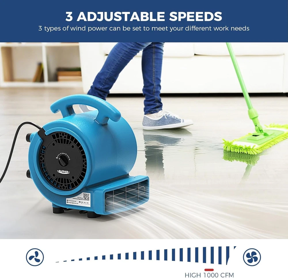 ALORAIR (600-4000 CFM) (1/4 - 1 HP) Air Mover Blower Fan Dryer for Industrial, Janitorial, Home, Commercial, Carpet Floor Drying, Water Damage Restoration and Plumbing - For details, please click on the underlined blue font of the model below to view. Thank you! GF600A-blue ALORAIR GF600A 600 CFM 1/4 HP Mini Air Mover Carpet Dryer Blower Floor Fan-Blue GF600A-yellow ALORAIR GF600A 600CFM 1/4 HP Mini Air Mover Carpet Dryer Blower Floor Fan-Yellow GF600A-red ALORAIR GF600A 600 CFM 1/4 HP Mini Air Mover Carpet Dryer Blower Floor Fan-Red GE1000 ALORAIR GE1000 1000 CFM 1/5 HP Air Mover Carpet Dryer Blower Floor Fan - Blue GE1000A ALORAIR GE1000A 1000 CFM 1/5 HP Air Mover Carpet Dryer Blower Floor Fan - Blue GE1000T ALORAIR GE1000T 1000 CFM 1/5 HP Air Mover Carpet Dryer Blower Floor Fan - Blue GE1000AT ALORAIR GE1000AT 1000 CFM 1/5 HP Air Mover Carpet Dryer Blower Floor Fan - Blue GE2000T ALORAIR GE2000T 2000 CFM 1/3 HP Air Mover Carpet Dryer Blower Floor Fan w/Timer GE2000TF ALORAIR GE2000TF 2000 CFM 1/3 HP Air Mover Carpet Dryer Blower Floor Fan w/Timer GE2000HCW ALORAIR GE2000HCW 2000 CFM 1/3 HP Air Mover Carpet Dryer Blower Floor Fan - Blue GE3000T ALORAIR GE3000T 3000 CFM 4/5 HP Air Mover Carpet Dryer Blower Floor Fan - Blue GE3000TF ALORAIR GE3000TF 3000 CFM 4/5 HP Air Mover Carpet Dryer Blower Floor Fan - Blue GE3000HTC ALORAIR GE3000HTC 3000 CFM 4/5 HP Air Mover Carpet Dryer Blower Floor Fan - Blue GE3000HCW ALORAIR GE3000HCW 3000 CFM 4/5 HP Air Mover Carpet Dryer Blower Floor Fan - Blue GE4000T ALORAIR GE4000T 4000 CFM 1 HP Air Mover Carpet Dryer Blower Floor Fan - Blue GE4000TC ALORAIR GE4000TC 4000 CFM 1 HP Air Mover Carpet Dryer Blower Floor Fan - Blue GE4000HTC ALORAIR GE4000HTC 4000 CFM 1 HP Air Mover Carpet Dryer Blower Floor Fan - Blue GE4000HCW ALORAIR GE4000HCW 4000 CFM 1 HP Air Mover Carpet Dryer Blower Floor Fan - Blue