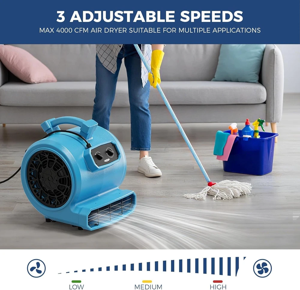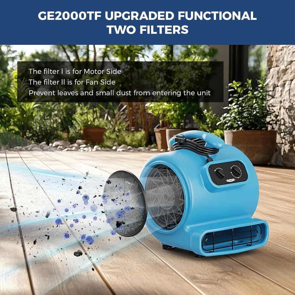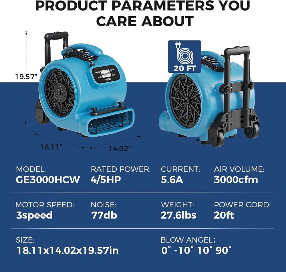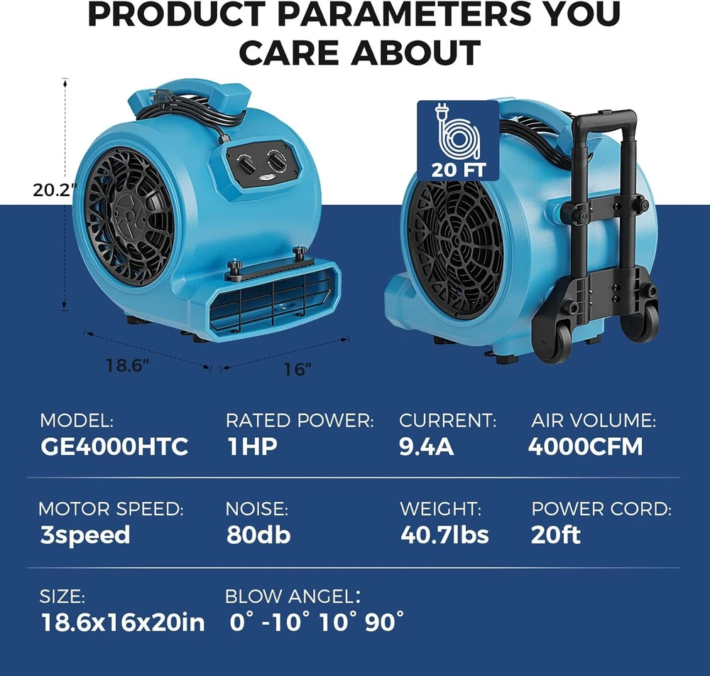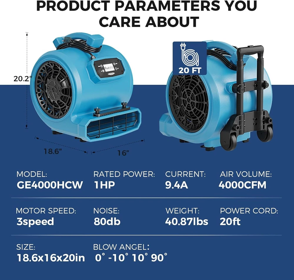 ALORAIR (600-4000 CFM) (1/4 - 1 HP) Air Mover Blower Fan Dryer for Industrial, Janitorial, Home, Commercial, Carpet Floor Drying, Water Damage Restoration and Plumbing - For details, please click on the underlined blue font of the model below to view. Thank you! GF600A-blue ALORAIR GF600A 600 CFM 1/4 HP Mini Air Mover Carpet Dryer Blower Floor Fan-Blue GF600A-yellow ALORAIR GF600A 600CFM 1/4 HP Mini Air Mover Carpet Dryer Blower Floor Fan-Yellow GF600A-red ALORAIR GF600A 600 CFM 1/4 HP Mini Air Mover Carpet Dryer Blower Floor Fan-Red GE1000 ALORAIR GE1000 1000 CFM 1/5 HP Air Mover Carpet Dryer Blower Floor Fan - Blue GE1000A ALORAIR GE1000A 1000 CFM 1/5 HP Air Mover Carpet Dryer Blower Floor Fan - Blue GE1000T ALORAIR GE1000T 1000 CFM 1/5 HP Air Mover Carpet Dryer Blower Floor Fan - Blue GE1000AT ALORAIR GE1000AT 1000 CFM 1/5 HP Air Mover Carpet Dryer Blower Floor Fan - Blue GE2000T ALORAIR GE2000T 2000 CFM 1/3 HP Air Mover Carpet Dryer Blower Floor Fan w/Timer GE2000TF ALORAIR GE2000TF 2000 CFM 1/3 HP Air Mover Carpet Dryer Blower Floor Fan w/Timer GE2000HCW ALORAIR GE2000HCW 2000 CFM 1/3 HP Air Mover Carpet Dryer Blower Floor Fan - Blue GE3000T ALORAIR GE3000T 3000 CFM 4/5 HP Air Mover Carpet Dryer Blower Floor Fan - Blue GE3000TF ALORAIR GE3000TF 3000 CFM 4/5 HP Air Mover Carpet Dryer Blower Floor Fan - Blue GE3000HTC ALORAIR GE3000HTC 3000 CFM 4/5 HP Air Mover Carpet Dryer Blower Floor Fan - Blue GE3000HCW ALORAIR GE3000HCW 3000 CFM 4/5 HP Air Mover Carpet Dryer Blower Floor Fan - Blue GE4000T ALORAIR GE4000T 4000 CFM 1 HP Air Mover Carpet Dryer Blower Floor Fan - Blue GE4000TC ALORAIR GE4000TC 4000 CFM 1 HP Air Mover Carpet Dryer Blower Floor Fan - Blue GE4000HTC ALORAIR GE4000HTC 4000 CFM 1 HP Air Mover Carpet Dryer Blower Floor Fan - Blue GE4000HCW ALORAIR GE4000HCW 4000 CFM 1 HP Air Mover Carpet Dryer Blower Floor Fan - Blue