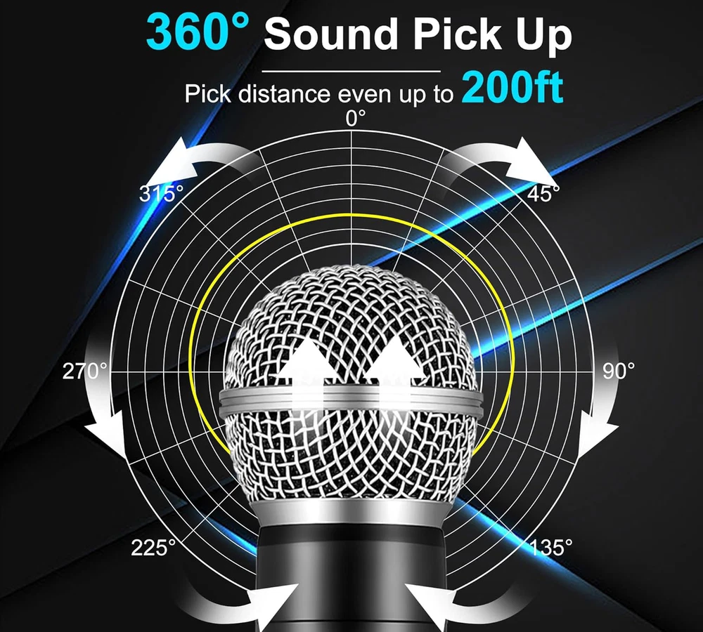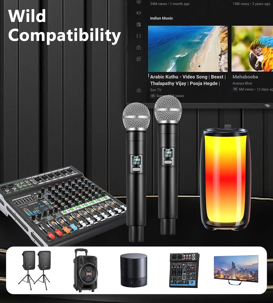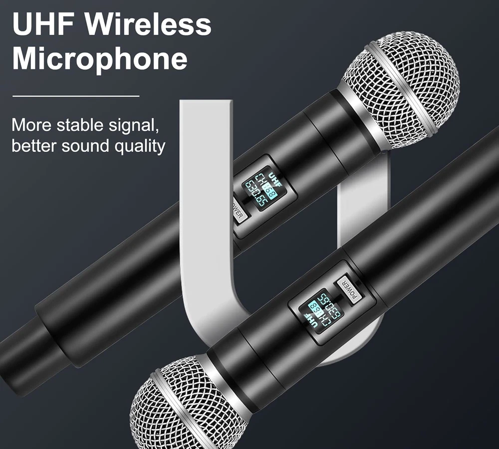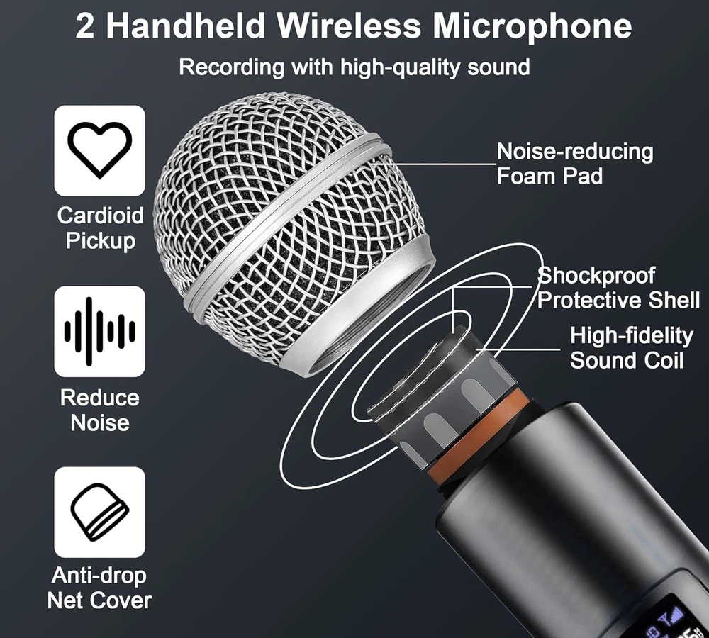 [Truly Wireless Long Distance Range]--Wireless microphone updates UHF frequency which makes the connection range up to 200Ft (60m). It makes of exquisite technology that Microphone has more stable signal. tamper-proof, 0 delay! It’s very suitable for family karaoke, churches, weddings, conferences, and small stage performances. [Easy to Use]--Don’t know how to set the frequency? No worry, we have already matched for you. Microphone comes with 1 microphone receiver, you just need to plug the receiver into the machine as long as the machine has a microphone input jack. It supports 6.5mm and 3.5mm (Package contains a 6.5mm to 3.5mm adapter) microphone jack connection which is compatible with lots of devices such as sound cards, speakers, karaoke machines, etc [Long Duration&Rechargeable Battery]--Microphone comes with 800 mah batteries, it could work for 40h. Microphones and receiver all adopt USB-C charging port that only need 2-3h to fully charge. No need to buy battery again and again [Clear Sound Pick Up]--UHF dual handheld cordless microphone was designed with DSP noise reduction technology, it could reduce the background noise to the most degree and clearly pick up the human voice. The package also contains two microphone sleeves that could keep the hygiene and have a better sound pick up. [Service Guarantee]--Please read the manual carefully before using the product. If you have any questions, please feel free to contact our 7*24 online reply customer service. Our microphones support half year free replacement warranty.