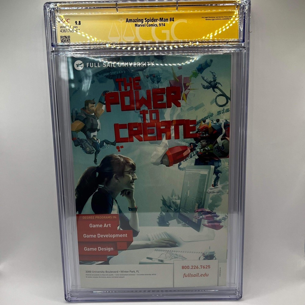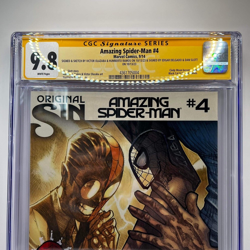 This is an Amazing Spider-Man Vol 4 #4 comic book, featuring the 1st appearance of Silk. The book is a certified CBCS 9.8 Near Mint/Mint grade, with a Signature Series label from Certified Guaranty Company (CGC). It is signed by the full creative team, including Victor Olazaba, Humberto Ramos, Edgar Delgado, and Dan Slott, and has two remarques. This comic book is a rare find, with only 1 in the world graded at 9.8 and signed 4 times. It is a key issue, with the first character appearance of Silk, and is a must-have for any fan of Spider-Man or US comics. The book is in excellent condition. Don't miss out on the opportunity to add this rare and valuable comic to your collection.