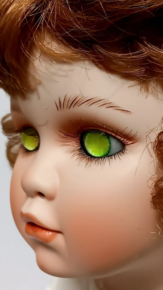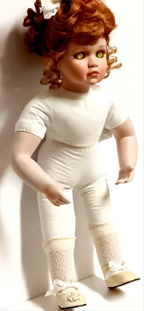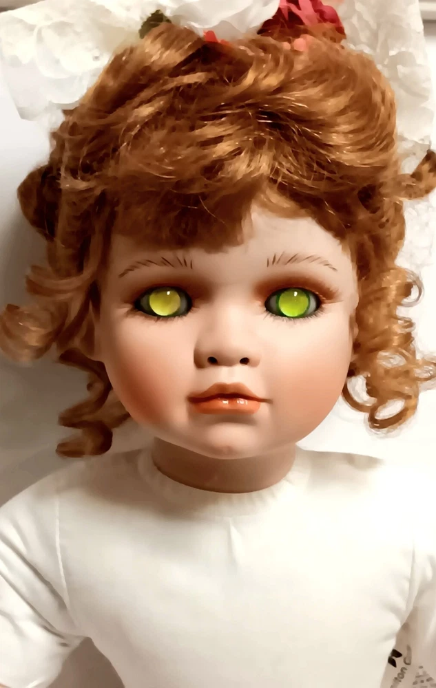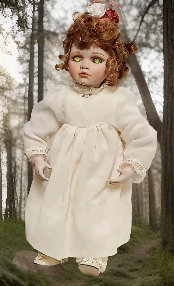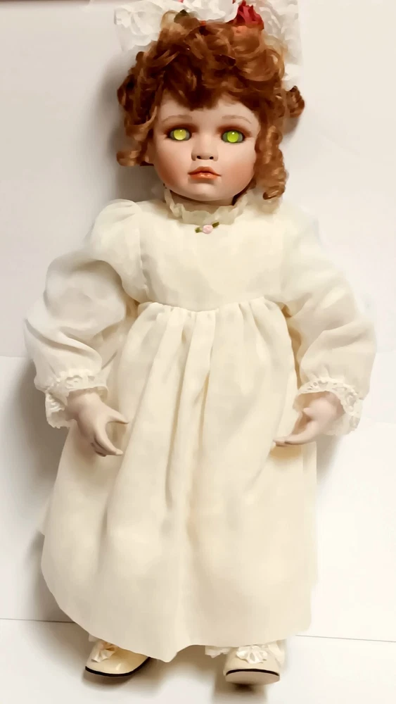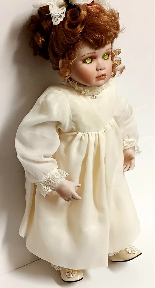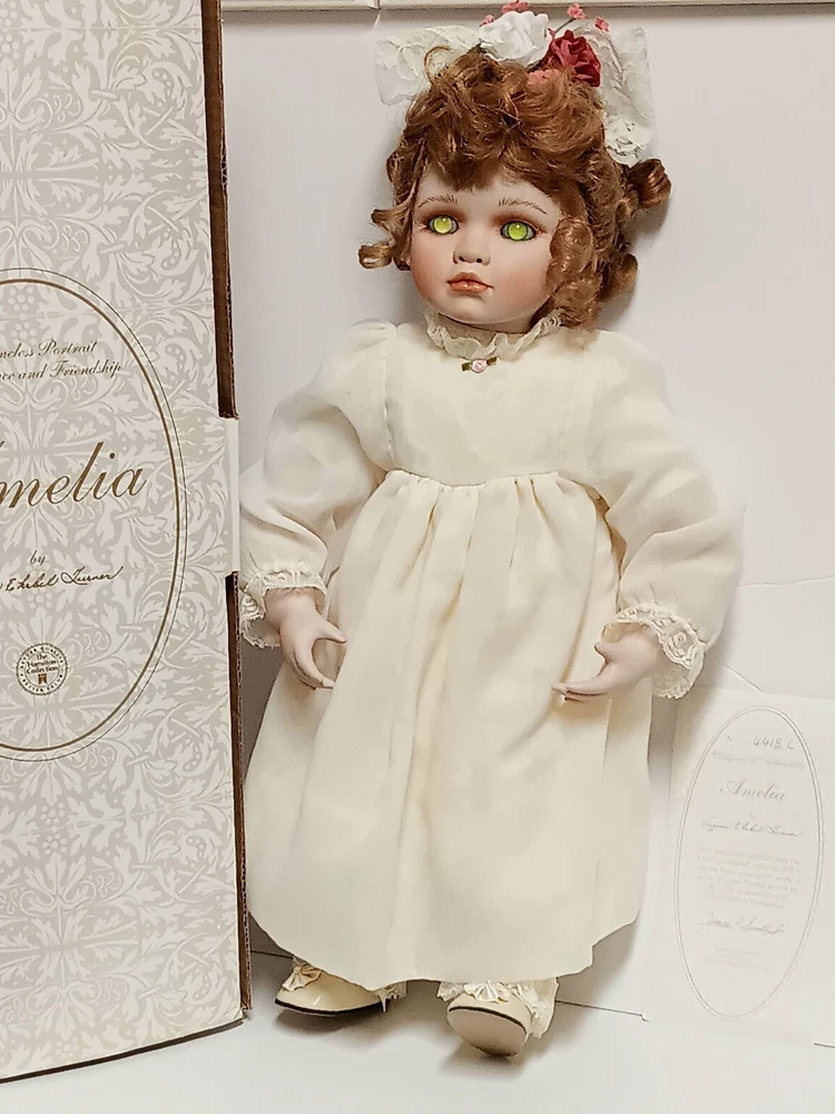 AMELIA 1994 Creepy Green Rare Eyes Hamilton Porcelain 19" Doll Box With Certificate Of Authenticity #4418C. This Hamilton Collection 'Amelia' Porcelain Virginia E Turner Doll features the CREEPIEST green yellow eyes and beautiful curly red hair. Her eyes are very mesmerizing, hypnotic, and unique. The eyelids dont move, but her creepy eyes appear to follow you. She also has natural long hairy eyelashes. Gently pre-loved, good, clean condition. Amelia is so beautiful and intriguing. She comes with her original shoes, socks, pants, lace trim gown, and outer lace trim robe. She has her original lace bow in her hair, and she is made of porcelain and ceramic, head, and extremities. Her body is made of soft fabric and cotton materials. She is signed and numbered on the back of her head. I washed her little clothes before listing. She has lost her little teddy bear (not included). Her doll stand is also missing. See photos.