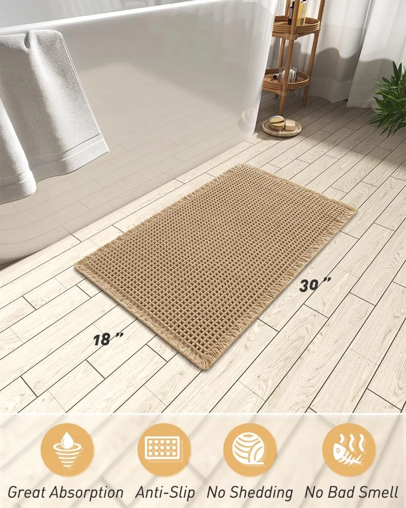 Upgraded Waffle Desgin: This boho bath mat is power-loomed with upgraded yarns-Integrating decoration and durability. The heavier and thicker threads are applied to make sure the pattern will be more solid and compact- NEVER OUT OF SHAPE! Great Water Absorption: Double layer of deep waffle texture absorbs water instantly and more breathable. In addition, the yarns we use is inherently absorbent-it absorb water like crazy. This absorbent bath mat can soak up the water and keep your floor dry like a giant sponge, and protect your feet from the cold floor. Clear Rubber Backing: This non slip bath mat is designed with clear rubber backing(HMA-Hot Melt Adhesive, invisible but touchable). This bathmat firmly grips the ground to prevent you and your families from falling. Comfortable and Soft: Three-dimensional waffle design combined with flexible yarns make the bathroom floor mat softer and cozier. Bring you a comfortable underfoot feeling. Enjoy a comfort space when you finishing shower. Easy to Maintain: Machine washable bathroom rugs provide convenience in your daily life. Recommend gentle mode,cold water. Or just shake the dust off from the bath rugs for simple cleaning.