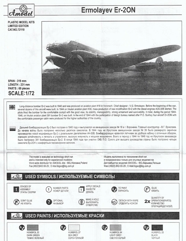 AMODEL 72110 Er-2 ON Soviet special aircraft Scale 1/72 - Plastic model kit