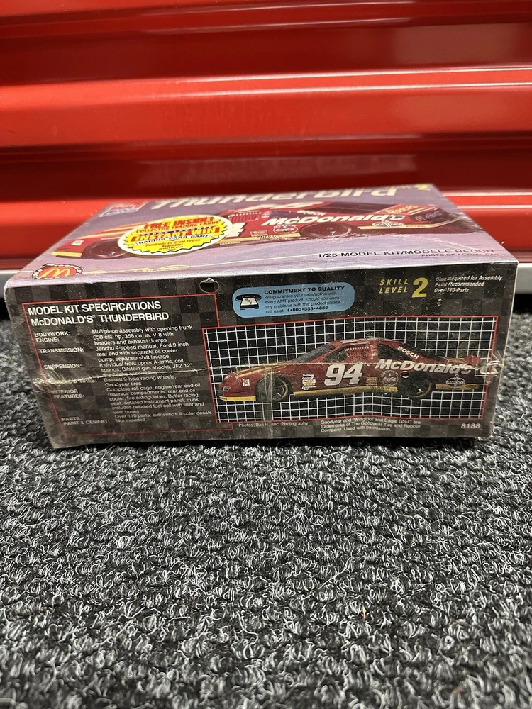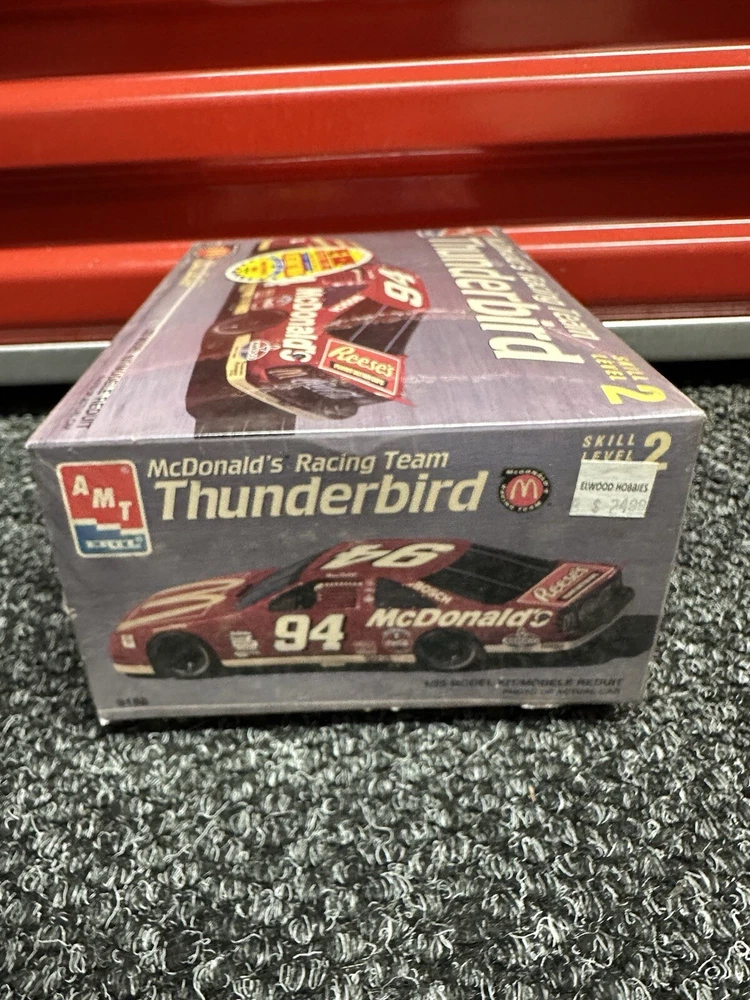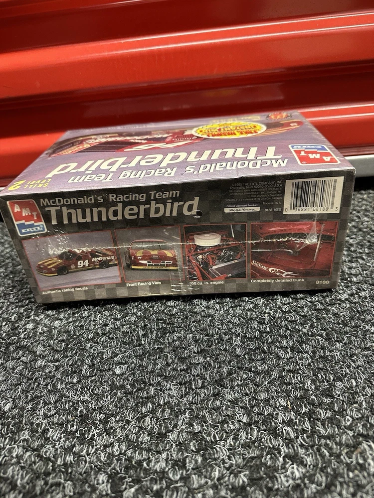The product is an AMT Ertl plastic model kit of a 1995 Ford Thunderbird #94 McDonald's Bill Elliott in a 1:25 scale. This model kit is designed for hobbyists and collectors interested in building and displaying a replica of the specific Ford vehicle driven by Bill Elliott. The kit includes all the necessary parts to assemble a detailed model of the car, making it a great addition to any automotive model collection.