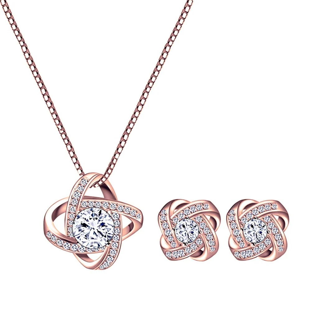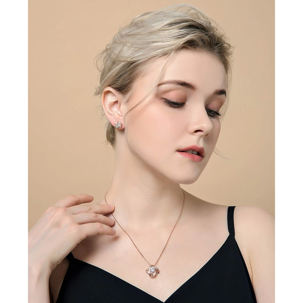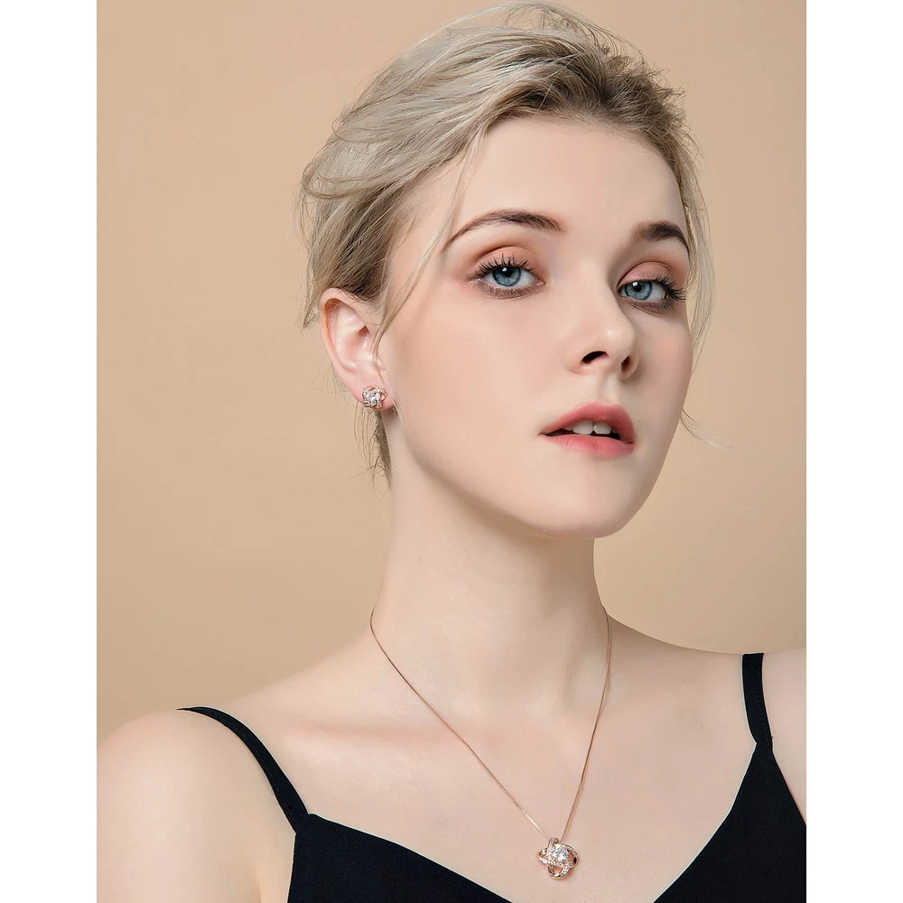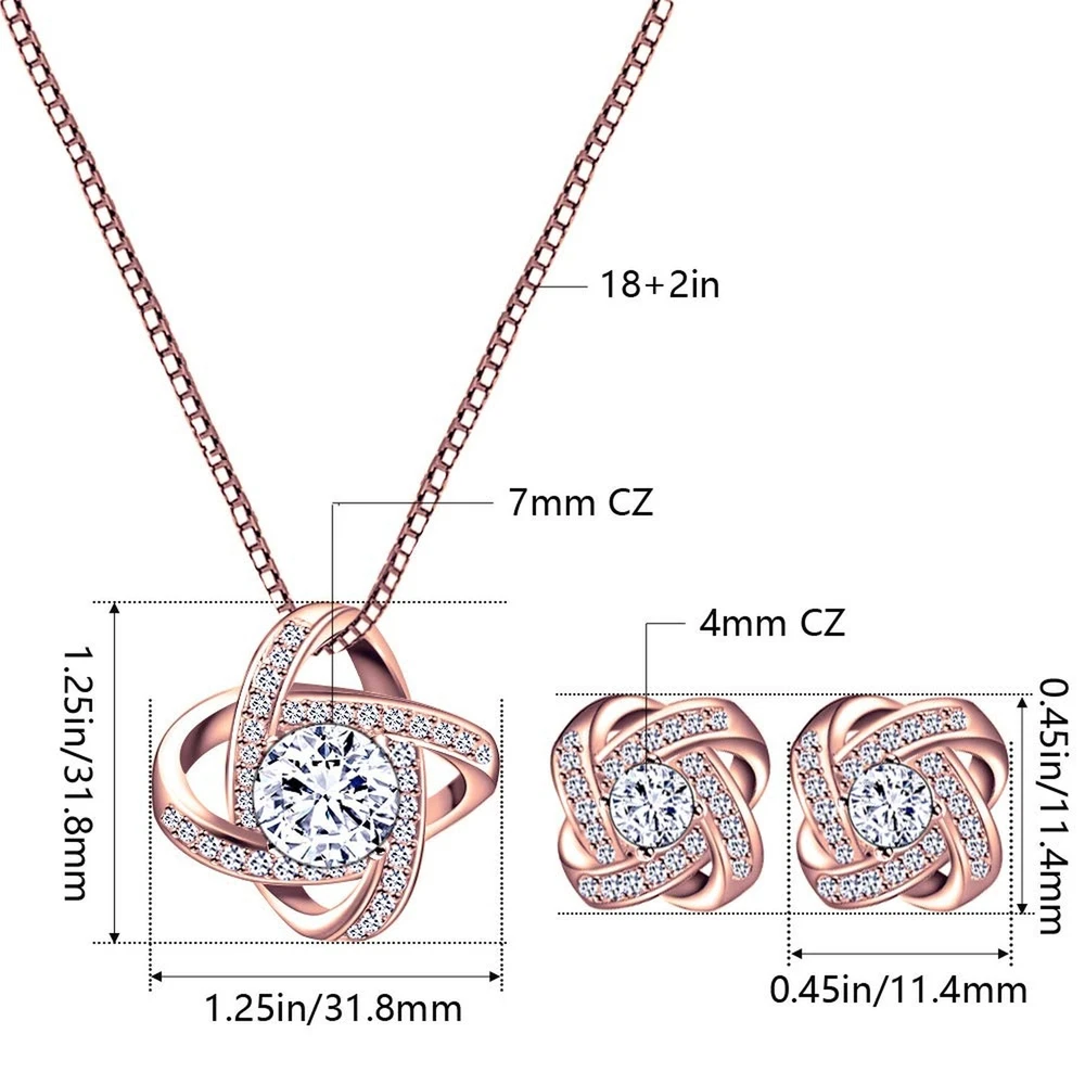 AMYJANE Bridal Jewelry Set for Women - Crystal Cubic Zirconia Love Knot Necklace Stud Earrings Elegant CZ Jewelry Set for Wedding Bride Bridesmaids Gift Set Product Details Color: Clear(14k Rose Gold Plated) Brand: AMYJANE MPN: JS Love Knot rose gold UPC: Does not apply EAN: Does not apply Is Discontinued By Manufacturer : No Department : womens Date First Available : January 14, 2018 Manufacturer : AMYJANE Brand, Seller, or Collection Name: AMYJANE Metal stamp: 14k Metal: Copper Material: Crystal Gem Type: Cubic Zirconia Setting: Prong-Setting Item Length: 3 inches Chain: Box Clasp: Lobster Clasp Resizable: No Number of stones: 5 Model number: JS Love Knot rose gold