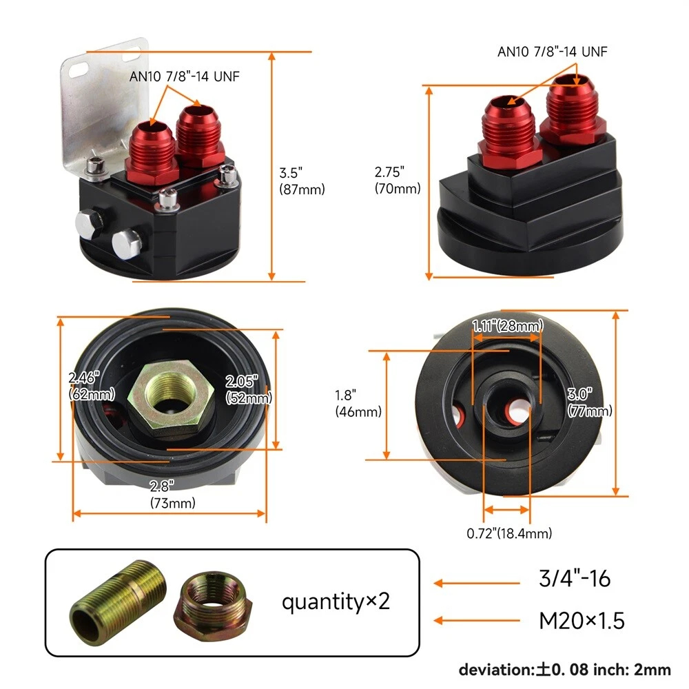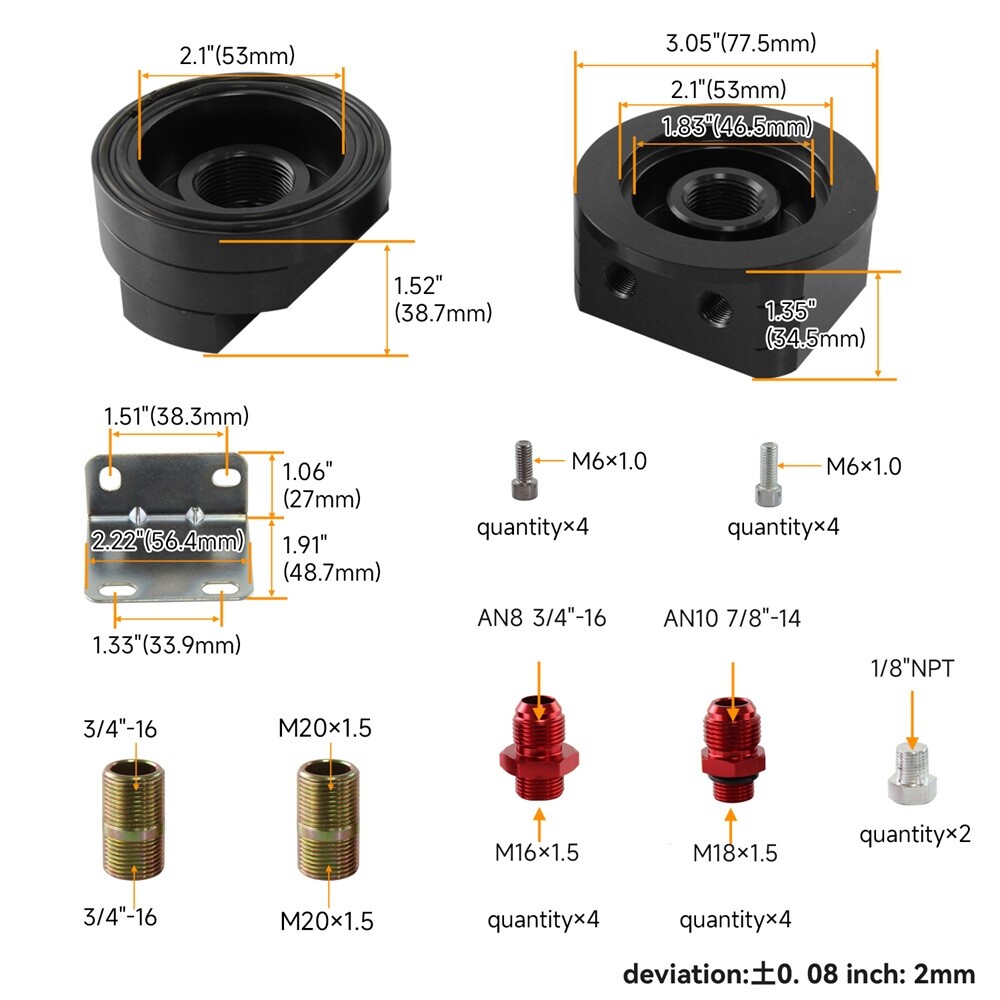Oil Filter Cooler Sandwich Adapter Plate Aluminum Kit AN-10 Application: Universal - M20 x 1.5 and 3/4-16 UNF Threading Engine Blocks and Oil Filters Only (Made For Most Japanese Vehicles) Description: CNC Machined From AL6061-T6 Billet Aluminum With An Anodized Finish Mounts Between The Block and Oil Filter; Provides In and Out Ports With Connections For 10AN Fittings Supports Oil Filters That Has M20 Thread and M20 Block Fitting 10 AN Ports: Running Oil For Turbo / Oil Cooling 1/8 NPT Ports: Running Sensors For Gauges, Sensors, Or Other Accessories Inlet / Outlet Size: 10 AN Note: Does not include sensors or oil lines. Please make sure of sufficient room of your mounting location in the oil filter bay Oil Filter Cooler Sandwich Adapter Plate Aluminum Kit AN-10 Application: Universal - M20 x 1.5 and 3/4-16 UNF Threading Engine Blocks and Oil Filters Only (Made For Most Japanese Vehicles) Description: CNC Machined From AL6061-T6 Billet Aluminum With An Anodized Finish Mounts Between The Block and Oil Filter; Provides In and Out Ports With Connections For 10AN Fittings Supports Oil Filters That Has M20 Thread and M20 Block Fitting 10 AN Ports: Running Oil For Turbo / Oil Cooling 1/8 NPT Ports: Running Sensors For Gauges, Sensors, Or Other Accessories Inlet / Outlet Size: 10 AN Note: Does not include sensors or oil lines. Please make sure of sufficient room of your mounting location in the oil filter bay Delivery details Payment Return Policy FeedBack Contact us Delivery details Shipping Details Information you should include with your payment: -Your Full Name -Your Full and Correct Address,Postcode(Make sure address is correct and we sent the goods only by the eaby address) -Valid Contact phone number is necessary(UPS or Post Office may contact you to arrrange pick up or if any issue happens to your package.) -eBay Item number We are not responsible for any delay caused by incomplete or wrong information and payment. Orders will be shipped after cleared payment received in PayPal. We ship our items worldwide through Economy or Express shipping way as per our convenience. The shipping method also depends on the shipping cost you choose. Our logistics department cannot deliver your orders during weekends / holidays / office closed hours or at special timing. Import Duty & Other Charges : Customs Duties, Import charges or any other country specific charges if applicable, to be borne/paid by the buyer.These charges are the buyer's responsibility.Any damage during installation will not be refunded. Please check with your local customs authority to determine these additional costs prior to bidding or buying. These charges are normally collected by the delivering courier (shipping) company or when you collect the package, please do not feel confused as additional shipping cost or shipping is always prepaid by us (sellers). If your address belong to the remote area, we will contact you to pay the extra remote dispatch charge before ship out. For international transactions, you may also be responsible for possible duties, taxes, and customs clearance fees as requested by country laws. According to ebay policy , the Import duties, taxes, and charges are not included in the item price or shipping cost. These charges are the buyer´s responsibility. Please check with your country´s customs office to determine what these additional costs will be prior to bidding or buying. Payment We Accept PayPal and Credit Card All payments must be received within 10 days after auction won Non-pay bidder will get an unpaid alert from eBay PayPal E-Checks will be held until cleared Return Policy Return will be accepted within 14 days only after buyer get it . In case of return Buyer will pay the return shipping cost. Refund will be processed within 7 working days from receiving date of the damaged or disputed item at our (seller) end. Item should be in original condition as packaged from our (seller) end. All refunds will be evaluated on case to case basis. FeedBack Your positive feedback and satisfaction are very important to us and we are appreciated if you can spend some time for It. It will surely help us in better serviceability and would also assist us in improving our business standards. If you are not happy about a particular aspect of the business transaction, please feel free to contact us via phone or mail before giving a negative feedback We assure you of resolving it in the best possible way. Contact us E-mails will be replied during business hours: 9:00a.m. to 5:00p.m. China Beijing time (GMT+8.0). Monday to Friday only(excluding Holidays). The e-mails received during office closed, will be replied in the following business day.