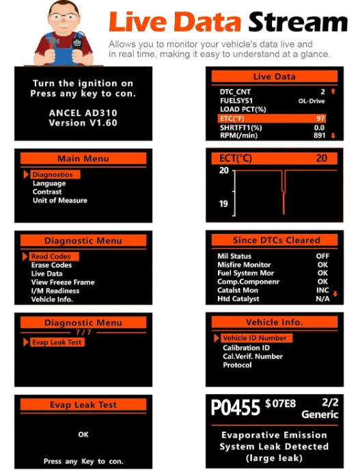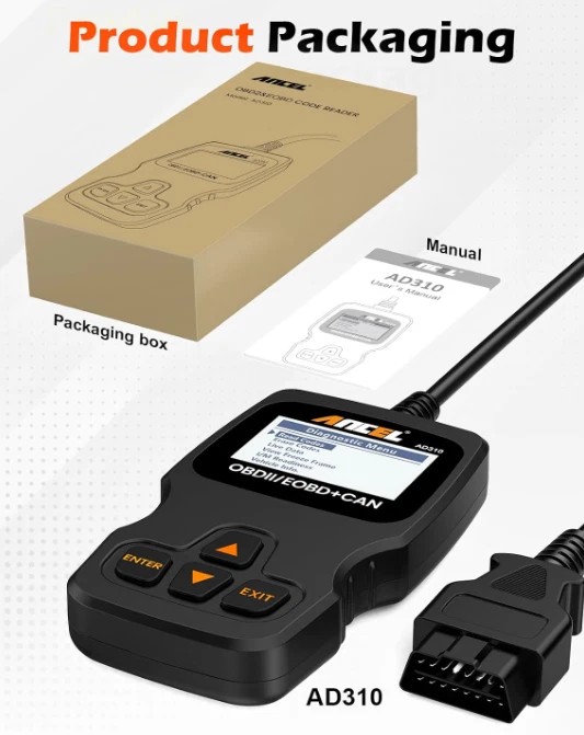 ANCEL AD310 Classic Enhanced Universal OBD II Scanner Car Engine Fault Code Read CEL Doctor: The ANCEL AD310 is one of the best-selling OBD II scanners on the market and is recommended by Scotty Kilmer, a YouTuber and auto mechanic. It can easily determine the cause of the check engine light coming on, quickly read and clear diagnostic trouble codes, read live data & hard memory data, view freeze frame, I/M monitor readiness and collect vehicle information. Instead of taking car to mechanic shop, you can use it to check the trouble code and show code definition by yourself. Sturdy and Compact: Equipped with a 2.5 foot cable made of very thick, flexible insulation. It is important to have a sturdy scanner as it can easily fall to the ground when working in a car. The AD310 OBD2 scanner is a well-constructed device with a sleek design. It weighs 12 ounces and measures 8.9 x 6.9 x 1.4 inches. Thanks to its compact design and light weight, transporting the device is not a problem. The buttons are clearly labelled and the screen is large and displays results clearly. Accurate Fast and Easy to Use: The AD310 scanner can help you or your mechanic understand if your car is in good condition, provides exceptionally accurate and fast results, reads and clears engine trouble codes in seconds. If you want to find out the cause of the check engine light, this device will let you know immediately and fix the problem right away without any car knowledge. No need for batteries or a charger, get power directly from the OBDII Data Link Connector in your vehicle. OBDII Protocols and Car Compatibility: Many cheap scan tools do not really support all OBD2 protocols. This is not the case with the AD310 scanner as it can support all OBDII protocols such as KWP2000, J1850 VPW, ISO9141, J1850 PWM and CAN. This device also has extensive vehicle compatibility with 1996 US-based, 2000 EU-based and Asian cars, light trucks, SUVs, as well as newer OBD2 and CAN vehicles both domestic and foreign. Check compatibility with your vehicle model before purchasing. Home Necessity and Worthy to Own: This is an excellent code reader to travel or home with as it weighs less and it is compact in design. You can easily slide it in your backpack as you head to the garage, or put it on the dashboard, this will be a great fit for you. The AD310 is not only portable, but also accurate and fast in performance. Moreover, it covers various car brands and is suitable for people who just need a code reader to check their car. Terms of Sale and Feedback: Feedback is very important to us and eBay. If you are satisfied with our transaction, please take a moment to leave positive feedback. YOUR satisfaction is our number one priority! If there are any problems, PLEASE contact us BEFORE leaving a neutral or negative rating so we can resolve any concerns. We PROMISE that we can make you happy if you give us a fair chance.