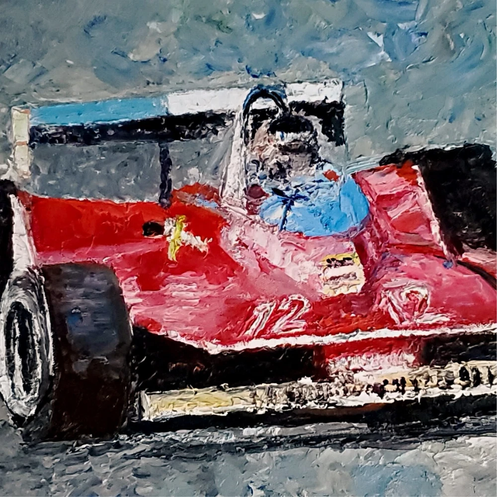 Capturing the essence of speed and nostalgia, Andre Dluhos's original oil painting, "Villeneuve," is a homage to the vintage race car era of Formula 1. Measuring an impressive 18 inches in height and 24 inches in width, this large canvas is a one-of-a-kind piece that brings the thrill of the racetrack to your collection. The artwork is wonderfully painted on canvas with the highest quality oil paints, ensuring lasting vibrancy and texture. This piece is steeped in the culture of Western art, embodying a contemporary style that nods to both realism and impressionism. It is a proud representation of American craftsmanship, signed by the artist himself, and comes with a Certificate of Authenticity to assure its originality. "Villeneuve" is unframed, allowing the new owner the freedom to choose the perfect frame that complements their space. Original oil painting titled " Villeneuve " SIZE 18" x 24" COA issued and included. Painting is on stretched canvas, fully varnished and ready to frame. Signed, dated, and titled on back of painting. Schooled in the fine art academies of Europe, and nearly 70 years of professional artist experience, Andre presents a bold, palette knife style with heavy texture and a decidedly modern take on the impressionist style. Buy directly from the studio and invest in a timeless piece of fine art. Collectors from all over the world own Andre's artworks. From corporate and public spaces, to private collections and home decor, Andre's work is renowned globally. Whether for yourself or as a present for someone special, a painting is a timeless gift that will serve as a memory for a lifetime. jan 31, 2025 .