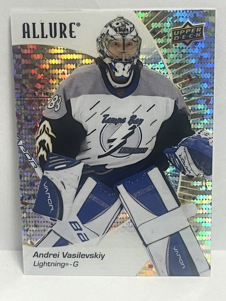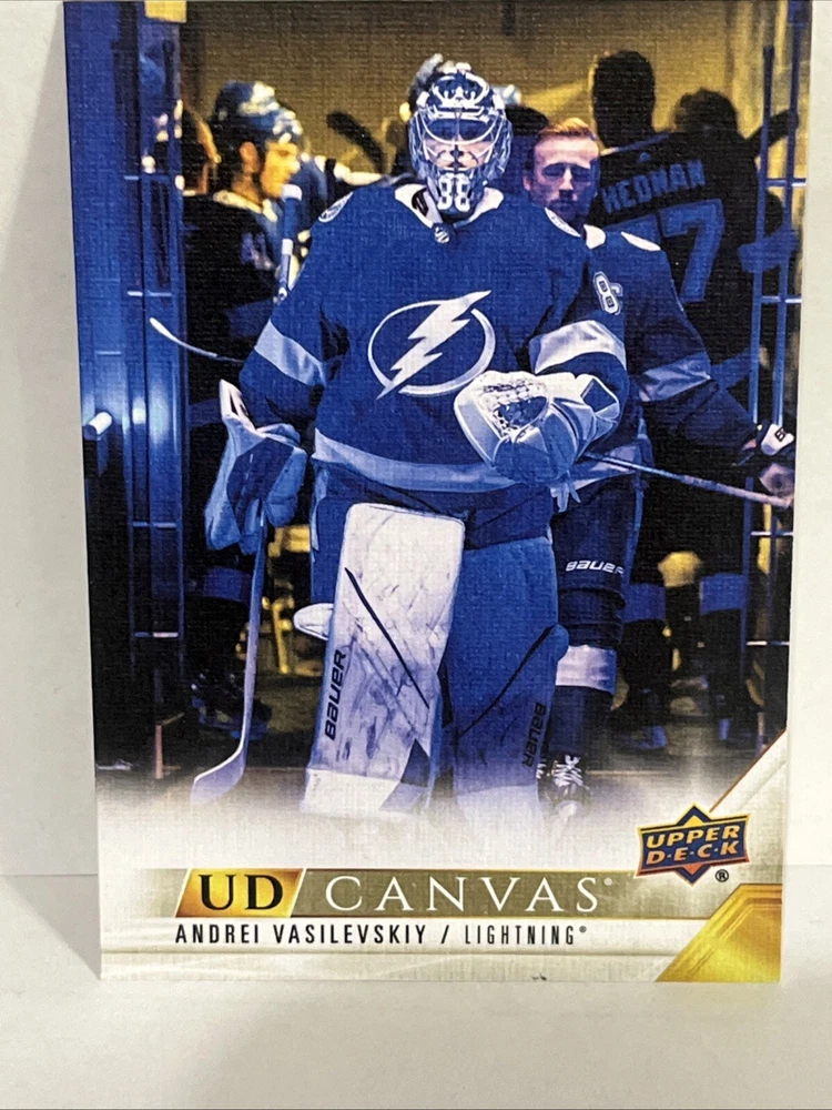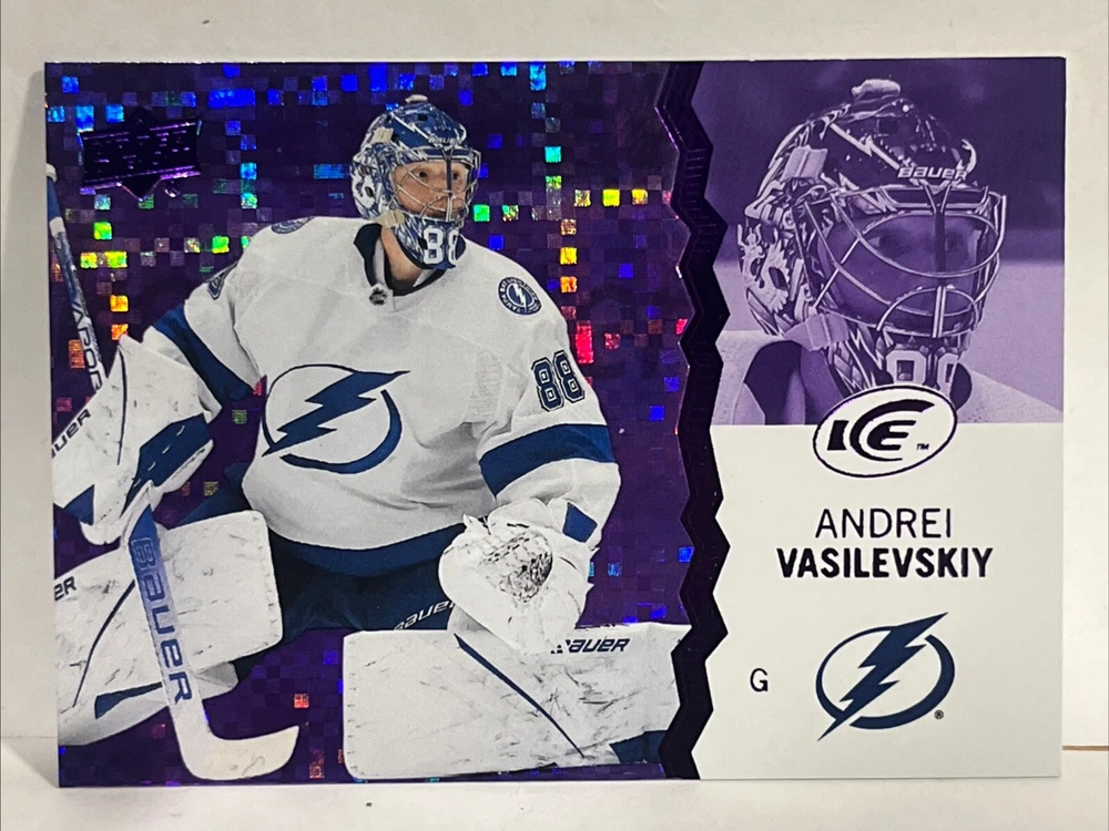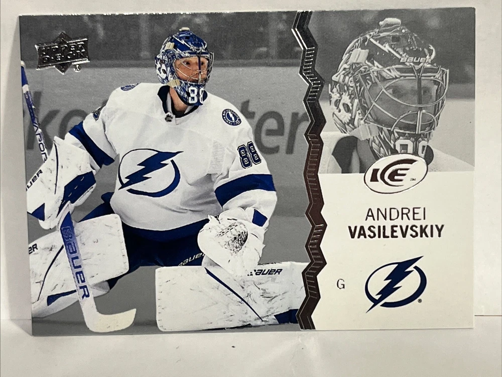Dive into the world of Ice Hockey with this exclusive lot of 14 cards featuring the talented Andrei Vasilevskiy of the Tampa Bay Lightning. Each card is meticulously crafted by Upper Deck, capturing the essence of the game and the player’s skill on the ice. The set includes a variety of inserts, short prints, and parallel/variety cards, making it a treasure trove for collectors and fans alike. With card numbers ranging from 59 to 716, these English-language, standard-sized cards are made from durable card stock, ensuring they remain a part of your collection for years to come. Celebrate the NHL and add a touch of Tampa Bay Lightning pride to your assortment with these original Upper Deck and OPC inserts, showcasing one of hockey's most impressive goaltenders. All 14 cards are sold as is condition. Set includes: Exclusives Card #29/100-23/24 UD Ext. Series Black Rainbow-23/24 UD Allure All Stars card-23/24 OPC Green Parallel-23/24 UD Ice Purple Parallel-23/24 UD Ice Base-23/24 UD Ice Gaming PVP-24/25 UD Series 1 Base card/23/24 UD Ext. Series Insert card-22/23 OPC Platinum UD Canvas-22/23 UD Series 1 Deep Roots-23/24 UD Series 2 Gold Glitter Bomb #74/199-23/24 Allure UD Canvas-23/24 UD Series 2 Red Rainbow-23/24 UD Allure All 14 cards to be sold in as is condition, no guarantees on condition of cards written or implied and any factory defects found on cards. All cards will be in penny sleeves and team bags and shipped in bubble mailers.
