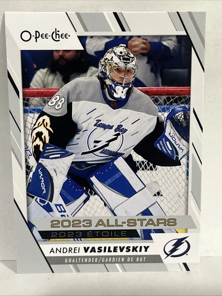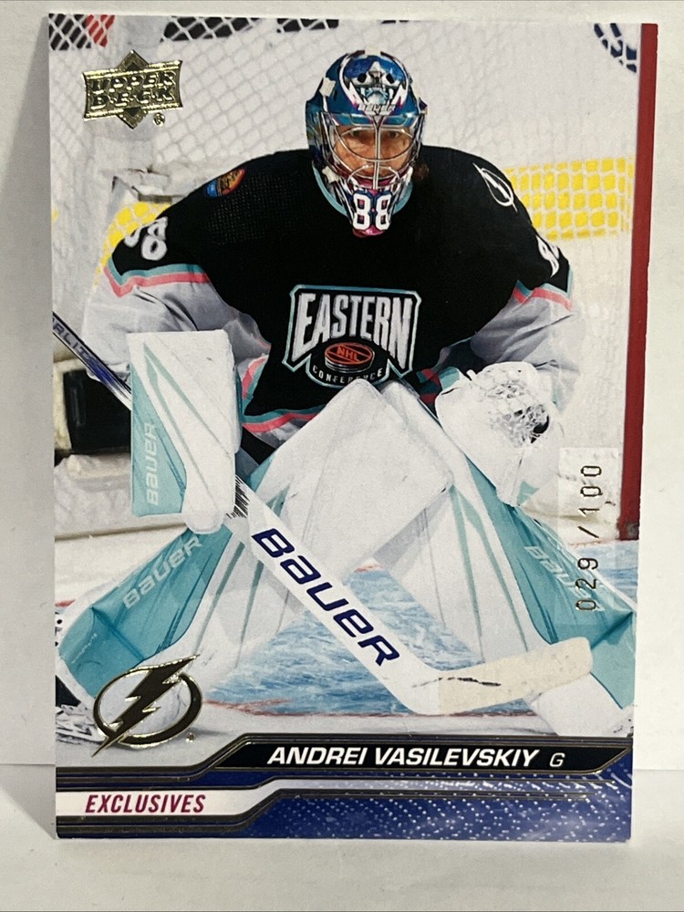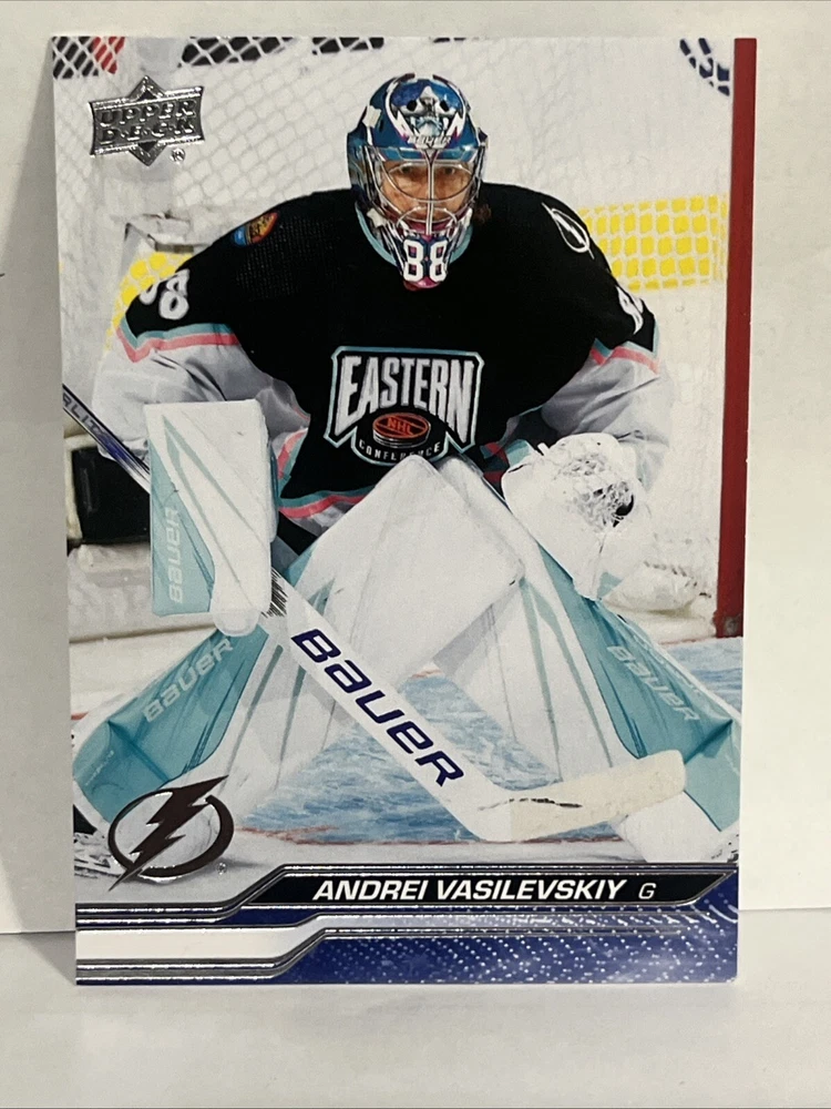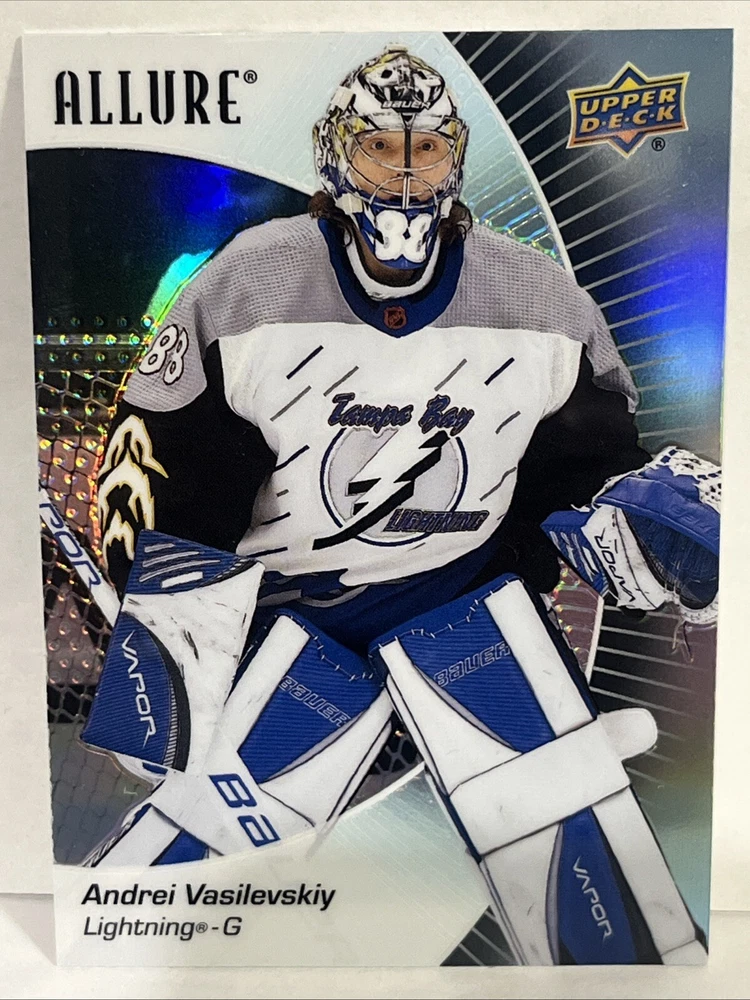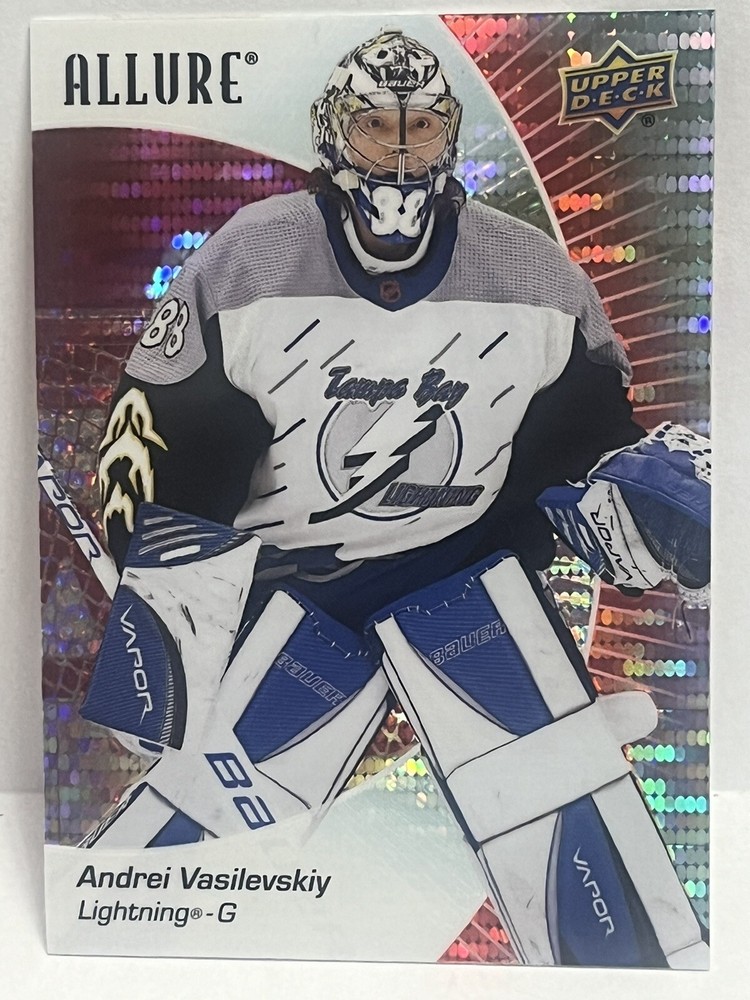 Dive into the world of Ice Hockey with this exclusive lot of 14 cards featuring the talented Andrei Vasilevskiy of the Tampa Bay Lightning. Each card is meticulously crafted by Upper Deck, capturing the essence of the game and the player’s skill on the ice. The set includes a variety of inserts, short prints, and parallel/variety cards, making it a treasure trove for collectors and fans alike. With card numbers ranging from 59 to 716, these English-language, standard-sized cards are made from durable card stock, ensuring they remain a part of your collection for years to come. Celebrate the NHL and add a touch of Tampa Bay Lightning pride to your assortment with these original Upper Deck and OPC inserts, showcasing one of hockey's most impressive goaltenders. All 14 cards are sold as is condition. Set includes: Exclusives Card #29/100-23/24 UD Ext. Series Black Rainbow-23/24 UD Allure All Stars card-23/24 OPC Green Parallel-23/24 UD Ice Purple Parallel-23/24 UD Ice Base-23/24 UD Ice Gaming PVP-24/25 UD Series 1 Base card/23/24 UD Ext. Series Insert card-22/23 OPC Platinum UD Canvas-22/23 UD Series 1 Deep Roots-23/24 UD Series 2 Gold Glitter Bomb #74/199-23/24 Allure UD Canvas-23/24 UD Series 2 Red Rainbow-23/24 UD Allure All 14 cards to be sold in as is condition, no guarantees on condition of cards written or implied and any factory defects found on cards. All cards will be in penny sleeves and team bags and shipped in bubble mailers.