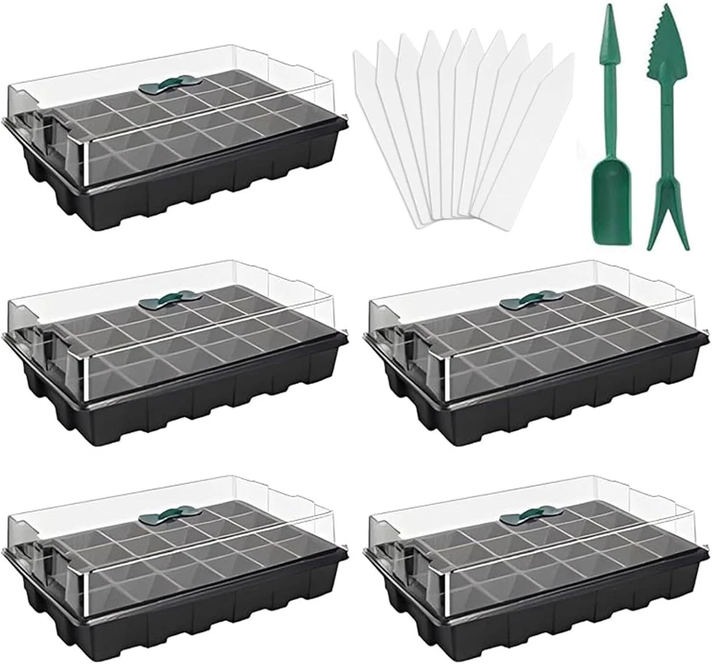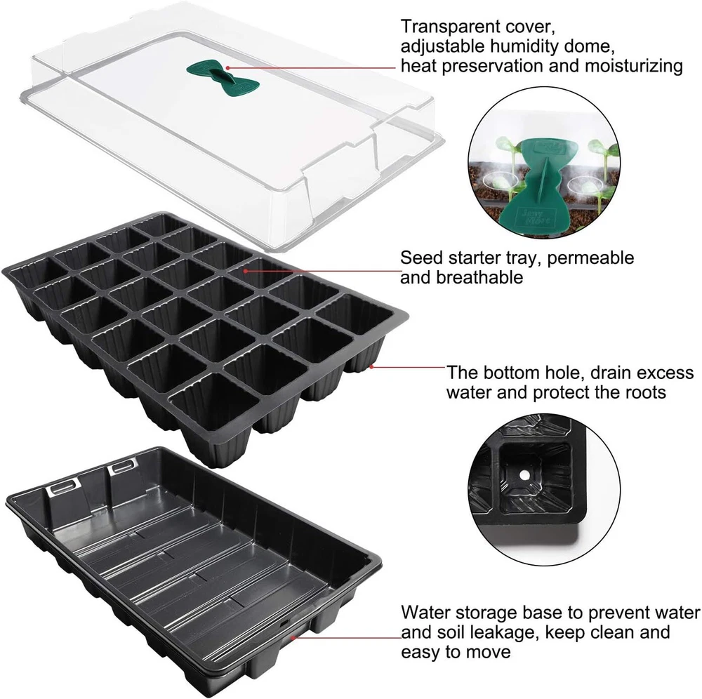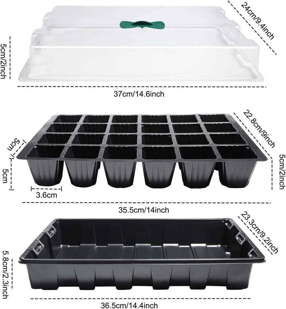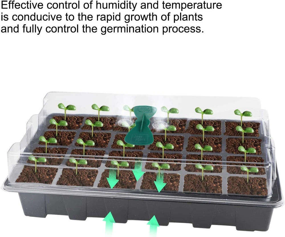 ANGTUO 5 Pack Seed Starter Trays for Planting 120 Cell Plant Black Product Details Material: Polyvinyl Chloride (PVC), Plastic Color: Black Special Feature: Drainage Hole Style: Garden Planter Form: Tray Shape: Rectangular Indoor/Outdoor Usage: Indoor Mounting Type: Tabletop Plant or Animal Product Type: Bonsai Flower Herb Succulent Vegetable Product Dimensions: 8.66"D x 2.76"W x 13.78"H Brand: ANGTUO Number of Pieces: 5 Pattern: Solid Included Components: Humidity Dome Theme: Floral Item Weight: 2 Pounds Item Weight: 2 pounds Manufacturer: ANGTUO Plant Germination Starter Kit: The seedling starter trays kit is made of PVC plastic material, and the quality is thicker, strong and not easy to deform. They can be placed on top of each other, saving space and easy to manage. Greenhouse Grow Trays: In addition to planting vegetables, flowers, herbs and other plants in the soil, the base tray can also placing peat pellet. There are two ways of use for you to choose from, meet your different planting needs! Seed Propagator Tray: 24-cell seed starting clone trays are convenient for centralized management, easy to operate and save your time and energy. There are drainage holes at the bottom of each cell for proper drainage, provide ideal conditions for seed germination and growing. Adjustable Humidity Dome: Seed trays with 2 ventilation holes, the adjustable dome can be opened and closed, more effectively controlling humidity and temperature, good for rapid growth of plants and fully controlling the germination process. Garden Plant Germination Kit: Transparent and pervious to light, easy to observe the growth of seeds at any time without interrupting the growth progress. Suitable for beginners to seed, can effectively improve seed germination, suitable for microgreens, soil Blocks, rockwool cubes, wheatgrass, hydroponic.