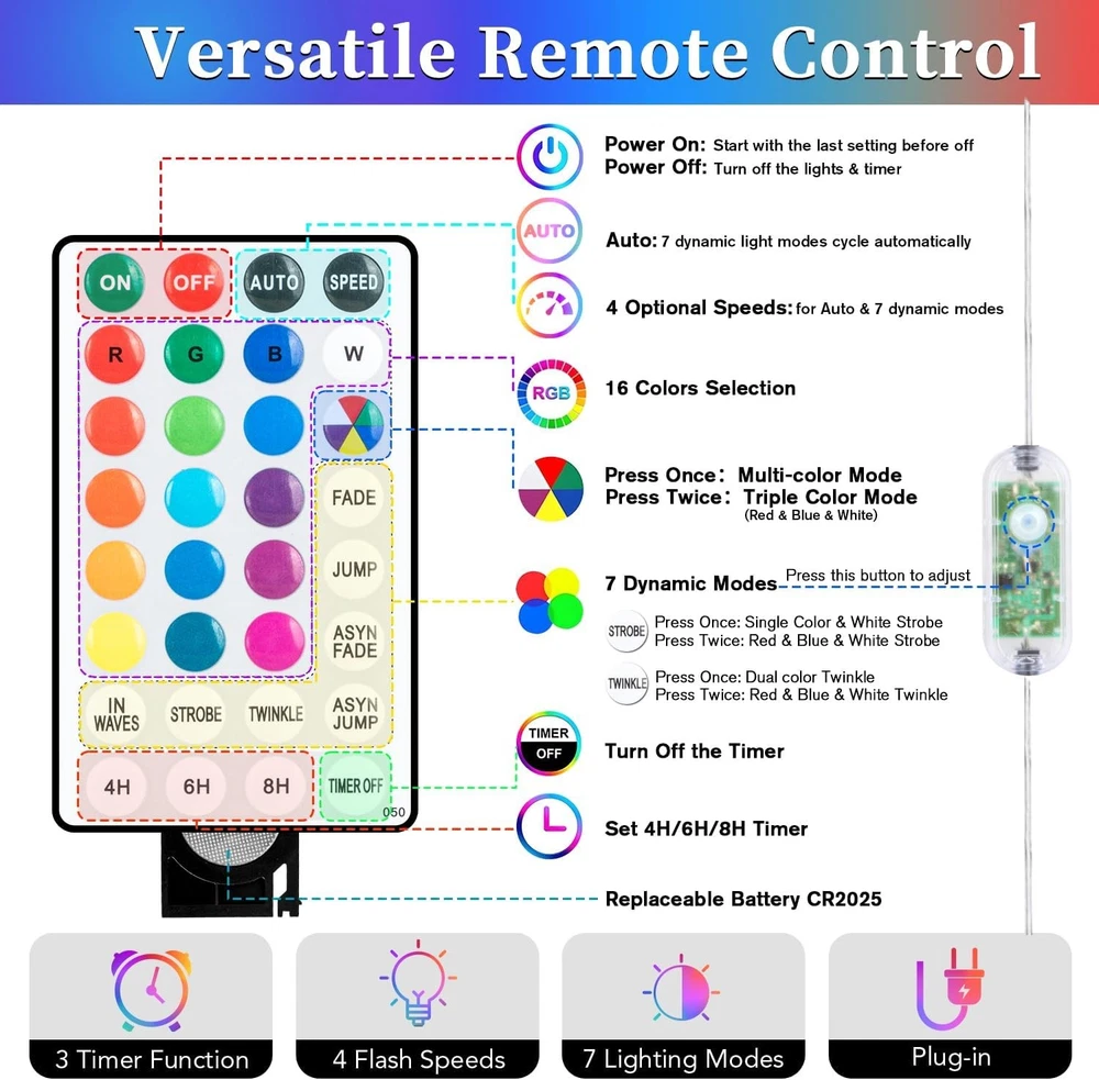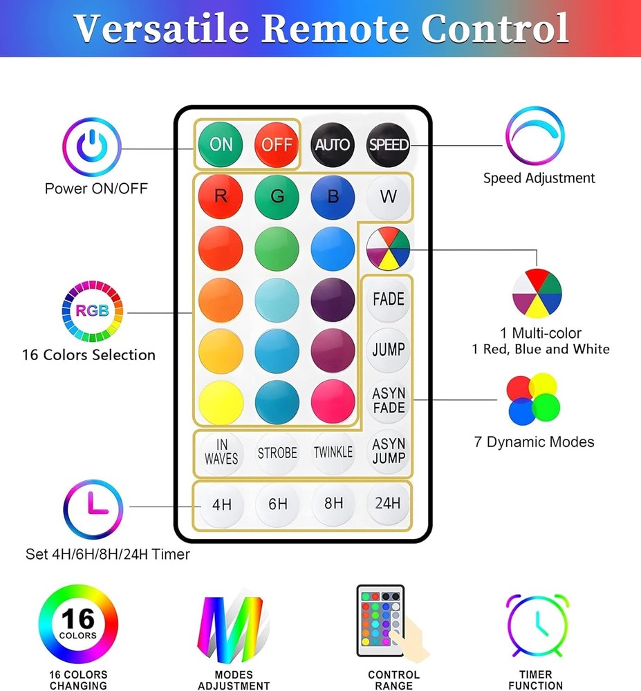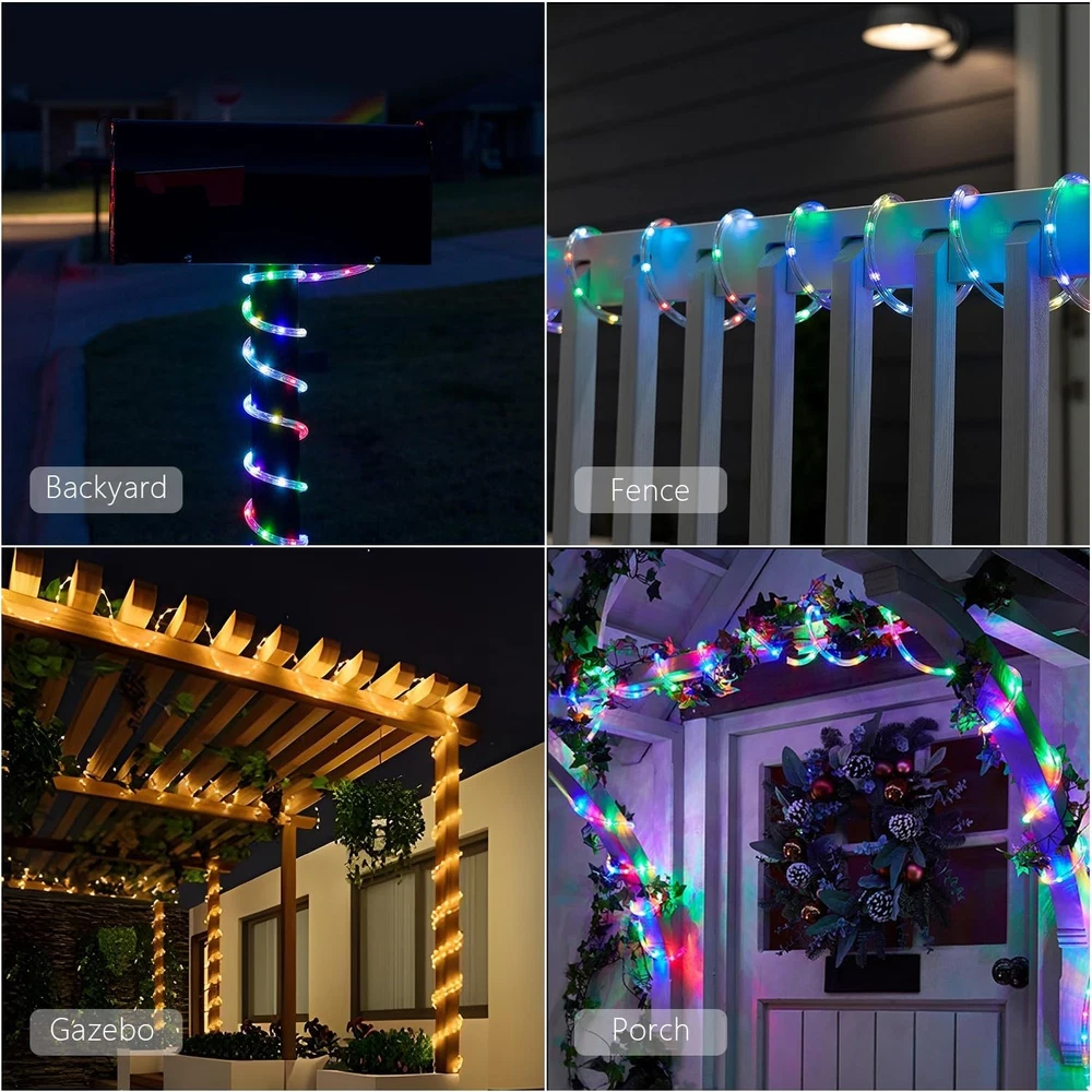 ANJAYLIA 66ft 200 LED Rope Lights Outdoor, Waterproof 16 16 colors changing Product Details Color: 16 colors changing Brand: ANJAYLIA Indoor/Outdoor Usage: Outdoor, Indoor Special Feature: Remote Controlled, Twinkling, Dimmable, Waterproof, Timer Light Source Type: LED Power Source: Corded Electric Light Color: Multicolor Theme: Halloween Occasion: Christmas, Halloween Style: Modern Material: Polyvinyl Chloride Controller Type: Remote Control Number of Light Sources: 200 Voltage: 1.1E+2 Volts Wattage: 5 watts Included Components: 1 x 200 leds tube, 1 x Lead wire with controller box, 1 x Power Adapter, 1 x User manual, 1 x Remote controller Item Weight: 1.19 Pounds Number of Items: 1 Control Method: Remote Water Resistance Level: Waterproof Seasons: autumn, winter Manufacturer: ANJAYLIA Item Weight: 1.19 pounds Package Dimensions: 6.57 x 6.57 x 2.8 inches Special Features: Remote Controlled, Twinkling, Dimmable, Waterproof, Timer Batteries Included?: No Batteries Required?: No Package Dimensions : 6.57 x 6.57 x 2.8 inches; 1.19 Pounds Manufacturer : ANJAYLIA Color: 16 colors changing Brand: ANJAYLIA Indoor/Outdoor Usage: Outdoor, Indoor Special Feature: Remote Controlled, Twinkling, Dimmable, Waterproof, Timer Light Source Type: LED Power Source: Corded Electric Light Color: Multicolor Theme: Halloween Occasion: Christmas, Halloween Style: Modern 16 COLORS CHANGING STRING LIGHTS: With 16 vibrant colors to choose from, our outdoor led lights are perfect for adding a touch of color and creativity to any occasion. Whether you want to set a romantic mood with soft pinks and reds on Valentine's Day, celebrate St. Patrick's Day with festive green, or create a fantastical ambiance with orange and purple for Halloween, these lights meet your requirements. MEMORY & TIMER FUNCTIONS: Our rope lights are equipped with a multifunctional remote that allows for your customization. With the timer function, you can set the lights to automatically turn off after 4, 6, 8, or 24 hours. The remote also allows you to adjust the speed of the 7 lighting modes with the “speed” button. Additionally, the memory function ensures that the lights will remember your last setting even after being turned off by the remote, eliminating the need to reset them every time. VERSATILE LIGHTING MODES:With 7 lighting modes to choose from, you can easily set the perfect ambiance for any occasion. The available modes include Fade, Jump, ASYN Fade, ASYN Jump, In Waves, Strobe, and Twinkle. With upgraded color options available, you can brighten up your Christmas decorations with multicolored modes. If you're decorating for July 4th, simply press the multicolor button twice to switch to the red, white, and blue lighting modes. IP67 WATERPROOF: Our led rope lights are designed to withstand various weather conditions, including rain, wind, snow, and fog, making them an ideal choice for outdoor & indoor decorations. Whether you're hosting a party, celebrating Christmas, Halloween, Thanksgiving, or any other special occasion, our rope lights are a perfect addition to your decor. WIDELY INDOOR & OUTDOOR USED: The IP65 waterproof rating of these led rope lights outdoor waterproof makes them suitable for a wide range of indoor and outdoor uses. You can wrap them around a tree, backyard fence, or porch for a festive touch, or use them to decorate your living room or bedroom. They're also great for outlining your deck, window, door, pathway, or walkway. EASY TO INSTALL: The sturdy yet thin covering makes it easy to wrap the lights around any surface or object. Additionally, our colored rope lights are lightweight, making them easy to maneuver and install. The lightweight design allows for simple installation using either clear packing tape or clips.