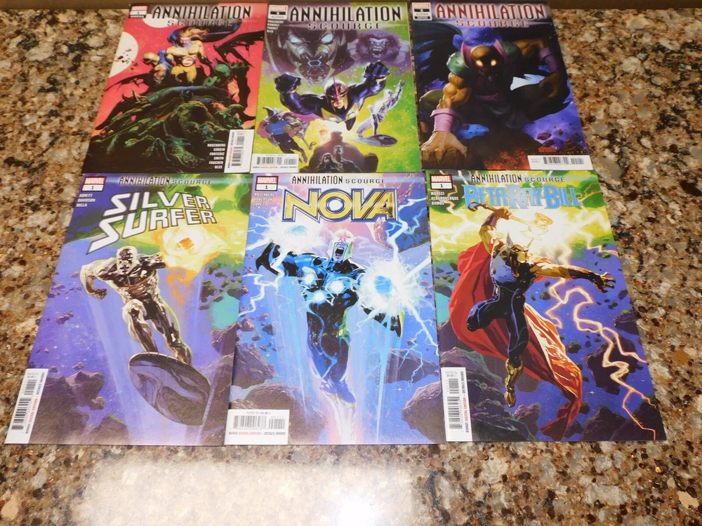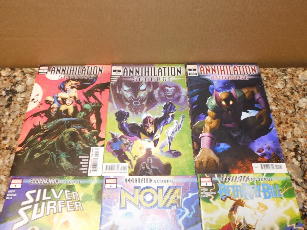 Annihilation Scourge Alpha 1 (reg & var) Omega 1 Nova 1 Beta Ray Bill 1 Silver Surfer 1 High grade set missing only the Fantastic Four crossover to be complete. All my own pick ups on NCBD. All books will be bagged and boarded even though shown without them. If you're interested in multiple lots, I will combine shipping. Please contact me first before buying several of them so I can adjust shipping per listing and avoid having to send refunds after the fact. Thanks. Ask questions as needed. No returns but I always handle problems. Priority Shipping is my standard form to use. Please, no complaints about shipping costs, they're out of my control and I use it to get you your items quickly. It literally costs me aprox $10 to ship 1 padded envelope under a pound to the west coast. I charge a little less. Tracking will be posted for everything shipped. High dollar items will be insured. Shipping only to what is verified through ebay. All items are in my possession. All photos are real time photos of items. Hello! Back after a long hiatus. Ebay 100% seller from 2003 - 2019. Seems like a lot has changed since then (especially shipping costs!), but I'll be trying it out again and see where it takes me. I sell books from my PC and also pick up books and other items to resell. I handle every item from listing to shipping personally. I pack items securely like I was shipping to myself.