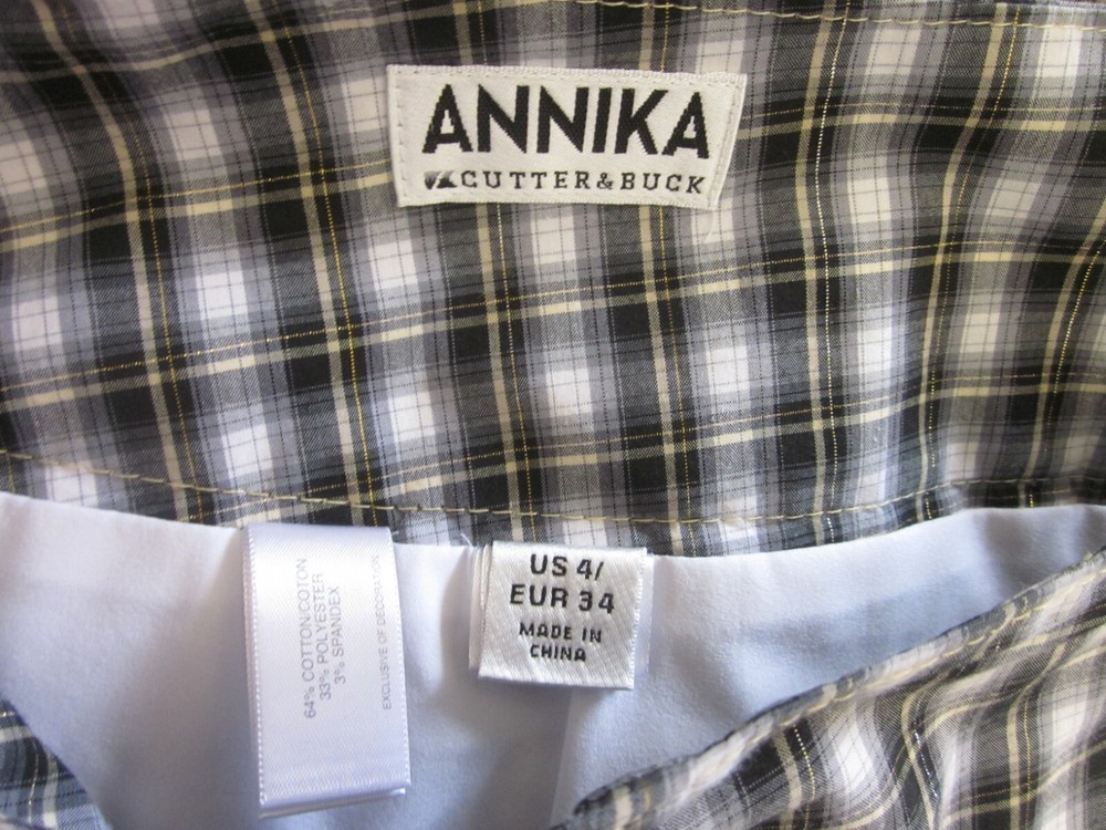 Style:SkortBrand:Annika by Cutter & BuckType:SkortColor:Black/White/YellowSize:4Pattern:PlaidDepartment:WomenPerformance/Activity:GolfSeller Notes:“Very good used condition”Material:Cotton/Poly/Spandex