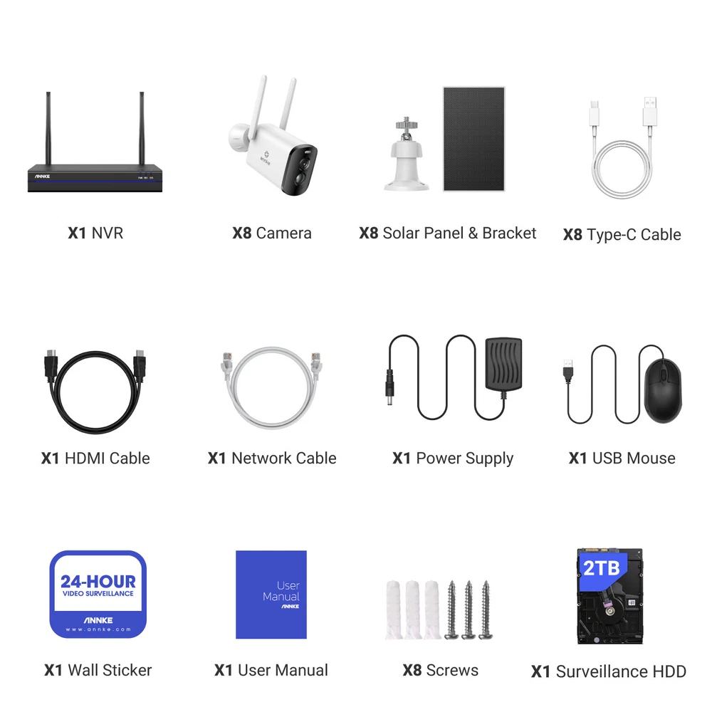 ANNKE Home Surveillance 1080P TVI Camera System 5MP TVI Camera System 4K TVI Camera System 5MP POE Camera System 4K POE Camera System 12MP POE Security Camera Kits Wireless IP Camera System SANNCE Home Surveillance 1080P TVI Camera System 1080P ColorVu Camera System 5MP TVI Security Camera System 3MP POE Camera System 5MP POE Camera System 8MP POE Camera System Wireless Camera System CCTV Camera DVR/NVR CCTV Accessories POE IP Security Cameras 【 Please Note 】 This NVR will be shipped at random from Oct,8th,2024, thanks. ebay2023 ANNKE WBS400 4MP 10-CH 100% Wire-Free Security Camera System Easy to Install, No Cables Hassle See Clearly Even in the Night 4MP full HD brings you clear images with stunning details. The camera automatically turns into color night vision once a human is detected, and you can see clarity whether day or night. (up to 50ft IR night vision and up to 33ft full-color night vision) Scare the Intruders Away The two-way talk function of this camera allows you to communicate with the person who stands under this camera, once you find there are intruders, you can take action instantly and scare them away. Focus on What Matters This camera focuses on human detection, offers you more accurate alerts and reduces false alarms caused by insects, pets and so on. Meanwhile, it receives app & email alerts only when it detects persons. PIR Detection & Siren Alarm Built-in PIR motion sensor, and the camera will activate the audible and light alarms once spot strangers loitering around your home, ward off the intruders for your peace of mind. Powered By Solar Panel It supplies the power from the sun, you just need to place it in direct sunlight to charge. Providing you with non-stop security and no need to manually charge. Monitor Wherever You Want You can customize the areas of your home you want to surveillance via this camera. Other unselected areas will not be recorded, fully protect your privacy. Wireless Connection, Simple Plug & Play This camera supports wireless to the wireless kit, this security system can not only work well to guard your home but also it's easy for you to install it. Support Work with Alexa This camera system supports working with Alexa, so you can access this system to see live views just via voice command when you're busy. Flexible Storage Options Don't worry about running out of storage space any more. Whether cloud storage or NVR local storage, you can choose any of them according to your needs. Please note that Micro SD Card supports a max of 128GB, NVR supports up to 6TB HDD. IP66 Weather-Resistant This camera is built with IP66 weatherproof, coming with rain and shine, it withstands all weather, even extreme high and low temperatures(-10℃-45℃). NVR Video & Audio Video Compression H.264+ IP Video Input 8CH + 2CH Video Output HDMI and VGA up to 1080p Audio Output Support Max Recording Resolution Up to 5MP Max Playback Resolution Up to 5MP Max Playback Channel 4CH Max Playback Capacity 4CH 3MP/2CH 5MP Hard Drive HDD 1 SATA Interface HDD Capacity Up to 6TB Capacity External Interface Network Interface RJ45 X1 (10/100/1000 M) Wireless Antenna 2 Ports (IEEE802.11b/g/n USB 1X USB 2.0 WiFi 2.4 GHz (Built-in Antenna) General Housing Metal for Main Par Operating Power DC 12 V Power Consumption) 6W (Without HDD) Working Temperature 14 °F ~ 131 °F/-10 °C ~ 55 °C Camera Lighting Frequency Image Sensor 1/3" Progressive Scan CMOS Video Compression H.264, H.265 Max resolution 2560 × 1440(4MP) Audio Compression AAC AI Function Human detection, vehicle detection, pet detection, package detection, activitiy zone Video Storage Cloud storage, local Micro SD card (up to 128 GB), and mobile phone memory Lighting Frequency 50 Hz, 60 Hz Lens 4 mm Frame Rate 15 fps Angle of View 102.9° diagonal, 86.4° horizontal, 46.1° vertical Light Source For Night Vision White light or infrared LED switchable Protocols Supported TCP/IP, UDP/IP, DHCP, RTMP, MUTP Wireless Standard 2.4 GHz Wi-Fi (IEEE 802.11 b/g/n) IP Address Type Dynamic IP address Recording Method Alarm triggered recording, and manual recording Wake-up Method PIR body induction wake-up and remote wake-up Alarm Notification Alarm push by mobile app, white LED flashing and alarm sound warning Indicator RGB tri-color LED Capacity 5200 mAh Removability Unremovable Working Time 8 months (recording 20 pieces of 10-second video per day; pan & tilt unused) Standby Time 2 years General Charging Voltage 5 V ±5% Charing Current 1.5 A Charging Time 15 hours Protection Over-charge, over-discharge, over-current, short circuit and charging protection at high and low temperature Standby 1.48 mW Power TYPE-C Daytime Working 0.95 W Storage Micro SD card Nighttime Working 1.54W Key Power key and reset key Installation Method Wall mount, ceiling mount, desktop Storage Temperature -20 ℃ ~ 60 ℃ Bracket Type 1/4'' universal screw hole Dimension 54(L)mm x 118(W)mm x 81mm(H) (without bracket) Dustproof and Waterproof IP65 Bare Weight 330 g Operating Temperature -10 ℃ ~ 45 ℃ Material ABS + PC Color White
