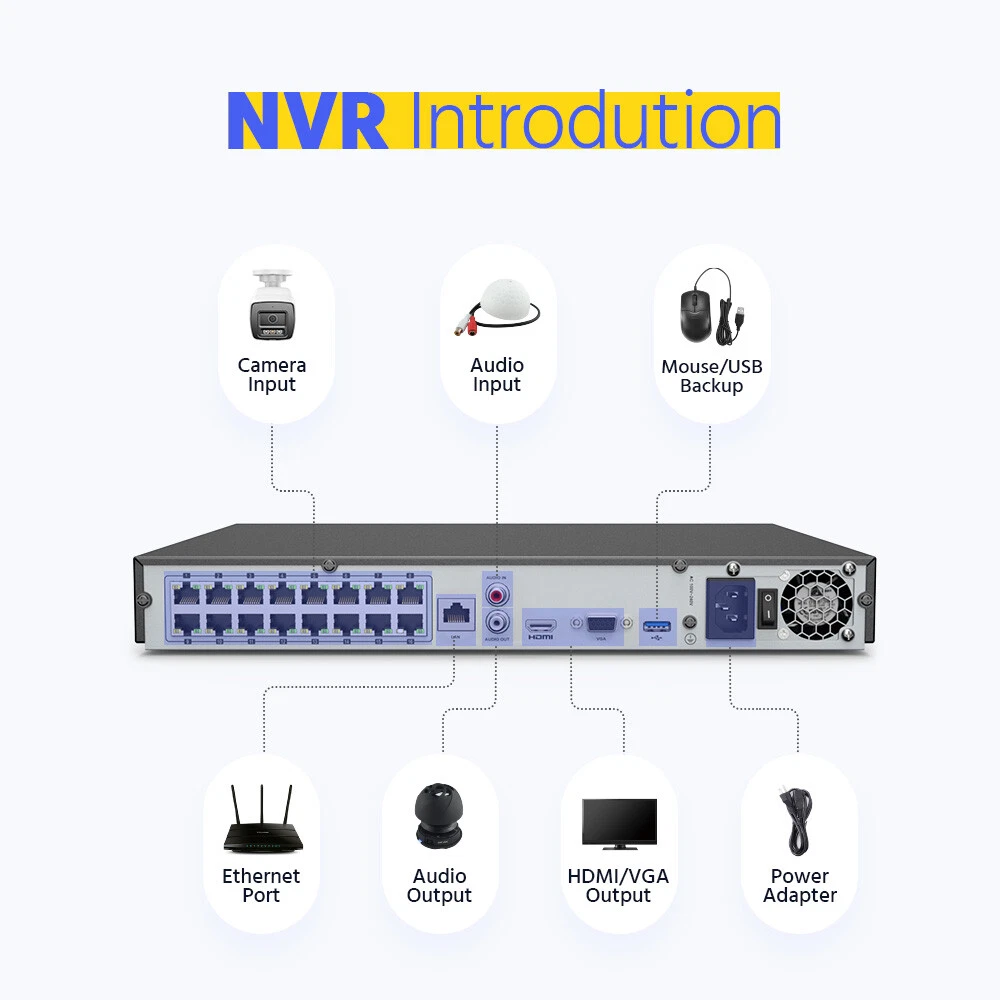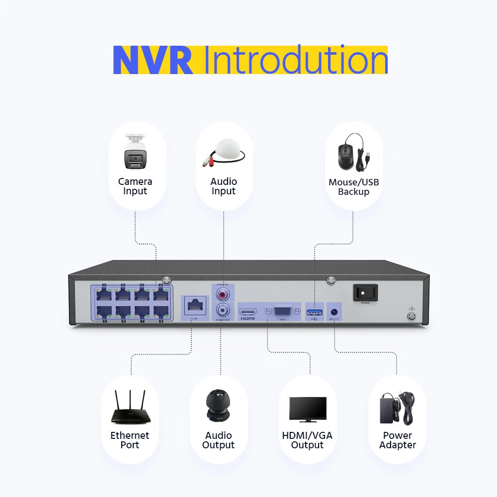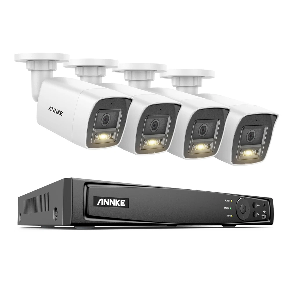 Audio Input: Built-in Microphone, record with audio Surveillance NVR Feature 3: E-mail alert, Multi-Channel Playback, Real Time Surveillance Technology: IP/Network Image Enhancement: BLC, HLC, 3D DNR NVR Recording Mode: Continuous, Time Scheduled, Motion Detection Video compression: H.264+/H.264/H.265/H.265+ Angle of View: Horizontal FOV 78°, vertical FOV 38°, diagonal FOV 96° Maximum Resolution: 3840*2160 Min. Illumination: Color: 0.005 Lux @ (F1.6, AGC ON), B/W: 0 Lux with IR Power Source: Wall Plug-In Compatible Brand: ANNKE/Hikvision/Reolink/Dahua/Swann/Amcrest Location: Indoor/Outdoor Supplement Light Type: Smart Dual-Light, IR, White Light Motion detection 2.0: Supoort, include Human & Vehicle detection Wide Dynamic Range: 120 dB WDR Supplement Light Range: Up to 100ft/30m Camera Lens: 4mm Items Included: Alarm, Camera, Infrared Detector, Motion Sensors, Remote Control Image Sensor: 1/2.4" Progressive Scan CMOS Privacy Mask: 4 programmable polygon privacy masks Camera Feature: 3840*2160(8MP) Surveillance NVR Feature 1: Up to 12MP(4096 X 3072), 12MP Live view, recording&playback General Function: Rotate mode, mirror, password protection, remote access Features: E-mail Alerts, Infrared/Night Vision, Motion Detection, Power over Ethernet (PoE), Weatherproof, 8MP high definition Real-time live viewing, Night Vision, Outdoor/Weatherproof, Waterproof, Wall Mounted, Audio Recording, Built in Microphone, 3D DNR, 120dB WDR, IP67, Smart Human&vehicle Detection, Multiple Language Support, Color Night Vision Number of Channels: 16 Manufacturer Warranty: 3 years API: Open Network Video Interface Version Storage Capacity: NO Hard Drive, 1TB, 2TB, 3TB, 4TB, 6TB, 8TB Smart Home Protocol: Infrared Number of Cameras Included: 4, 8, 12, 16 Model: H800 Remote View: iPhone®,iPad®,Android™PC:Windows System IE Color Mode: Color Brand: ANNKE MPN: AU-N46PCK-V4-91DL Connectivity: Wired Type: Bullet