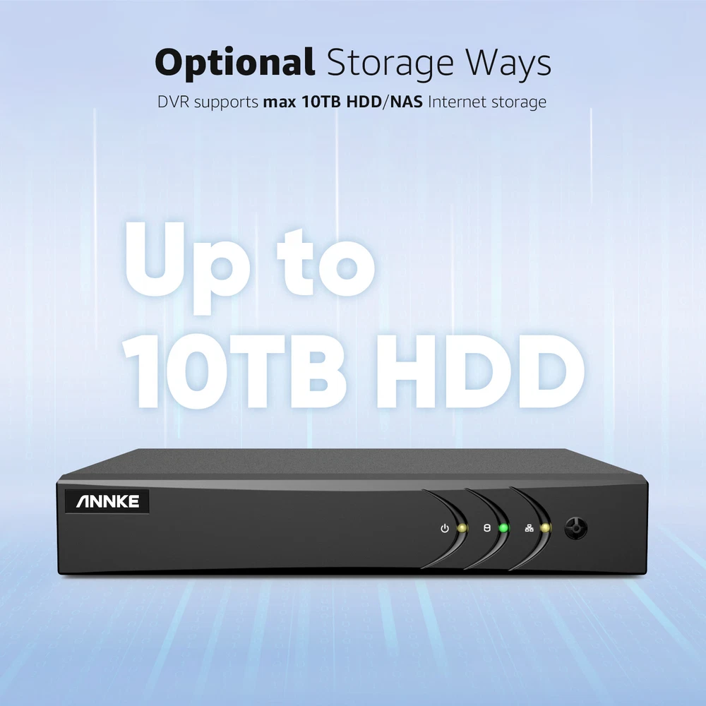 ANNKE Home Surveillance 1080P TVI Camera System 5MP TVI Camera System 4K TVI Camera System 5MP POE Camera System 4K POE Camera System 12MP POE Security Camera Kits Wireless IP Camera System SANNCE Home Surveillance 1080P TVI Camera System 1080P ColorVu Camera System 5MP TVI Security Camera System 3MP POE Camera System 5MP POE Camera System 8MP POE Camera System Wireless Camera System CCTV Camera DVR/NVR CCTV Accessories POE IP Security Cameras ebay2023 ANNKE E200 ANNKE 1080P Full HD CCTV Security Camera System Promise Clear Video, See More Details 1080P Guards You Day & Night Different from 720P vague image quality, this 1080P high definition camera provides crisp video footage, and captures things you care about at the resolution of 1920*1080. Your sense of security can be maximized with this non-stop digital guard. Human/Vehicle Detection & Real-time Email Alerts This DVR detects the movements of key objects like human&vehicle, which reduces up to 99% false alarms caused by leaves, lights, rain, etc. Meanwhile, you can get email alerts in real time once find there is someone loitering around your home. EXIR 2.0 Night Vision Tech & Smart IR The advanced EXIR 2.0 tech and smart IR can deliver up to 100ft long-range brighter & clearer images even in 0.01 Lux darkness, and there is no overexposed or underexposed image issue when recording videos, helping you record all night-time activities. IP66 & High-Quality ABS Housing With IP66 rating and the best ABS exterior housing, these wired cameras can stand different weather from stormy to tropical, from -40°C/-40°F to 60°C/140°F. Every detail is designed for a longer lifespan. Customized Motion Areas & Privacy Mask You can always customize motion detection with specific motion zones, like doorsteps, garages. You will receive instant alerts only when motion events happen in the customized areas. To protect your privacy, you may set up the privacy mask. The system will ignore the masked zones when recording videos. Multiple Recording Options & Smart Playback There are various recording options so you can customize it, be it 24/7 video recording, scheduled recording or motion detection recording, they're decided by your free choice. Also, smart search and playback can help you find what you want in loads of videos in a sec. Exclusive/Advanced H.265+ Video Format Compared with H.264, this DVR adapts H.265+ video compression which supports less bandwidth consumption, besides, it can offer smooth and fast videos without latency, achieving ultra-long video recording. Multiple Protection of Your Security There are many kinds of protection mechanisms to protect your safety like password activated devices, separate APP accounts, remote encryption and work even without internet. These ensure your privacy is no longer a crisis but secured in video stream transferring & downloading. Enhanced Visual Quality Equipped with digital DNR and WDR, this camera captures finer details regardless of lighting conditions, promising you all clear frames. Support 1080P HDMI/VGA Output This DVR supports HDMI/VGA outputs with up to 1080P clarity, assuring you have a good vision experience and never miss any details. Multiple Terminal Remote Access & Sharing You can perform multiple terminal remote access via this DVR. Also, you can share this access privilege with your family. Powerful 5-in-1 Hybrid DVR This expandable hybrid DVR supports different resolutions of different cameras (TVI/AHD/CVI/CVBS/IP Cam) input, and it can access 16-ch analog cam and 2-ch IP cam, if you switch to IP channel, you can access 24 IP cameras at the same time. All-Around Certified Device Every DVR & camera has passed the severe testing conducted by authorizations like UL, CE, FCC, HDMI, etc. And ANNKE App has conformed to GDPR. Strong Storage Records All This DVR not only supports a maximum of 10TB HDD but also supports NAS Internet storage input. And you will not worry about the storage and achieve hassle-free storage. 16CH DVR Video & Audio Video Compression H.264+/H.264/H.265/H.265+ Video Input 16CH Analog HD/Analog + 2CH IP Video (up to 24 channel when IP enhanced mode on) Video Output HDMI and VGA Up to 1080P Audio Input 1-ch RCA, 16-ch via coaxial cable Audio Output 1-ch RCA Supported Camera Types Support HD TVI Input: 3K/5MP@20FPS, 4MP, 3MP, 1080p, 720p; Support AHD Input: 4MP, 1080p, 720P; Support CVI Input: 4MP, 1080p, 720P; Support CVBS Input; Support IP Video Input:6MP/5MP/4MP/3MP/1080P/720P Analog HD Playback Resolution 3K Lite/5MP Lite/4MP Lite@12fps,1080p/720p@15fps Protocols TCP/IP, PPPoE, DHCP, DNS, DDNS, NTP, SADP, NFS, iSCSI, UPnP™, HTTPS IPC Playback Resolution Up to 6MP Max Playback Channel 4-ch Motion Detection 2.0 All analog channels support human and vehicle detection to reduce false alarm Hard Drive HDD 1 SATA interface HDD Capacity Up to 10TB capacity External Interface Network interface 1, RJ45 10M/100M/1000M self-adaptive Ethernet interface USB USB2.0x2 General Operating Power DC12V,≤ 20W (without HDD) Dimensions(W x H x D) 260 × 222 × 45 mm (10.2 × 8.7 × 1.8 inch) Working Temperature '-14 °F – 131 °F /-10 °C – 55 °C Weight (without hard disk) ≤ 1.2 kg (2.6 lb)(without HDD) Camera Camera Image sensor 2MP CMOS Image Sensor Video Resolution 1920 (H) × 1080 (V) Signal System PAL/NTSC Min.Illumination Color:0.02 Lux @ (F1.2,AGC ON),0 Lux with IR Frame Rate PAL: 1080p@25fps NTSC: 1080p@30fps Lens 3.6mm Number of Infra-Red LEDs 12 Night Vision Distance Up to 100ft/30m Angle of View 82.2° Wide Dynamic Range Digital WDR DNR Support IR Cut Filter Yes Video Output HD BNCx1 General Housing Plastic Color Black Operating Power DC12V Operating Temperature '-40 °F – 140 °F /-40 °C – 60 °C Indoor/Outdoor Indoor/Outdoor Weatherproof Rating IP66 Dimension (L x W x H) 3.54” x 2.76” / 89.9 x 70.1 mm Weight 0.55lbs / 250g