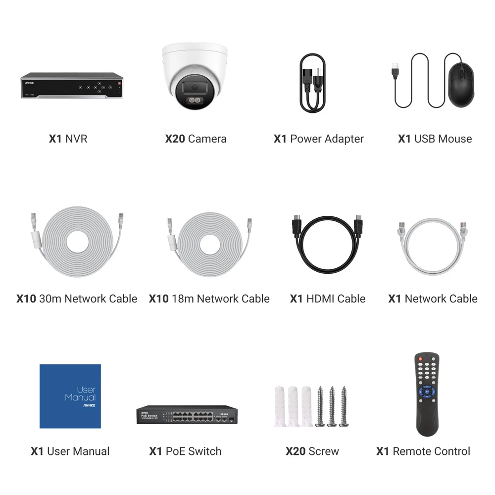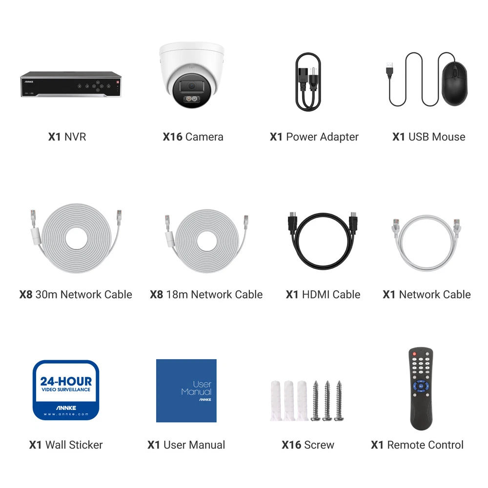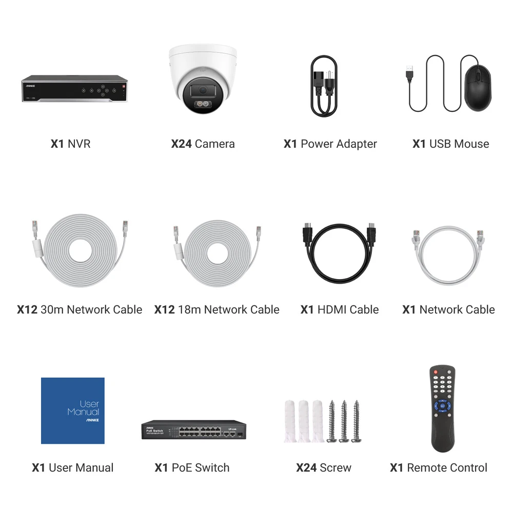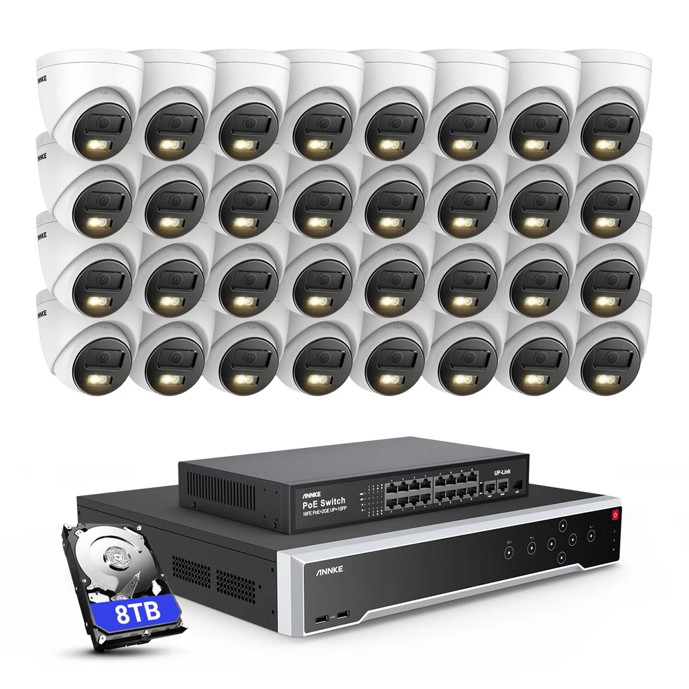 ebay2023 ANNKE H1200 32CH 12MP Smart Color Night PoE Bullet Security Camera System Multi-functional 12MP Surveillance Amazing 12MP Crisp Quality 12MP resolution with the 1/2.7" progressive scan BSI CMOS image sensor, not only delivers crisp quality with finer details but outputs 4096*3072 image scales to match the screen better, not distorted. Upgraded Human & Vehicle Detection Motion detection 2.0 adapts deep learning algorithms, which can detect and extract key objects like humans and vehicles quickly, minimizing APP false alarms pushes. Hi-Fi Audio Recording & Noise-Cancelling The cameras capture images and reveal the whole view of the given area. The built-in mic helps record videos with voice information, achieving high-fidelity noise-cancelling and increasing security coverage further. From Black & White to Color Night Vision With the default IR night vision, human&vehicle triggered, white light on and turns the vision into color; color night vision and IR night vision mode can switch each other. (100ft IR & color night vision distance) Expandable 32 Security Cameras The remarkably powerful internet video recording can connect 32 security cameras, it has built-in 16 PoE ports so that you can link to 16 cameras directly. If you want to connect another 16 cameras, you need to add a PoE switch (not included). Multiple Storage Options You can record videos with the inserted TF card slot, up to 512GB (not included) or with the NVR which built-in 4 SATA interface (support up to 12TB for each HDD, maximum 40TB capacity) for local storage, no monthly cloud storage fees. SD Card: Supported Up to 512GB Micro SD Card (Not Included) HDD: Supported Up to 48TB Hard Disk Drives (HDD Not Included) Real-time Motion Detection You can customize motion detection in every camera, you will get the app alarm notification and email alert with screenshots if there is detected motion, enhancing your security further. EmaiI: Email alert with on-scene snapshots. App: lnstant push notifications right on your mobile device. Optional Recording & Playback With the default 24/7 no-stop and auto-circulate override video recording, you can set up the motion detection recording or schedule recording. As for the playback, instantly playback, smart playback and event playback(motion detection, privacy mask, video loss/masking ) are all supported, you can choose any one of them. Customized Surveillance Areas & Privacy Mask You can customize monitor detection for specific surveillance areas, like garages, and yards. Once motion events are detected in customized zones, you will receive alerts instantly. You can set a privacy mask, then the mask area will be ignored when recording. IP67 & High-Low Temperature Resistance Rated IP67 weatherproof and the cameras are built to brave all weather. No matter torrential downpours and furious wind, or extreme temperatures as high as 140 °F & as low as -22°F. Besides, the camera can work in 1m water for 30 minutes. 120 dB True WDR & 3D DNR The 120 dB true WDR can be used in various scenes, which is not overexposed to darkness but balanced in brightness. Whether it's a backlight or not, you can see it. 3D DNR not only filters out image noise but provides a cleaner image with finer details and clearer night vision. Advanced H.265+ Video Format H.265+ saves up to 75% storage spaces compared with H.264 coding, which not only records ultra-long videos but spreads it faster. 24/7 Video Recording Even Without Internet The PoE security camera system can still work and continue to 24/7 no-stop video recording even without the network. But if you want to perform remote access with smartphones, tablets and laptops, you need to link the internet. NVR Video & Audio Video Compression H.265+/H.265/H.264+/H.264/MPEG4 IP Video Input 32 Channel (Include 16 Channel PoE) Video Output HDMI 1 up to 4K, HDMI 2/VGA up to 1080p, CVBS Audio Input/Output 1/1 RCA Video output mode HDMI1/VGA simultaneous output, HDMI2/VGA independent output Incoming/outgoing Bandwidth 256/256 Mbps Max Playback Capacity 2CH @12MP (20 fps)/4CH @8MP (25 fps)8-ch @ 4MP (30 fps)/16-ch @ 1080p (30 fps) Deep learning 32-ch Human and vehicle targets detection(Need IP camera support) IP video input 32 MP/24 MP/12 MP/8 MP/6 MP/5 MP/4 MP/3MP/1080p/720P *:After ultra HD resolution mode is enabled, the NVR supports up to 4-ch 32 MP/24 MP IP video inputs. Max Playback Channel 16CH Dual stream recording Support Network protocol TCP/IP, DHCP, IPv4, IPv6, DNS, DDNS, NTP, RTSP, SADP, SMTP, SNMP, NFS, iSCSI, ISUP, UPnP™, HTTP, HTTPS Smart Event Line crossing detection, intrusion detection, region entrance detection, region exiting detection, heat map, ANPR, and people counting(Need IP camera support) Hard Drive HDD 4 SATA Interface HDD Capacity Up to 10 TB Capacity for Each HDD(40 TB total) External Interface Network Interface 1, RJ-45 10/100/1000 Mbps self-adaptive Ethernet interface PoE 16, RJ-45 10/100 Mbps self-adaptive Ethernet interface USB Front Panel: 2X USB 2.0; Rear Panel: 1X USB 3.0 Serial Interface 1 RS-485 (Half-Duplex), 1 RS-232 Alarm Input/Output 16/4 General Operating Power 100-240V Power Consumption ≤ 20 W(without HDD and PoE off) Working Temperature 14 °F — 131 °F/-10 °C — +55 °C Dimensions (W X H X D) 440 × 387 × 75 mm ( 17.3"× 15.2" × 3.0") Weight (Without Hard Disk) ≤11 lbs. (5 kg) Camera Camera Image Sensor 1/2.7" Progressive Scan CMOS Video Compression Main stream: H.265+/H.265/H.264+/H.264 Sub-stream: H.265/H.264/MJPEG Max resolution 4096*3072(12MP) Audio Compression G.711ulaw/G.711alaw/G.722.1/G.726/MP2L2/PCM/AAC-LC Main Stream 50 Hz: 10 fps@4096*3072, 12.5 fps@(3840*2160, 3200*1800, 2688*1520, 1920*1080, 1280*720) 60 Hz: 10 fps@4096*3072, 15 fps@(3840*2160, 3200*1800, 2688*1520, 1920*1080, 1280*720) Sub Stream 50 Hz: 12.5 fps (1280*720, 640*480, 640*360) 60 Hz: 15 fps (1280*720, 640*480, 640*360) Video Bitrate 32 Kbps ~ 16 Mbps Lens 2.8 mm Audio Input Built-in Microphone, record with audio Angle of Vie