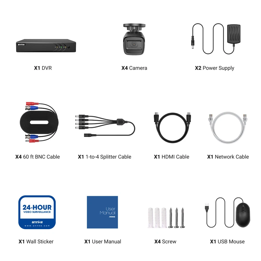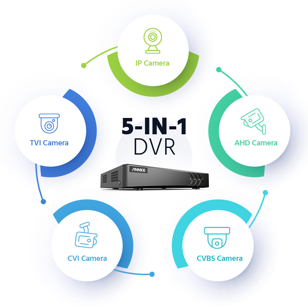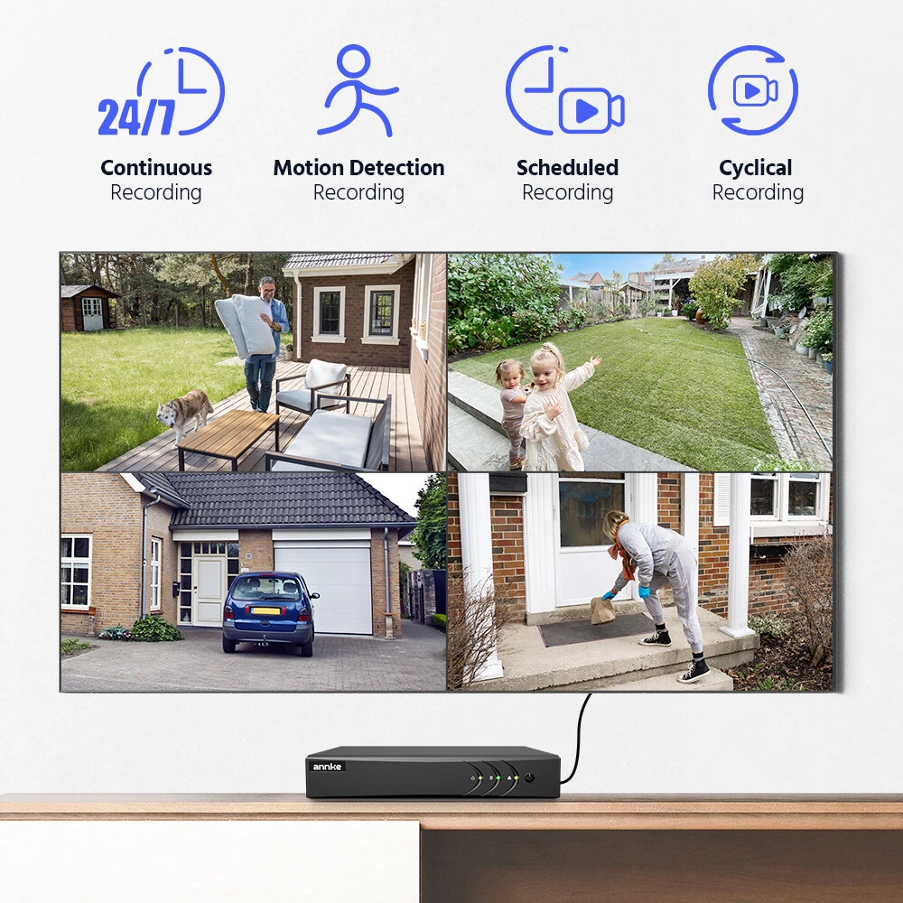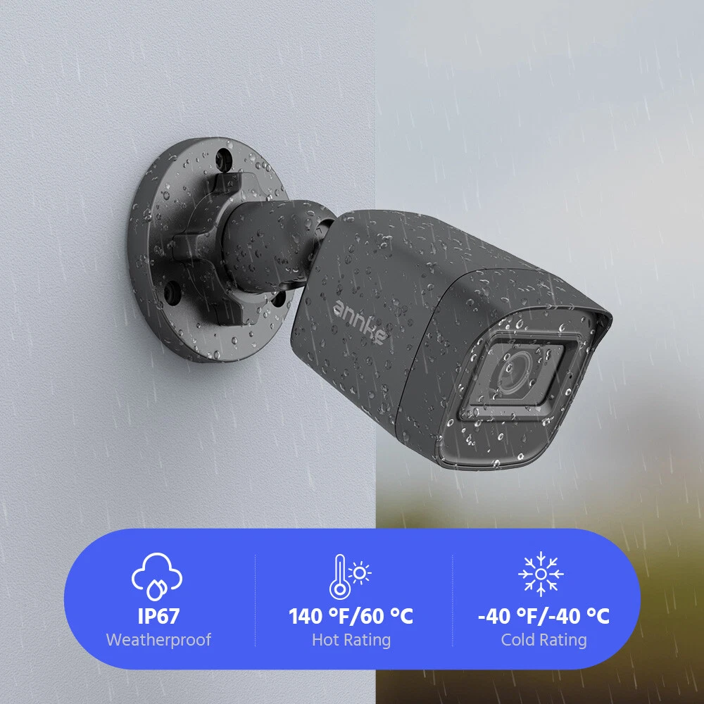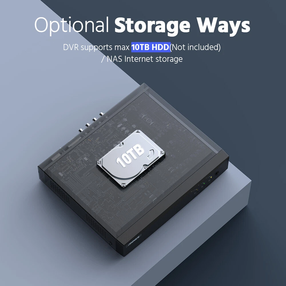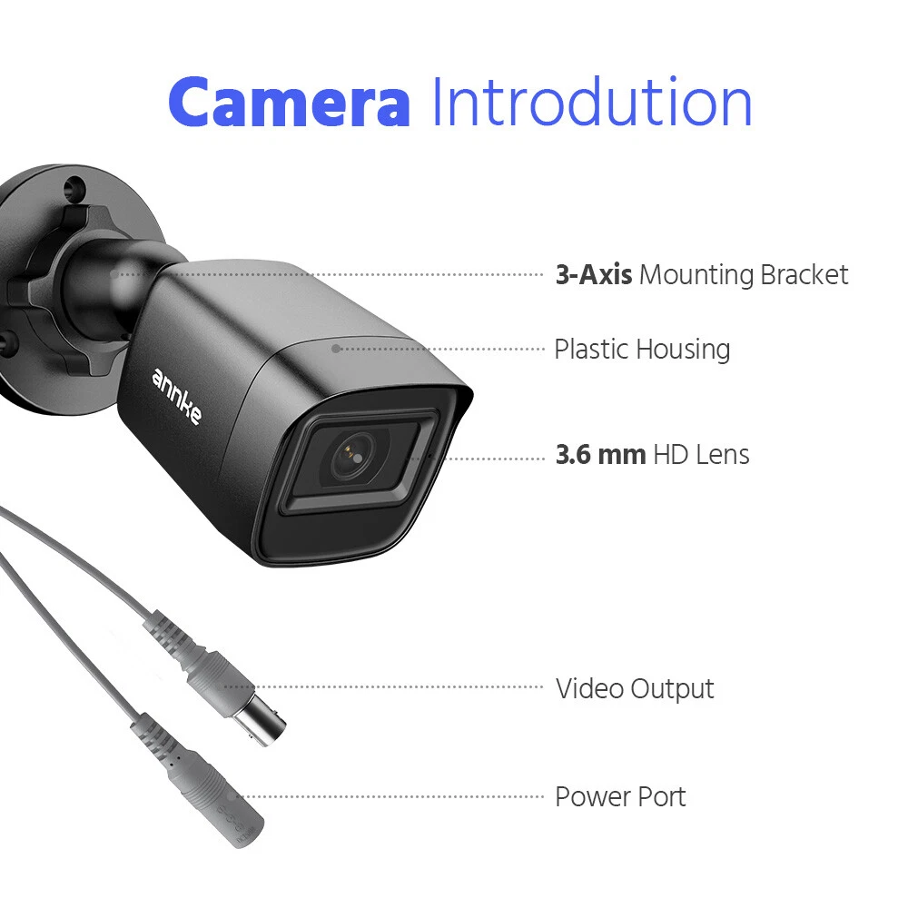 ebay2023 ANNKE E200 ANNKE 8+2CH 1080P HD CCTV Security Camera System Promise Clear Video, See More Details 1080P Guards You Day & Night Different from 720P vague image quality, this 1080P high definition camera provides crisp video footage, and captures things you care about at the resolution of 1920*1080. Your sense of security can be maximized with this non-stop digital guard. Human/Vehicle Detection & Real-time Email Alerts This DVR detects the movements of key objects like human & vehicle, which reduces up to 99% false alarms caused by leaves, lights, rain, etc. Meanwhile, you can get email alerts in real time once find there is someone loitering around your home. Powerful 5-in-1 Hybrid DVR This expandable hybrid DVR supports different resolutions of different cameras (TVI/AHD/CVI/CVBS/IP Cam) input, and it can access 8-ch analog cam and 2-ch IP cam, if you switch to IP channel, you can access 12 IP cameras at the same time. Customized Motion Areas & Privacy Mask You can always customize motion detection with specific motion zones, like doorsteps, garages. You will receive instant alerts only when motion events happen in the customized areas. To protect your privacy, you may set up the privacy mask. The system will ignore the masked zones when recording videos. Multiple Protection of Your Security There are many kinds of protection mechanisms to protect your safety like password activated devices, separate APP accounts, remote encryption and work even without internet. These ensure your privacy is no longer a crisis but secured in video stream transferring & downloading. Multiple Terminal Remote Access & Sharing You can perform multiple terminal remote access via this DVR. Also, you can share this access privilege with your family. Strong Storage Records All This DVR not only supports a maximum of 10TB HDD but also supports NAS Internet storage input. And you will not worry about the storage and achieve hassle-free storage. Exclusive/Advanced H.265+ Video Format Compared with H.264, this DVR adapts H.265+ video compression which supports less bandwidth consumption, besides, it can offer smooth and fast videos without latency, achieving ultra-long video recording. All-Around Certified Device Every DVR & camera has passed the severe testing conducted by authorizations like UL, CE, FCC, HDMI, etc. And ANNKE App has conformed to GDPR. IP67 & High-Quality ABS Housing With IP67 rating and the best ABS exterior housing, these wired cameras can stand different weather from stormy to tropical, from -40°C/-40°F to 60°C/140°F. Every detail is designed for a longer lifespan. Support 1080P HDMI/VGA Output This DVR supports HDMI/VGA outputs with up to 1080P clarity, assuring you have a good vision experience and never miss any details. Enhanced Visual Quality Equipped with digital DNR and WDR, this camera captures finer details regardless of lighting conditions, promising you all clear frames. 8CH DVR Video & Audio Video Compression H.264+/H.264/H.265/H.265 Pro+ Video Input 8CH Analog HD/Analog + 2CH IP Video (up to 12 channel when IP enhanced mode on) Video Output HDMI and VGA Up to 1080P Audio Input 1-ch RCA, 8-ch via coaxial cable Audio Output 1-ch RCA Supported Camera Types Support HD TVI Input: 3K/5MP@20FPS, 4MP, 3MP, 1080p, 720p; Support AHD Input: 5MP(20F)4MP, 1080p, 720P; Support CVI Input: 5MP(20F),4MP, 1080p, 720P; Support CVBS Input; Support IP Video Input:6MP/5MP/4MP/3MP/1080P/720P Analog HD Playback Resolution 3K Lite/5MP Lite/4MP Lite@12fps,1080p/720p@15fps Network Protocols TCP/IP, PPPoE, DHCP, DNS, DDNS, NTP, SADP, NFS, iSCSI, UPnP™, HTTPS IPC Playback Resolution Up to 6MP Max Playback Channel 8-ch Motion Detection 2.0 All analog channels support human and vehicle detection to reduce false alarm Total Bandwidth 96Mbps Remote Connection 64 Hard Drive HDD 1 SATA interface HDD Capacity Up to 10TB capacity External Interface Network interface 1, RJ45 10M/100M self-adaptive Ethernet interface USB USB2.0x2 General Operating Power DC12V,≤ 12W (without HDD) Dimensions(W x H x D) 260 × 222 × 45 mm (10.2 × 8.7 × 1.8 inch) Working Temperature '-14 °F – 131 °F /-10 °C – 55 °C Weight (without hard disk) ≤ 1 kg (2.2 lb)(without HDD) Camera Camera Image sensor 2MP CMOS Image Sensor Video Resolution 1920 (H) × 1080 (V) Signal System PAL/NTSC Min.Illumination Color:0.02 Lux @ (F1.2,AGC ON),0 Lux with IR Frame Rate PAL: 1080p@25fps NTSC: 1080p@30fps Lens 3.6mm Lens Mount M12 Night Vision Distance Up to 66ft/20 m Angle of View horizontal FOV: 76.9°, vertical FOV: 40.6° Wide Dynamic Range Digital WDR DNR 2D DNR IR Cut Filter Yes Video Output HD BNCx1 General Housing Plastic Color Black Operating Power DC12V Operating Temperature '-40 °F – 140 °F /-40 °C – 60 °C Indoor/Outdoor Indoor/Outdoor Weatherproof Rating IP67 Dimension (L x W x H) 5.47 X 2.39 X 2.28"/138.8 X 60.9 X 57.9mm Weight 0.32 lb./145 g
