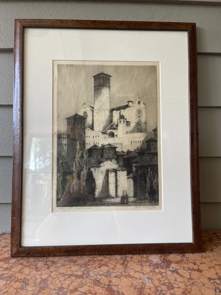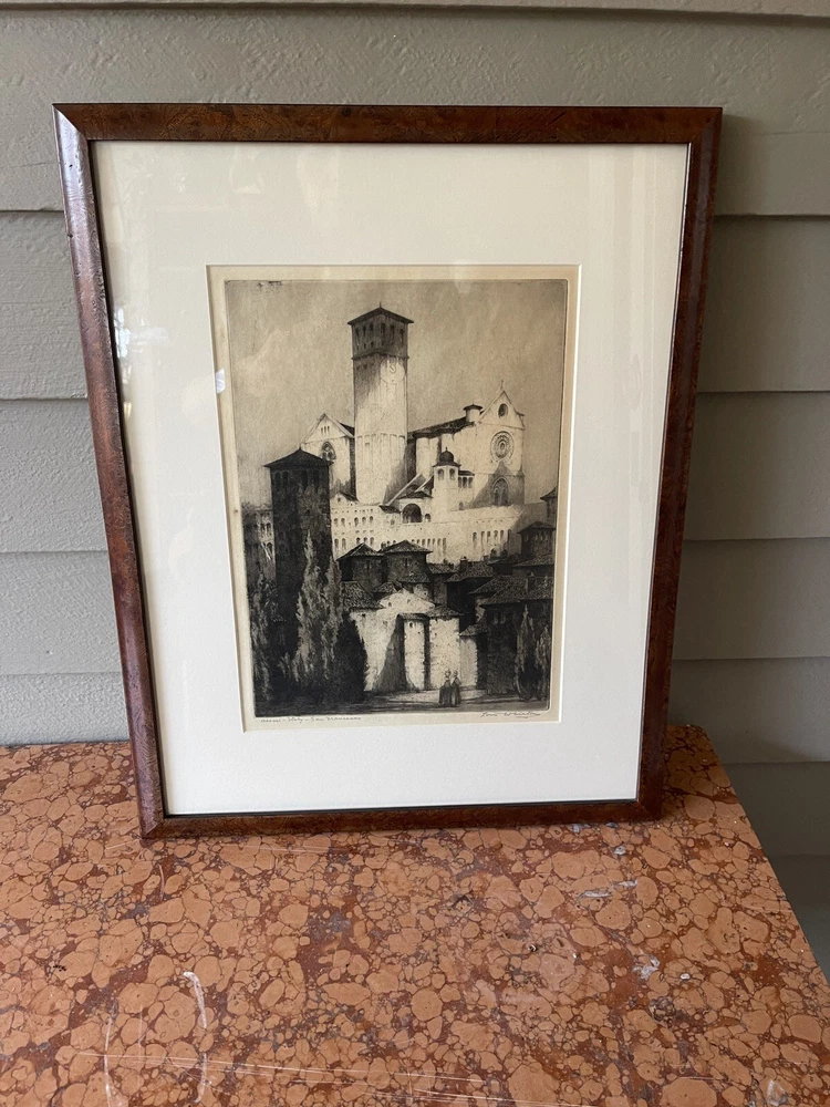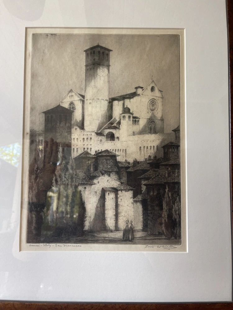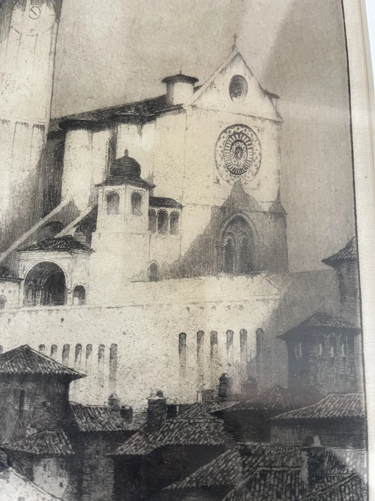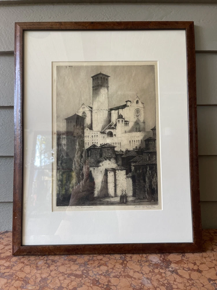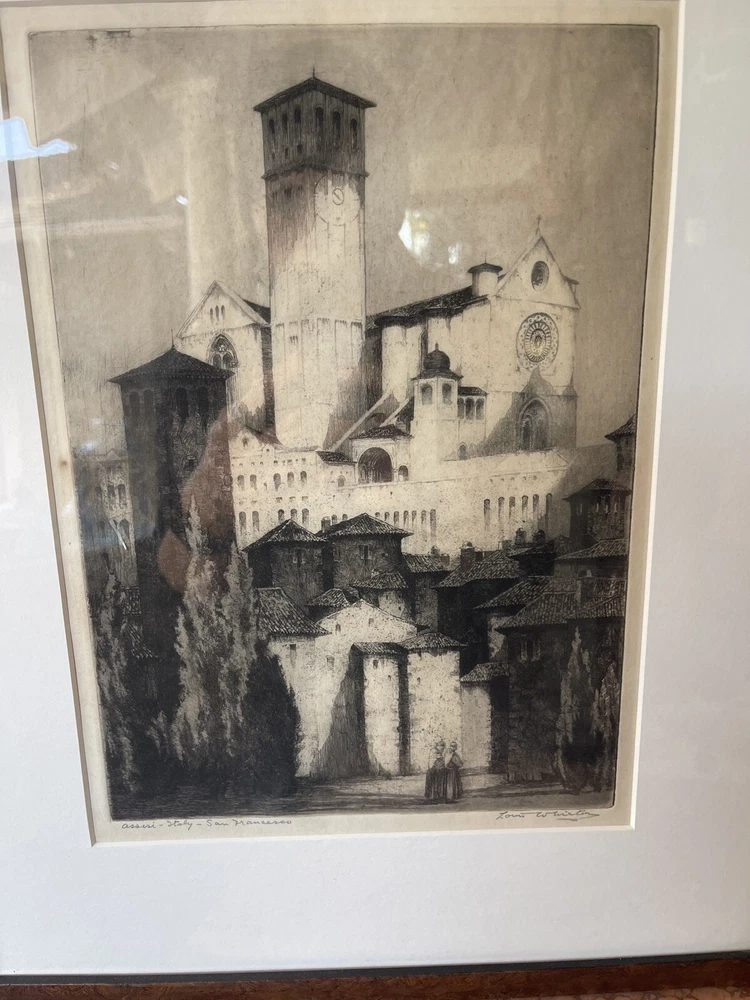 Antique Dry Point Etching (I believe) by listed artist Louis Whirter (1873-1932) Scottish. Titled: Assisi Italy San Francesco... This piece is beautifully framed and ready to hang on the wall; professionally framed & probably has plastic high grade "glass" that blocks UV light. MEASUREMENTS : It measures 15 1/2" x 19 12/" CONDITION : Overall in good condition. As shown in photos, there are a few places of light toning & foxing (left hand sides at top and close to the bottom). OFFERS : I have left Offers open, please send serious Offers. They will be considered. Thank you. Please e-mail with any questions at all. ALL SALES FINAL . SHIPPING : I do not profit from shipping. All pricing is reflective of current rates in the market. If it's too expensive, please do not purchase and then give bad shipping Stars to us sellers. Thank you for your understanding. I re-use boxes and try to re-use packing materials as well to keep costs to a minimum. And, If Item is over $100 dollars, additional insurance will be added. Please wait for invoice from me.