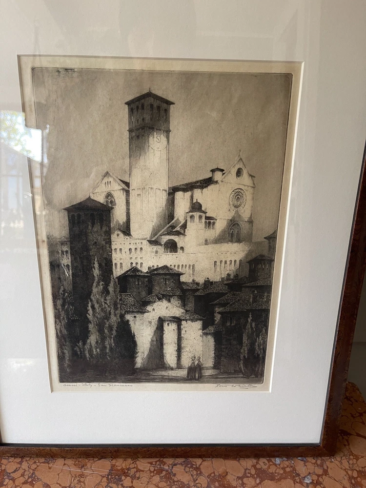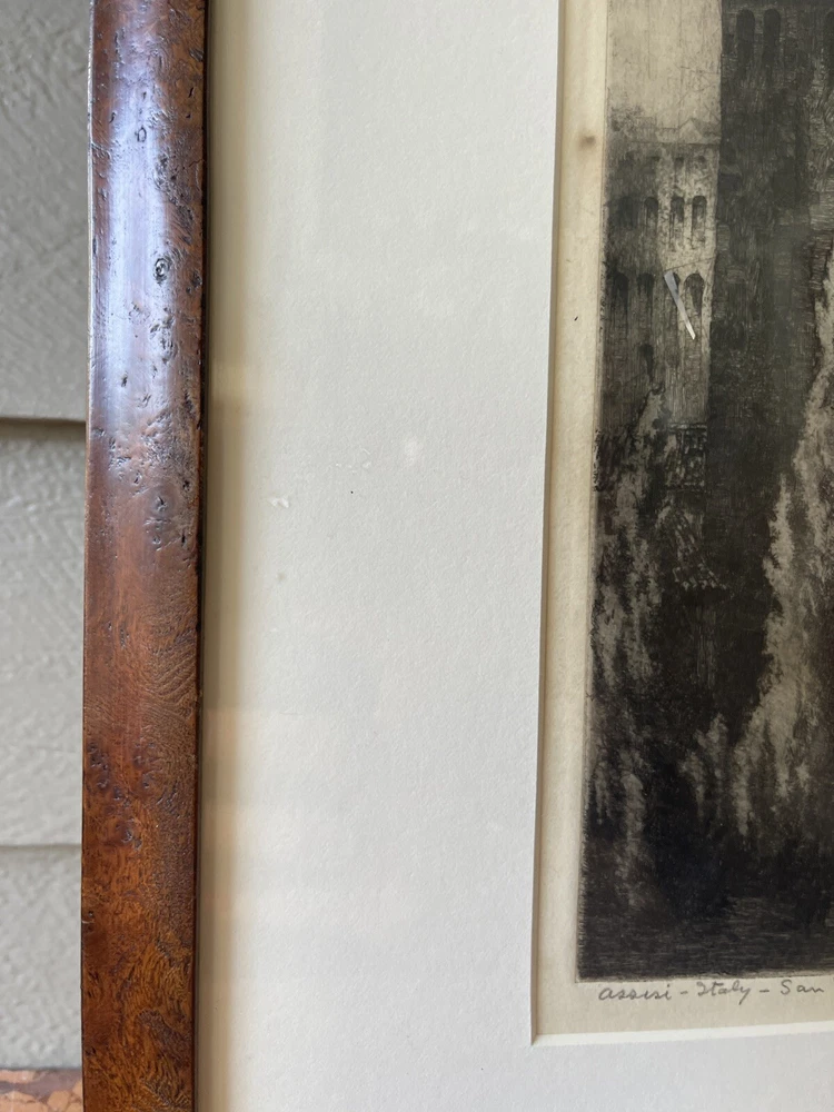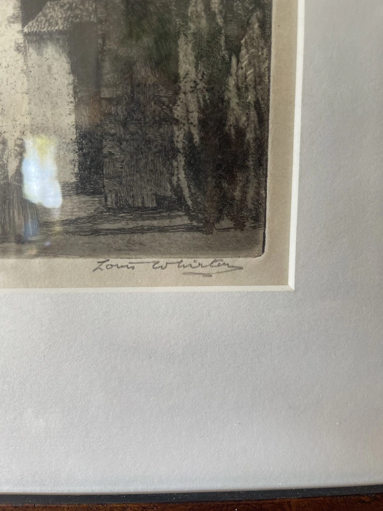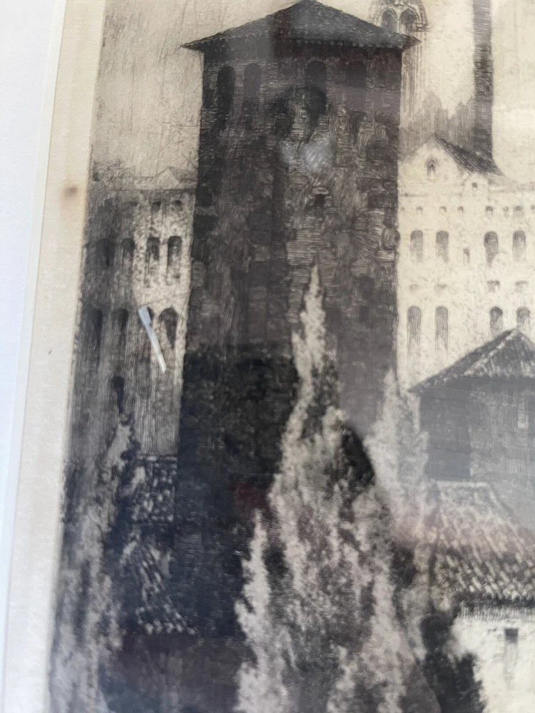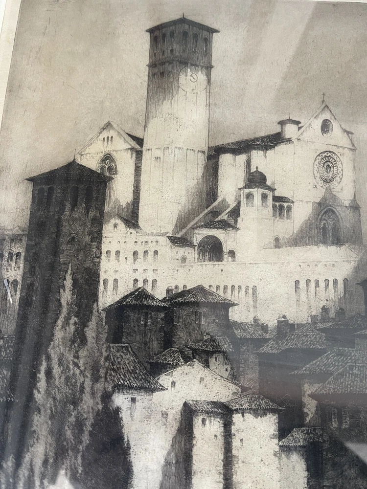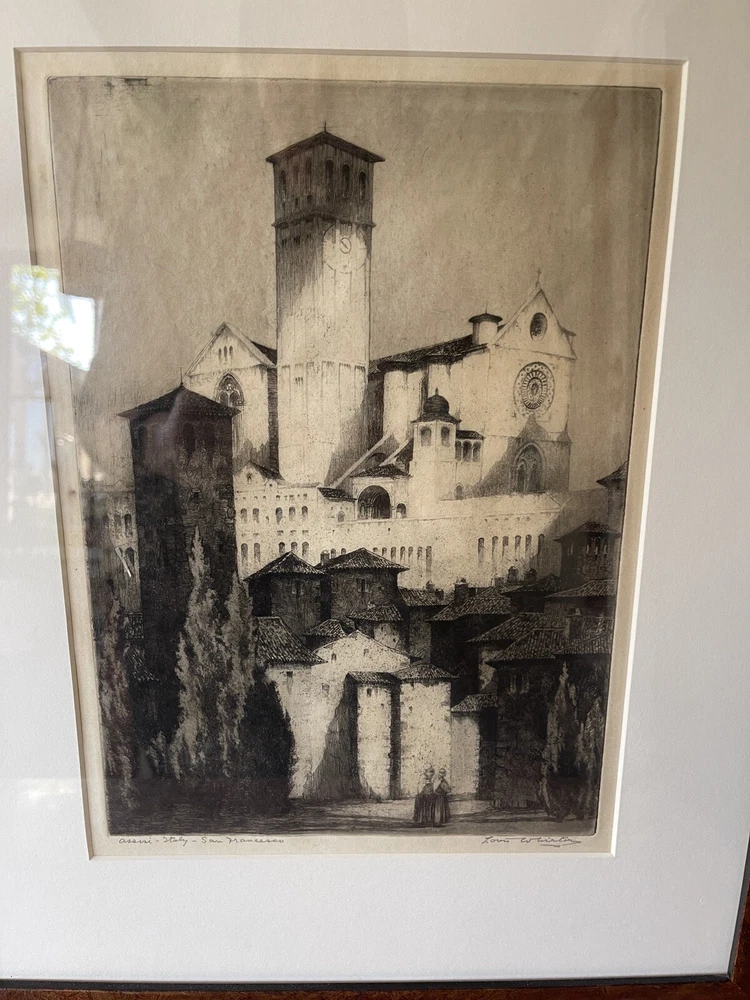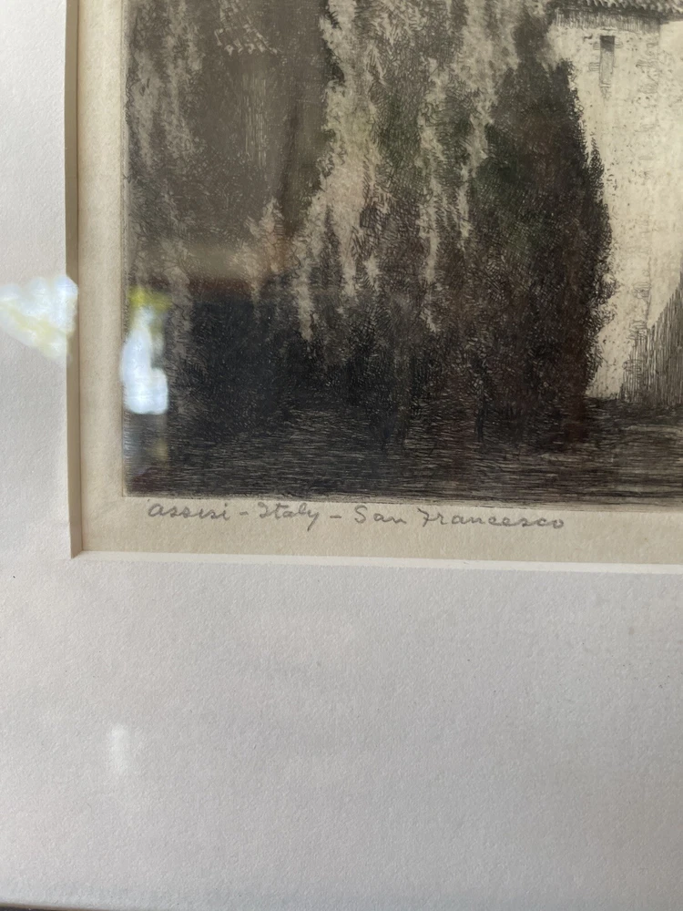 Antique Dry Point Etching (I believe) by listed artist Louis Whirter (1873-1932) Scottish. Titled: Assisi Italy San Francesco... This piece is beautifully framed and ready to hang on the wall; professionally framed & probably has plastic high grade "glass" that blocks UV light. MEASUREMENTS : It measures 15 1/2" x 19 12/" CONDITION : Overall in good condition. As shown in photos, there are a few places of light toning & foxing (left hand sides at top and close to the bottom). OFFERS : I have left Offers open, please send serious Offers. They will be considered. Thank you. Please e-mail with any questions at all. ALL SALES FINAL . SHIPPING : I do not profit from shipping. All pricing is reflective of current rates in the market. If it's too expensive, please do not purchase and then give bad shipping Stars to us sellers. Thank you for your understanding. I re-use boxes and try to re-use packing materials as well to keep costs to a minimum. And, If Item is over $100 dollars, additional insurance will be added. Please wait for invoice from me.