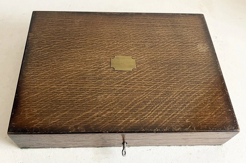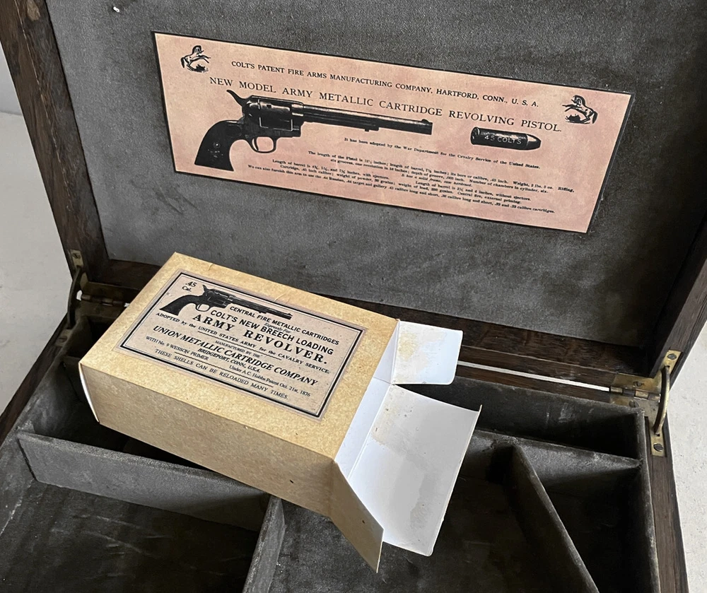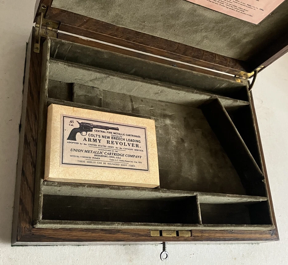 Antique Oak Case Recently Converted and Fitted out in Olive Green Cotton Velvet Lining to Take a Colt Single Action Army (Peacemaker) Revolver with a 4.75 inch Barrel (Not Bisley Model). Please Note this Case takes an Original Colt Snugly so it May Not take all the Clones and Will Just take the 5.5 Barrel as Well as the 4.75. Case has Brass Hinges and Working L ock with Key. Comes with the Empty Dummy Cartridge Box Shown (Contains NO Ammunition). Please Be Aware That Most of My Cases Are Old Antique Ones So Most Will Come With Some Sort of Marks, Digs or Scratches Etc on the Exterior Due to Age and Use. Anything Bad Like Large Splits Across a Lid or Warping I Will Always Mention. Most Are Intended for Antique Guns So the Aged Used Look is Better Suited and Please Remember what an Original Case would Cost You. Please Ask Any Questions Before Purchase Like is it Original Gun Case? NO Look at the Price.