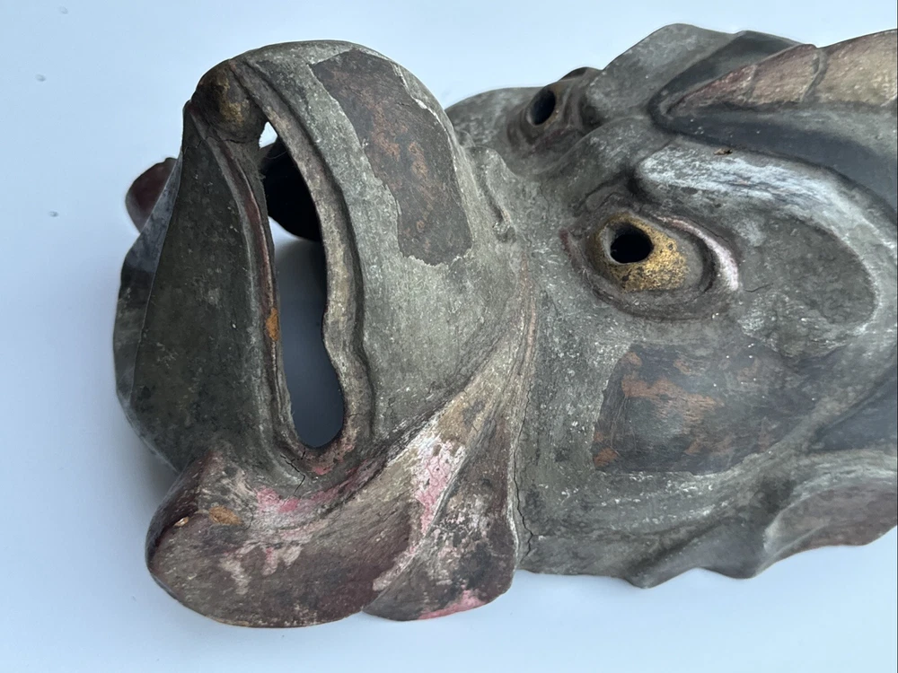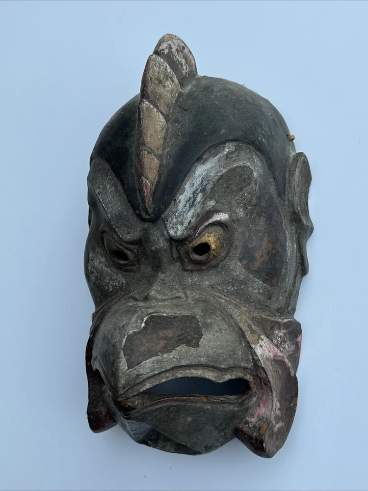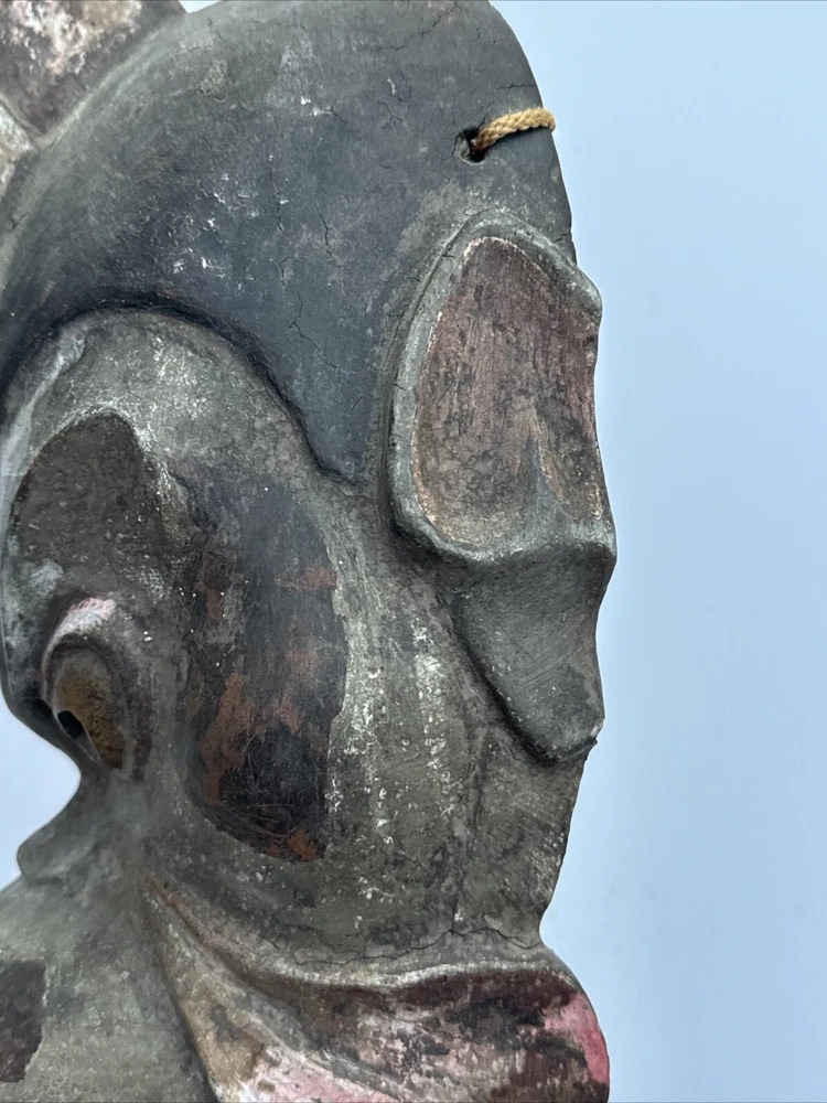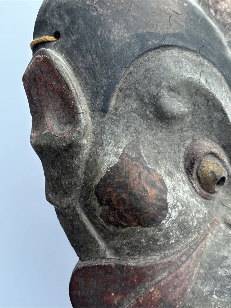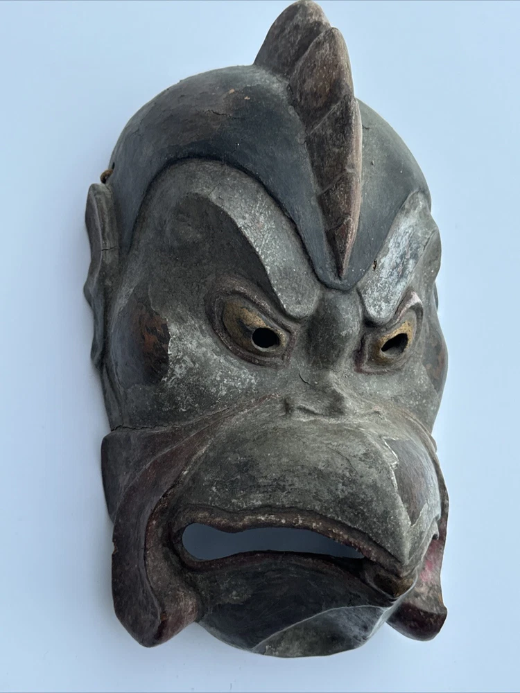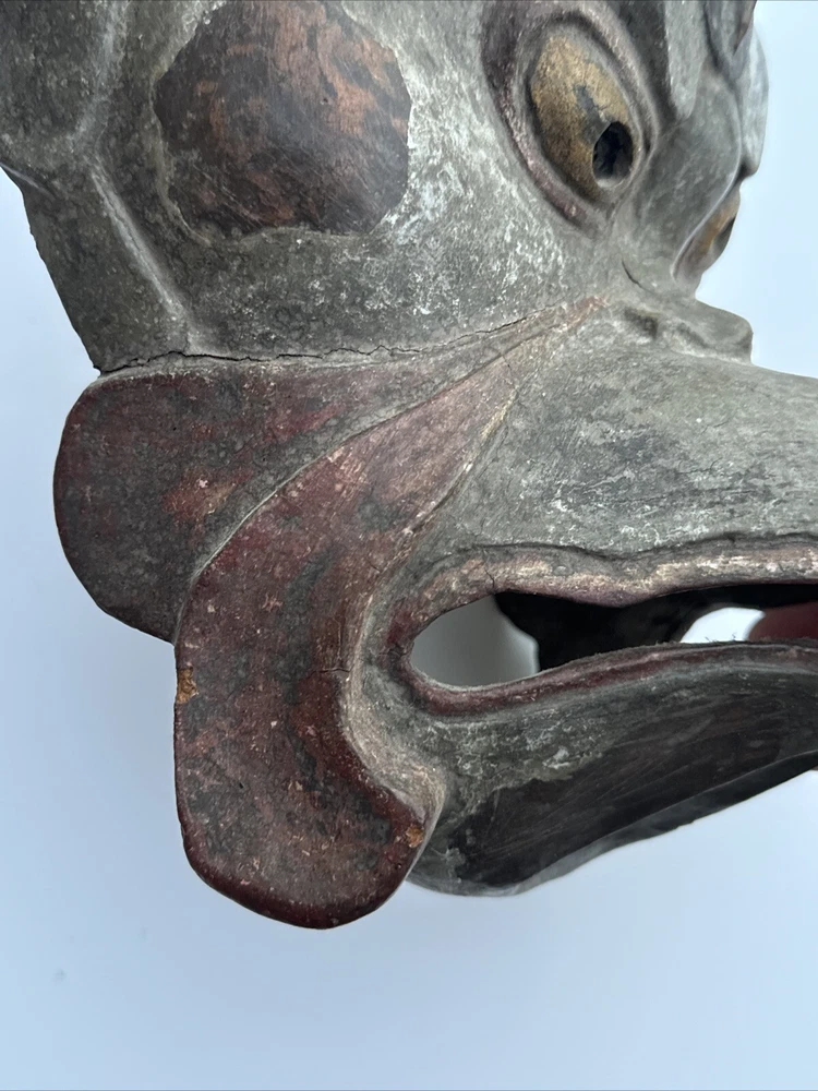 ANTIQUE JAPANESE SIGNED MASK PAINTING CARVING THEATRE MANBIRD FACE HEAD RELIC