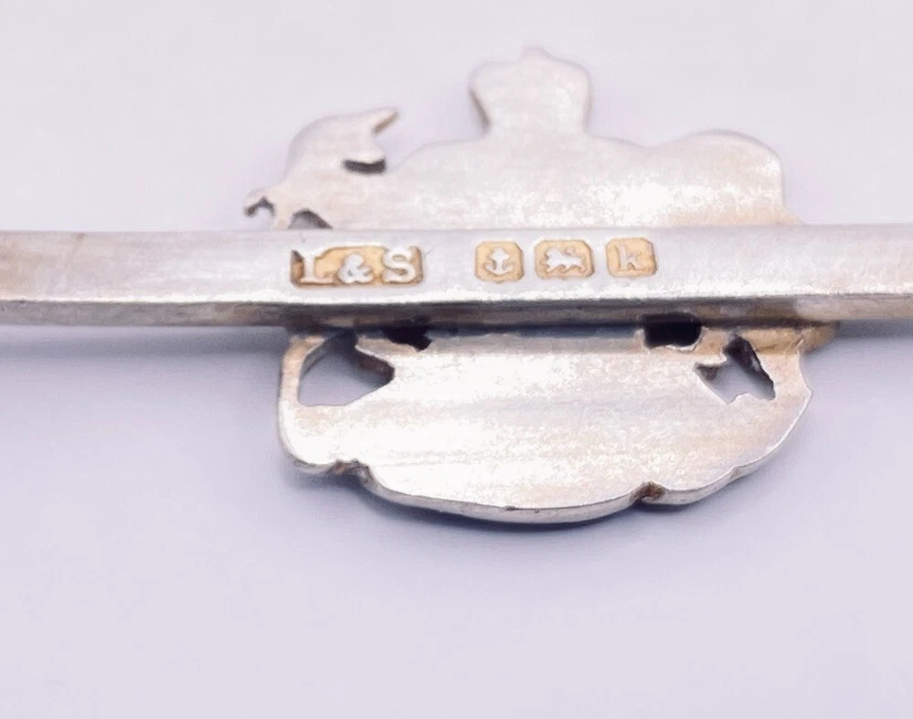 ANTIQUE SILVER LEVI & SALAMAN 1909 EDWARD VII ROYAL STANDARD BAR PIN BADGE. THE BAR PIN BADGE IS IN VERY GOOD CONDITION WITH NO VISIBLE LOSS TO ENAMEL. THE SIZE OF THE BAR PIN IS LENGTH OF 46 MM; THE ROYAL STANDARD SIZE IS 15 MM X 17 MM. THE WEIGHT IS 4.5 GRAMS. CUL1B3