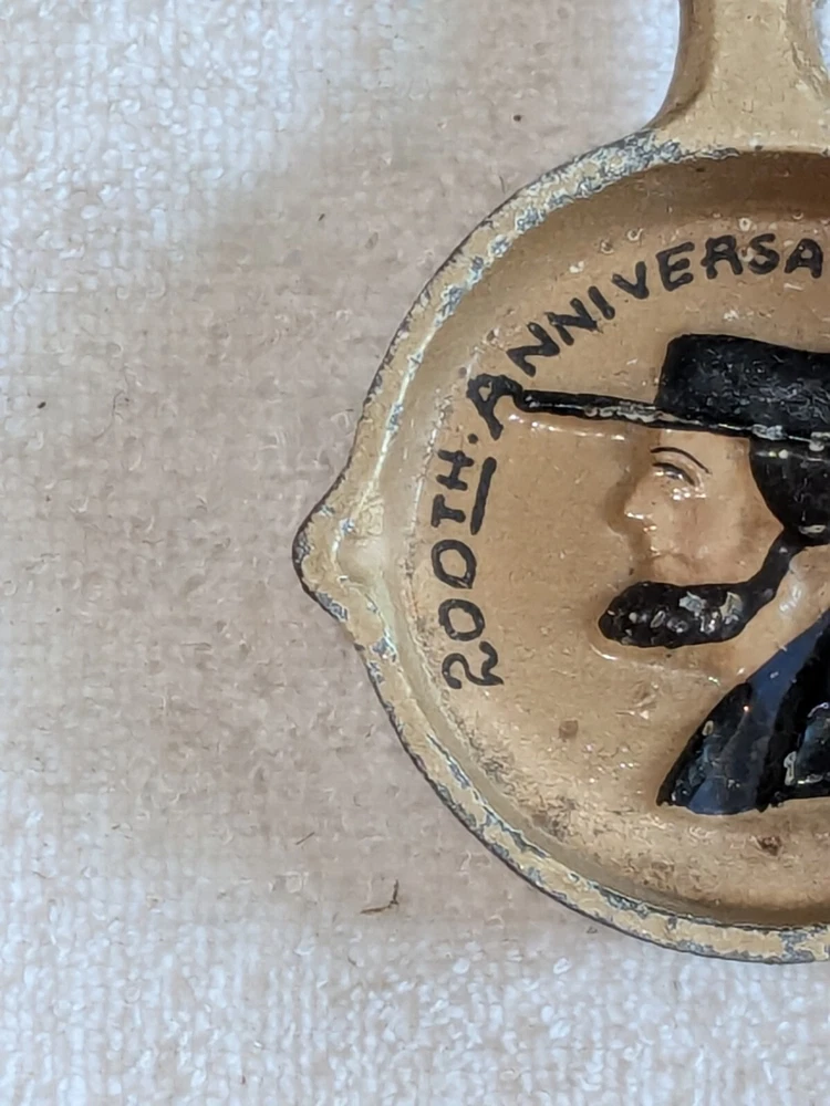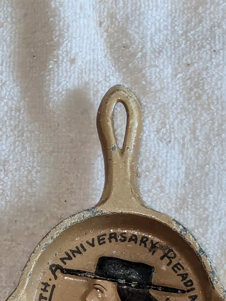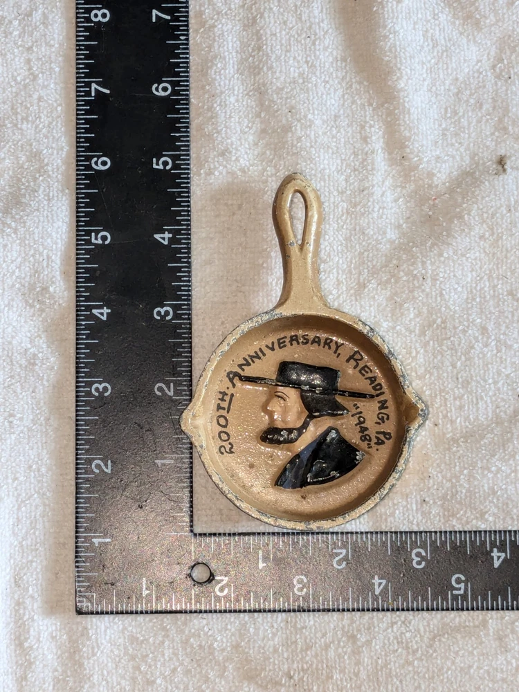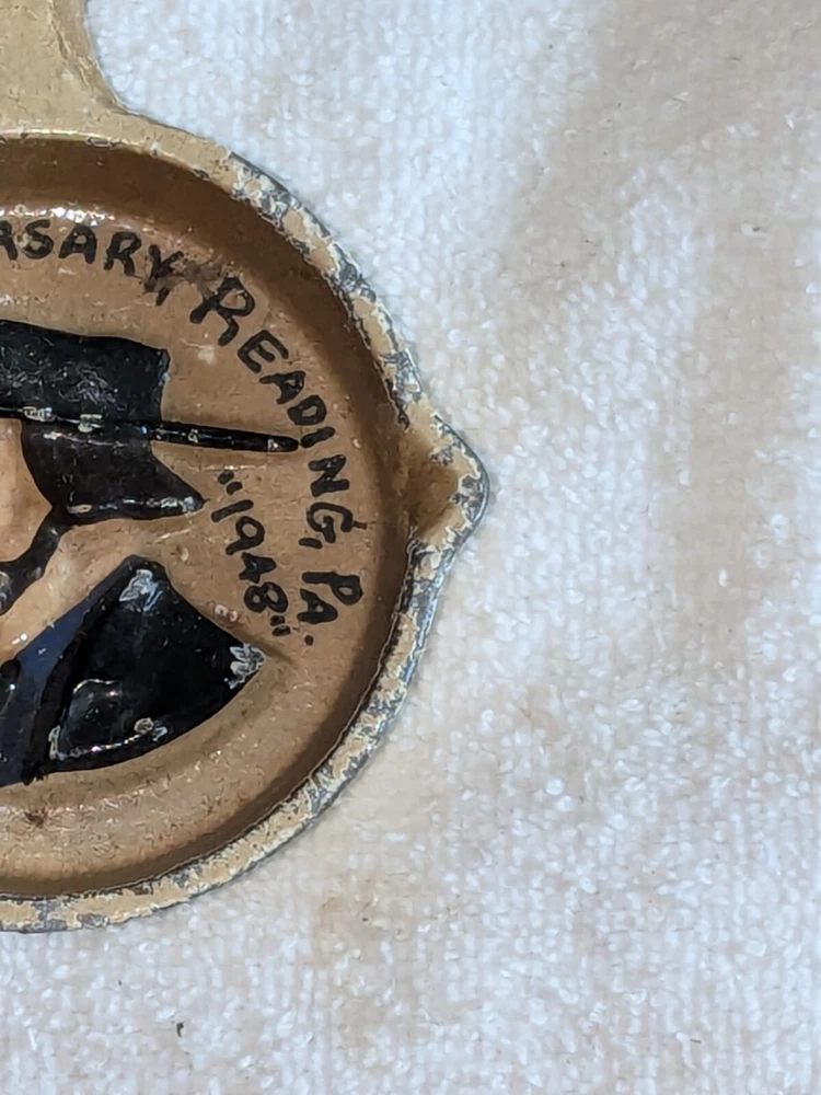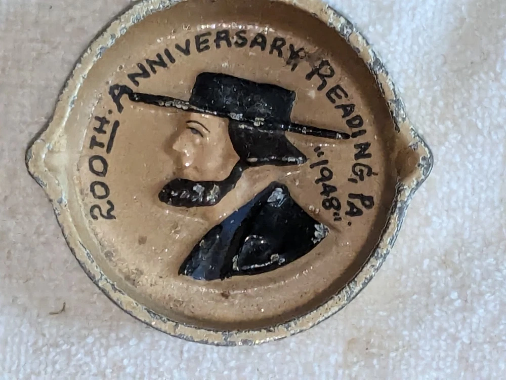 The photos show everything. You can see the date of "1948", celebrating the 200th anniversary of Reading, Pennsylvania. I believe the 3D bust you see in the center is William Penn, however, I am not 100% sure of that, so that is not a guarantee. This little souvenir is made of cast iron and shows wear. A nice vintage collectible, approximately 2.75 inches across the top. Not much more to add to the photos, they are the description and they show the condition. Please use the zoom feature and ask any questions you may have.