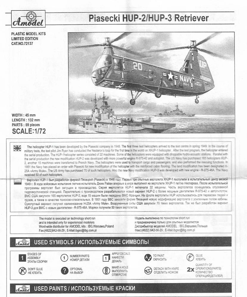 Plastic model kit High-quality details. Scale: 1:72 High-quality details. Manufacturer: AMODEL (Ukraine) Country/Region of Manufacture: Ukraine Composition: Plastic Model Kit Material: Plastic Paint: Unpainted, Unassembled, Kit do not contain paints and glue. Condition: New in Box Features: Kit Helicopter scale model Model length, mm: 132 The kit includes: 59 plastic parts decal (sticker) 1 frame is made of transparent plastic (cabin lamp) scheme for coloring the model detailed instructions in English and Russian Glue, paint not included The helicopter HUP-1 has been developed by the Piasecki company 1948. Parallel with the serial production the new modification HUP-2 was developed with more powerful engine R-975-42 and autopilot. The US NAVY has purchased 165 helicopters HUP-2, another 15 machines were transferred to French NAVY. The helicopters were used to transport cargo and passengers, and also performed the rescuing functions. Quality set, simple assembly. Suitable for experienced modelers, as well as for beginners. Due to the use of modern production technologies, all the details of the model fit perfectly, thanks to this, you can get an excellent result with minimal effort. ----------- This is a plastic model kit. Assembly and painting is required. Paint and glue is NOT included. Item Type: Scale model kit Commodity Attribute: Assembly The model is a plastic assembly model and needs to be assembled and painted by yourself You need an extra purchase of the glue, paint and so on!