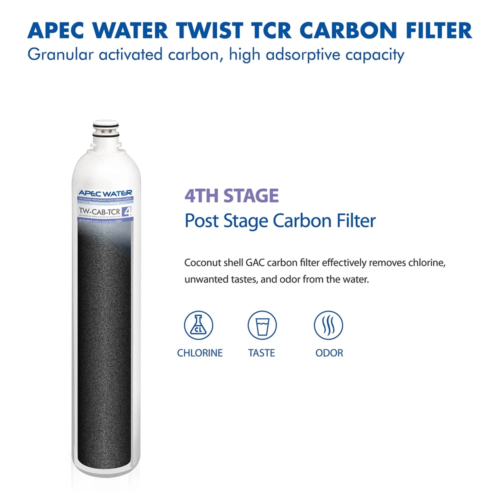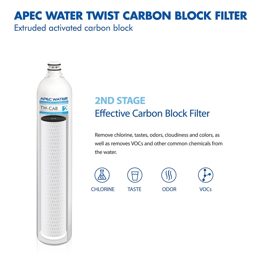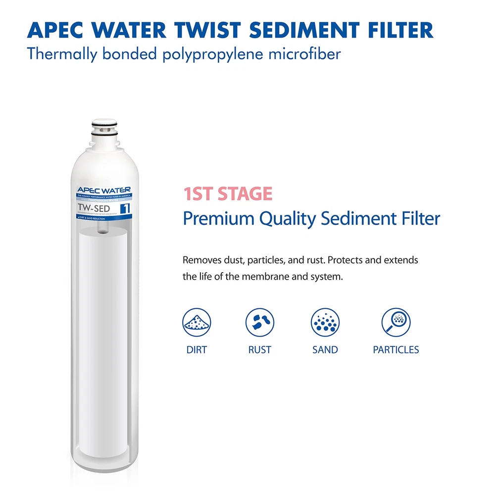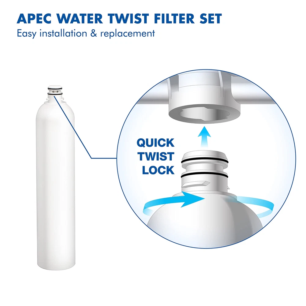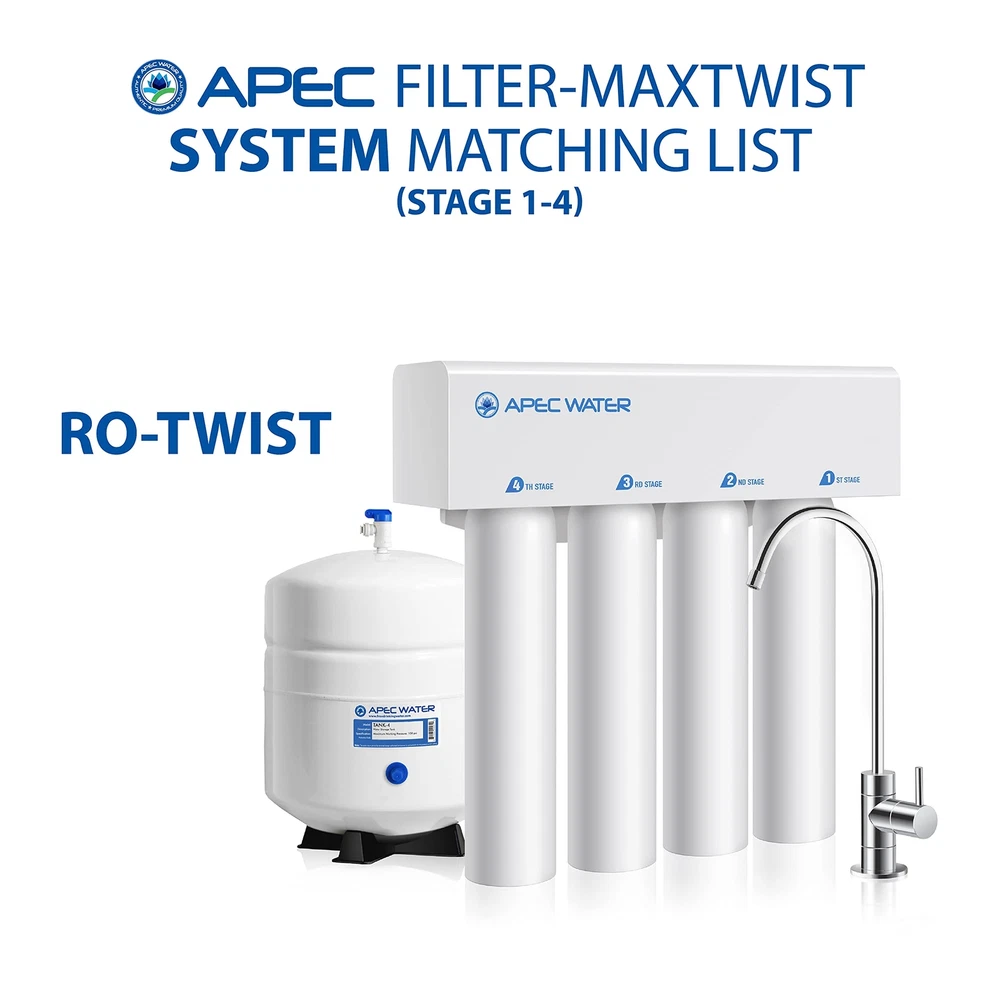 APEC supreme complete filter set FILTER-MAXTWIST is made with high quality filtration components to protect and prolong the lifespan of your reverse osmosis system. The twist-lock design allows easy and secure filter change-out. Just twist and replace your water filter in a snap. Premium quality filter set lasts over 6 months for high performance contaminant removal, while the RO membrane and post-carbon filter last 12-24 months. Compatible with APEC twist-lock RO system. 1st stage sediment filter removes dust, particles, and rust. Protects and extends the life of the membrane and system. Recommend changing every 6-12 months. 2nd stage carbon filter removes chlorine, tastes, odors, cloudiness and colors, as well as removes VOCs and other common chemicals from the water. Protect thin film membrane. Recommend changing every 6-12 months. 3rd stage reverse osmosis membrane removes up to 99% of total dissolved solids and other water contaminants such as arsenic, lead, fluoride, chromium, radium and much more. Recommend changing every 12-24 months. 4th stage post-carbon filter removes any possible residual and taste. Recommend changing every 12-24 months. High capacity 4-stage complete filter set, compatible with APEC twist-lock RO system Includes (1) sediment filter (1) carbon block filter (1) reverse osmosis membrane and (1) post-carbon filter Removes up 99% of all contaminants for the best drinking water quality possible Pre-filters last 6-12 months for high performance contaminant removal; the 75 GPD membrane and post-carbon filter last 12-24 months Featured twist-lock design allows easy and secure filter change out